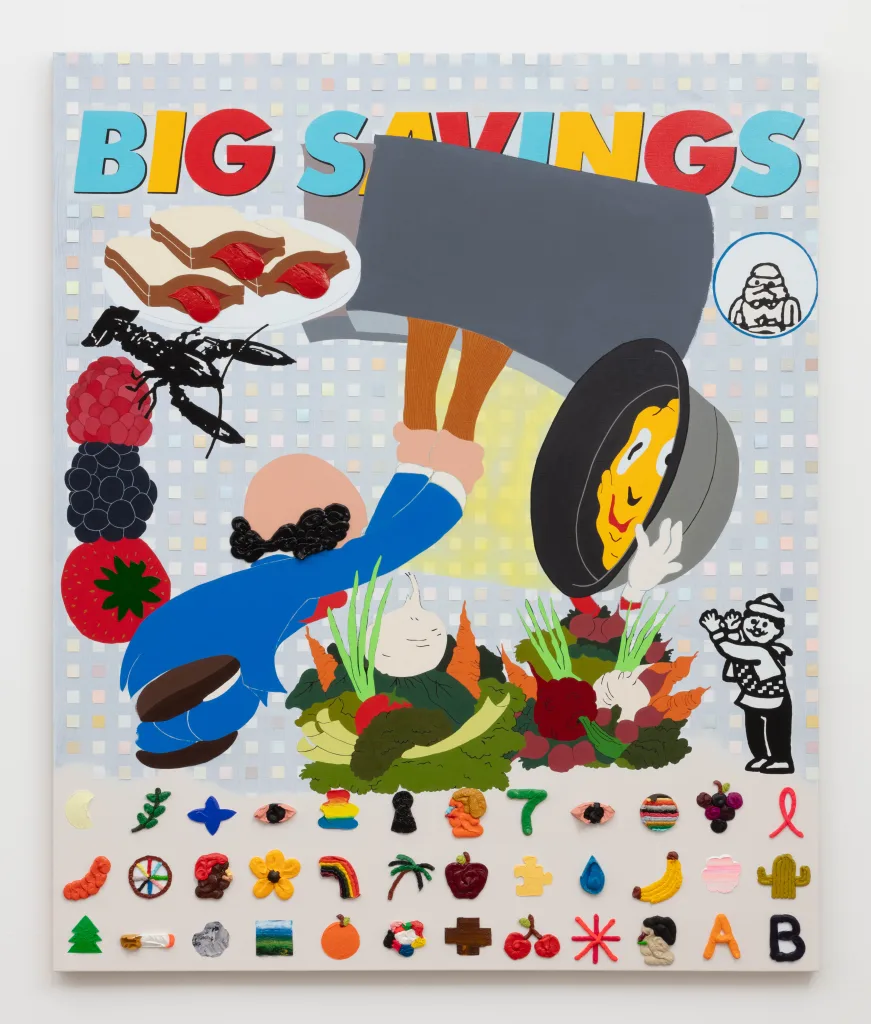 Adam Beris’ Kielbasa (2024) was almost called Liverwurst—the alleged meat sliding out of sandwiches in the upper left corner of the painting. An illustration of a lobster, a stack of berries, piles of veggies, a pot containing a doughy countenance, and slot machine-inspired glyphs of grapes, cherries, a banana, and an orange—all float under a proclamation of BIG SAVINGS. Perhaps the most food-focused painting in the exhibition, Beris notes that some of his source materials were local midwestern advertisements, often featuring awkward drawings and the allure of clipping coupons to save money.
