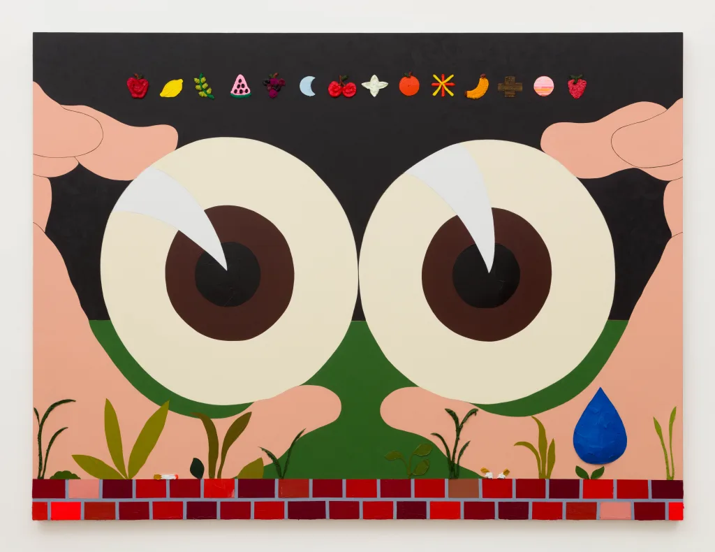 Perhaps the most pared down of the large paintings in Adam Beris’ exhibition, Fantastic Best Wishes, Lemon Thief (2024), features a pair of hands holding a pair of eyeballs. Set in a landscape at night, the top of a brick wall frames the bottom edge of the painting, with sprigs of thickly painted weeds growing up through the cracks. A row of glyphs from Beris’ long-standing series of grid paintings hovers above figure and foreground. While open to interpretation, Beris often cites slot machines as inspiration for his grid paintings—"when you don’t have a winning hand, there is a row of symbols staring back at you that don’t quite make sense.”