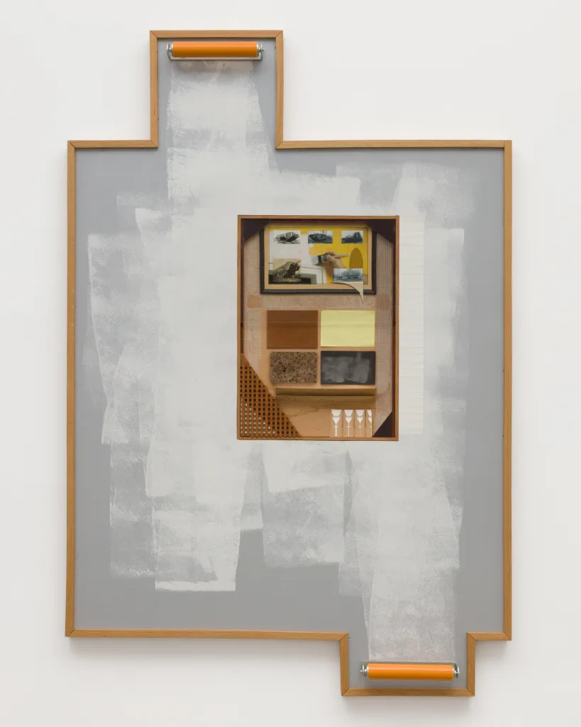 AJ Collins’ sculptural panel, Redecorator (2025), composed of materials ranging from plywood, cork, and steel to glass, vinyl, and Killz primer, presents a deliberately flattened surface painted in striated layers—an application that mimics the mechanical gesture of tank treads or bulldozer tracks across a razed field. Echoing both the devastated terrains of World War I's no man’s land and the sanitized expanses of suburban development, the work invokes a tense duality between destruction and construction. Small embedded “truth windows” punctuate the surface, revealing a gridded assemblage of domestic and industrial materials—window seals, hardwood samples, and archival tank imagery—offering a partial x-ray of the wall-as-threshold and calling into question the stability of boundaries, whether architectural, historical, or psychological.