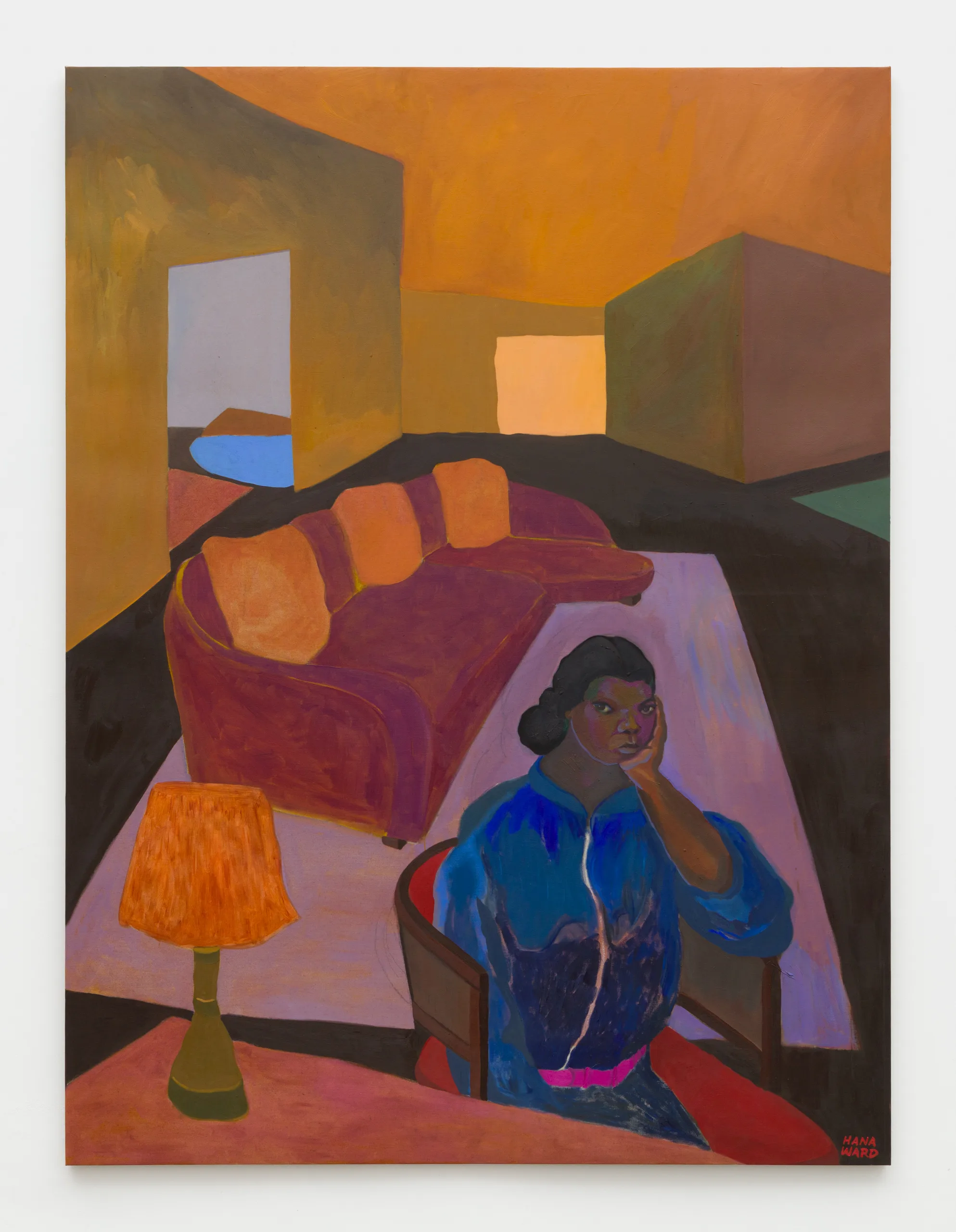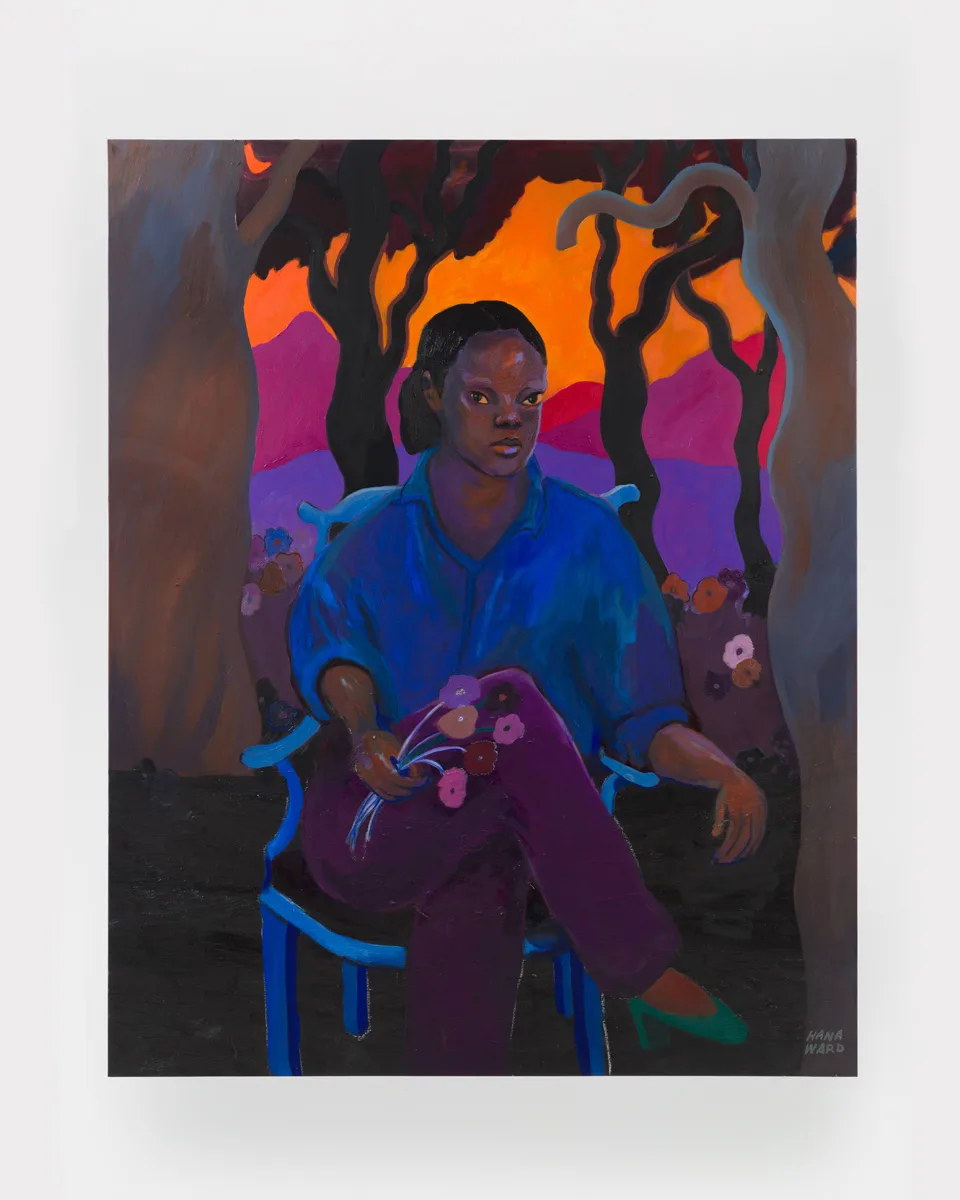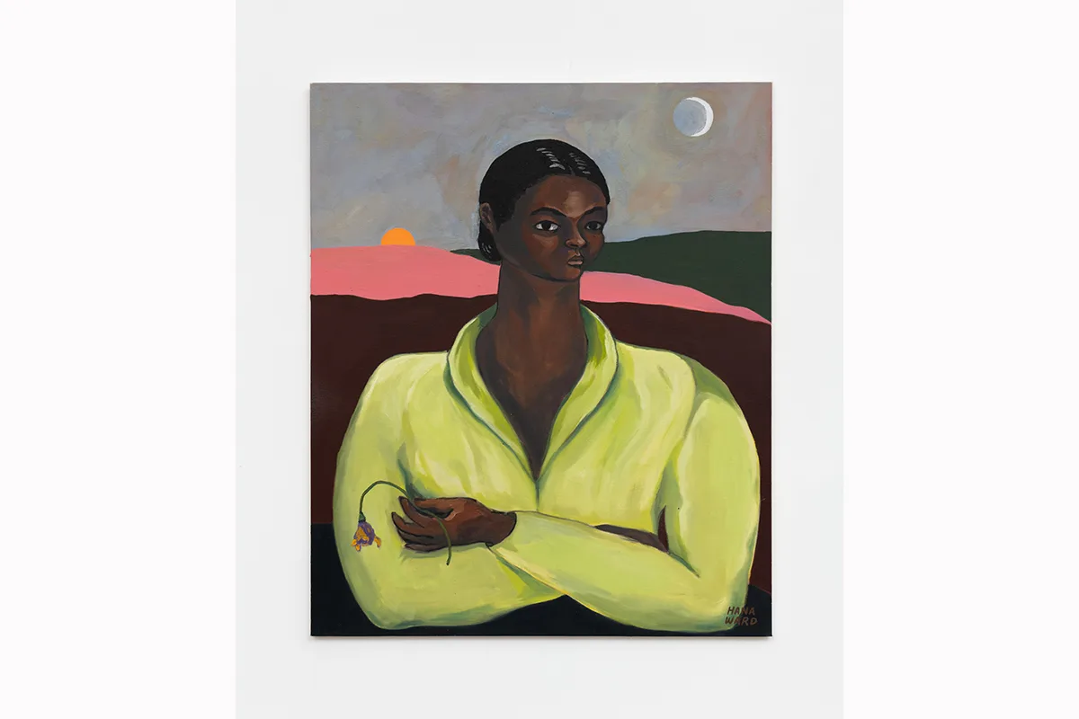 Hana Ward makes paintings and ceramic works that explore themes of identity, introspection, and transformation. Appearing both ethereal and visceral, Ward weaves together moods, motives, and narratives to depict Black and Brown feminine figures who reflect and dream, creating their sovereign worlds from the inside out. These multitudinous visions of unfolding self-actualizations are sometimes sheltered in the solitude of domestic space and other times liberated into landscapes. Influenced by anticolonial histories, spiritual texts, and cycles of the natural world, as well as the canon of art history, Ward’s work excavates inner dimensions to discover a world where one’s sovereignty is in the here and now.