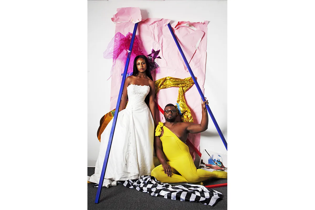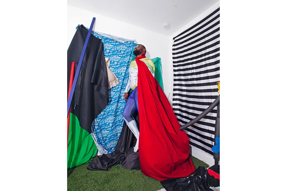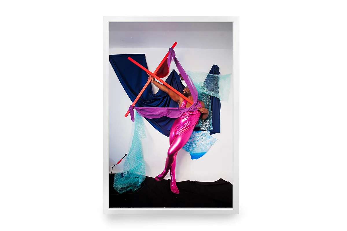 Rakeem Cunningham uses photography, collage, installation, and video to explore the nuances of queer black experience. Cunningham photographs himself and others playing and posing in the studio informed and surrounded by a multiverse of niche subcultures. Each portrait is a declaration of subjectivity and existence—proof of self-validation and an ongoing healing journey. Cunningham appropriates poses from a cascade of emotionally charged scenes sourced from manga, anime, and narrative role-playing video games with ecstatic flourishes inspired by the unrehearsed choreography of church-goers as they “catch the holy ghost.” These reperformances are akin to cosplay, a physical embodiment of fictional protagonists, or headcanon, a fan's personal, idiosyncratic interpretation of a fictional canon.