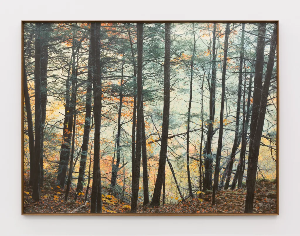 Benjamin Langford’s vast Twilight (2024) was originally an image shot in the Catskill Mountains, on a hike adjoining a community known as Twilight. I am interested in referencing the Hudson River school, who often painted landscapes of that region, and the motif of placing rugged, gnarled woods as a foreground to a more pastoral grand landscape that beckons the viewer. In this work, the gnarled woods deny access to the pastoral landscape– the landscape feels more like a stage backdrop with the chaotic interweaving of branches dominating the entire surface of the image The trees create a sense that the viewer is almost barricaded inside them– I find this feeling comforting– the idea of being enveloped by dark, chaotic nature– it’s a version of the sublime to me, but almost inverted, no longer about vastness but about being held by a nature that is cold, shadowy, and dark. –Benjamin Langford