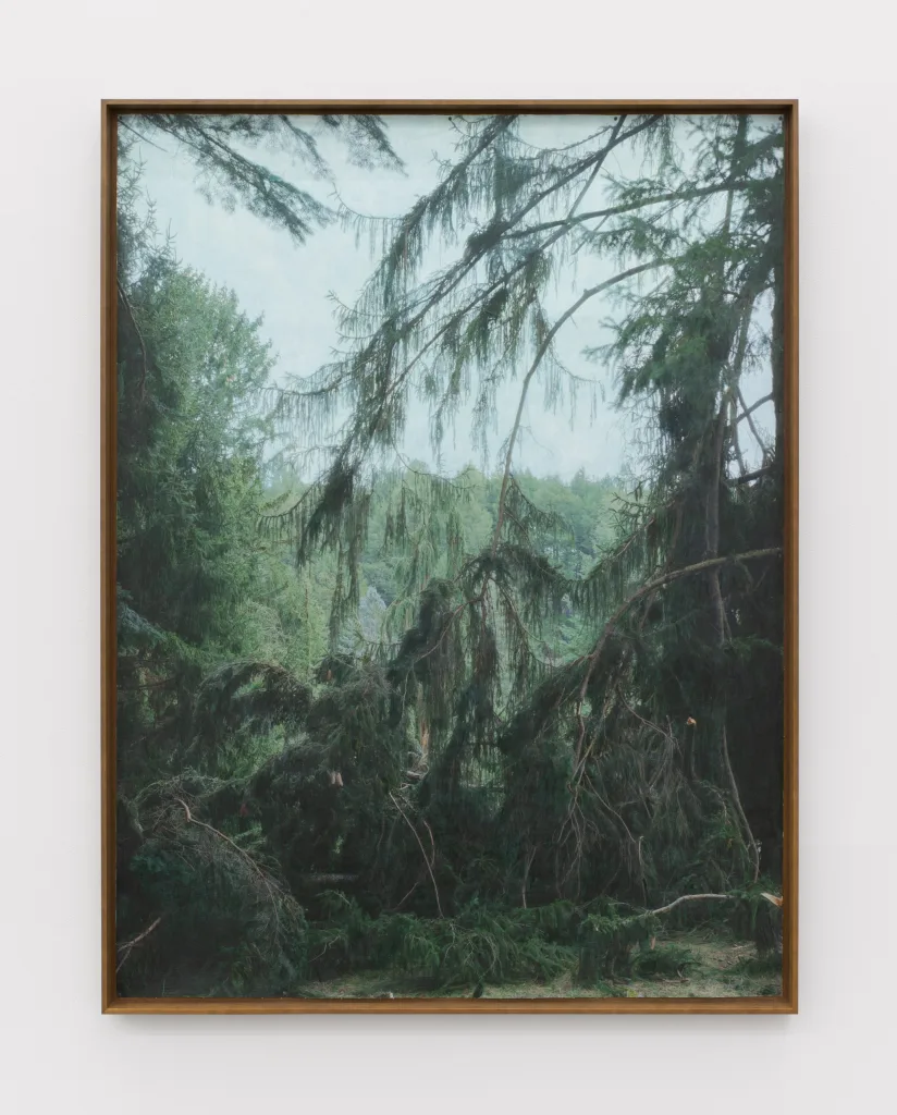 Benjamin Langford photographed the original image in Weeping Spruce (2024) in an arboretum after a storm had pulled down many of the trees. The unpredictability of a storm upended the otherwise manicured order of the garden. “I think of this as nature pulling back the curtain on our attempts to define and experience it,” says Langford. “It reveals itself to be chaotic and uncontrollable.” For me, the interesting tension in this piece is the contrast between the airiness of these weeping branches, and the chaotic, dark piling of fallen branches that obstruct the bottom half of the composition. I think this work plays into this kind of fantasy of falling into and being overwhelmed by the “Yin” of nature– something dark, chaotic, and unknowable swallowing the viewer. Like Twilight (2024), I see this piece as having a stage-like quality. The background feels bright and pastoral, like a painted backdrop, which contrasts with the dark and chaotic movement of gnarled branches in the foreground The branches in the top half of the image have such a languid quality– they seem to bleed downward across the sky in a very delicate way– reminiscent of lacey curtains or decorative motifs, in an almost Rococo or Baroque way. –Benjamin Langford