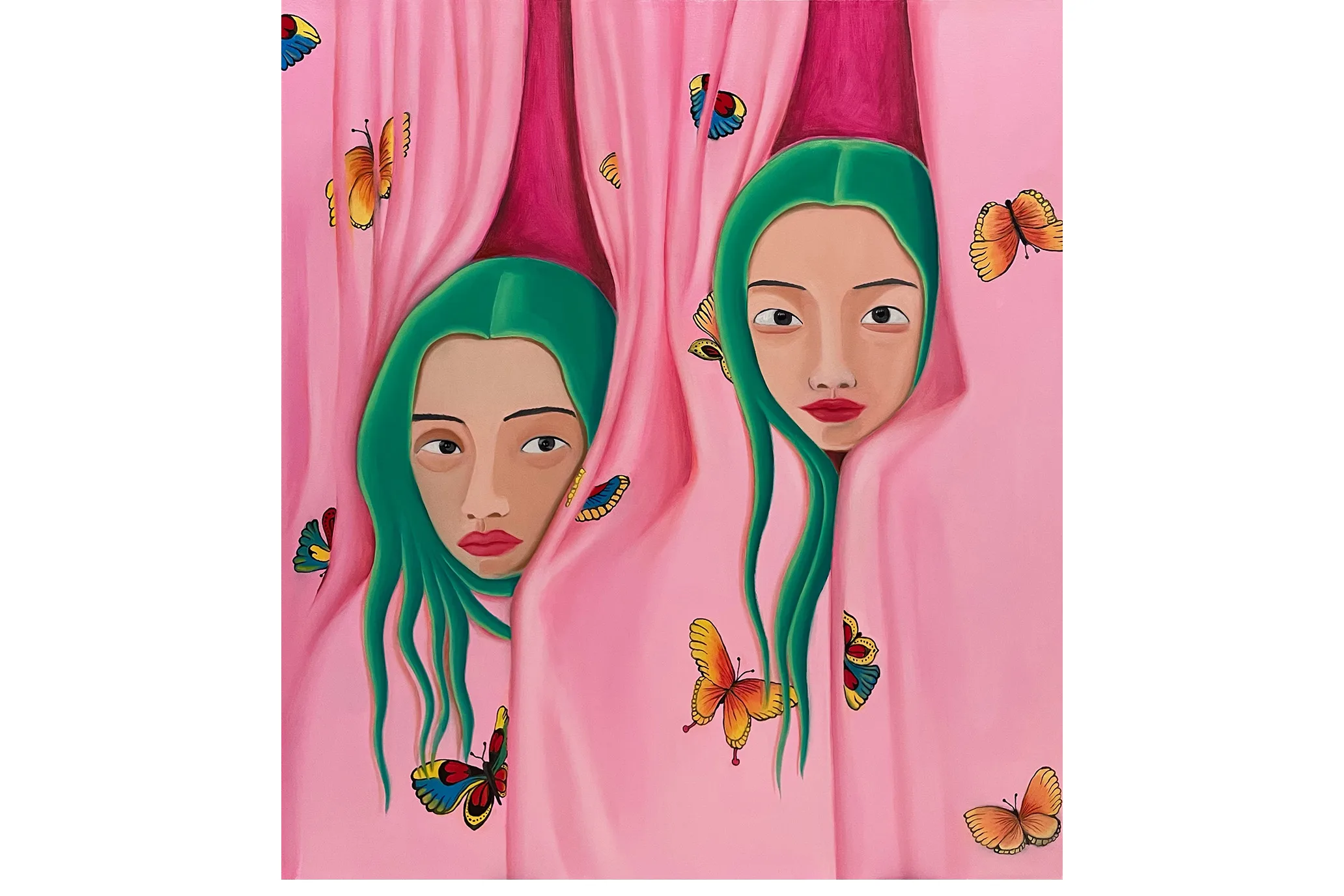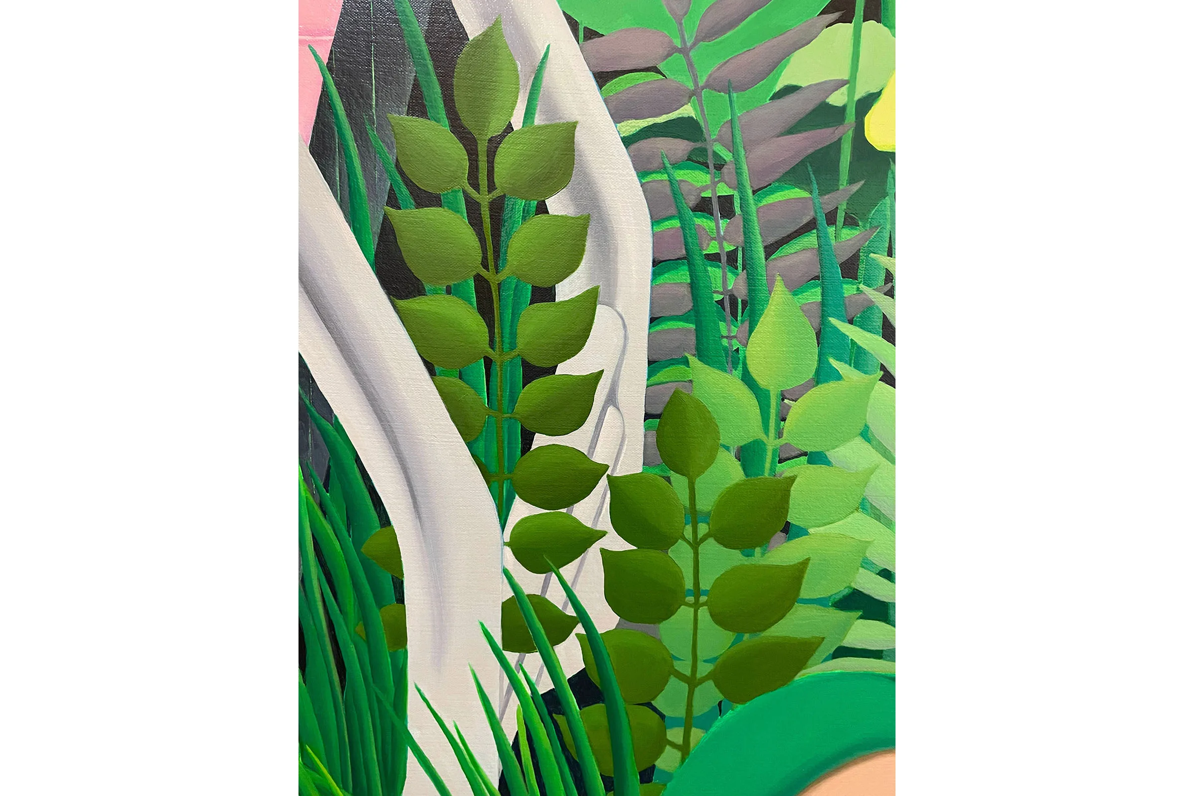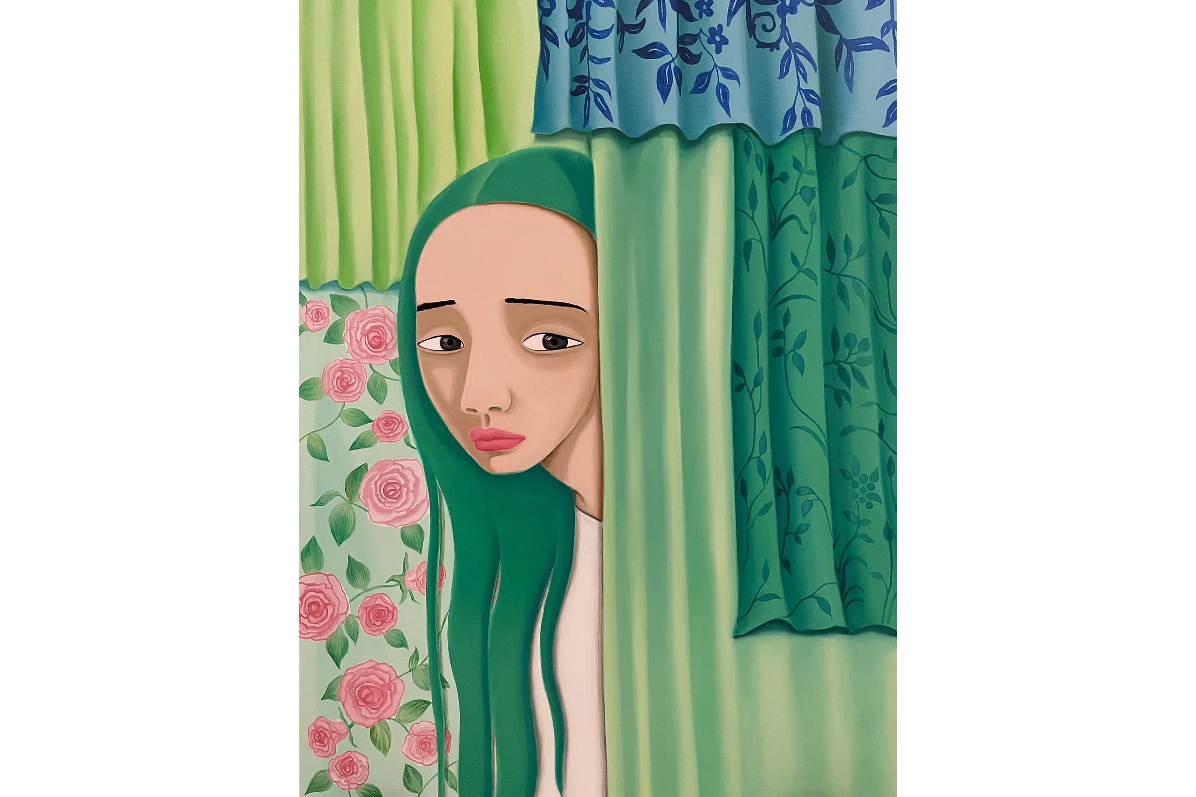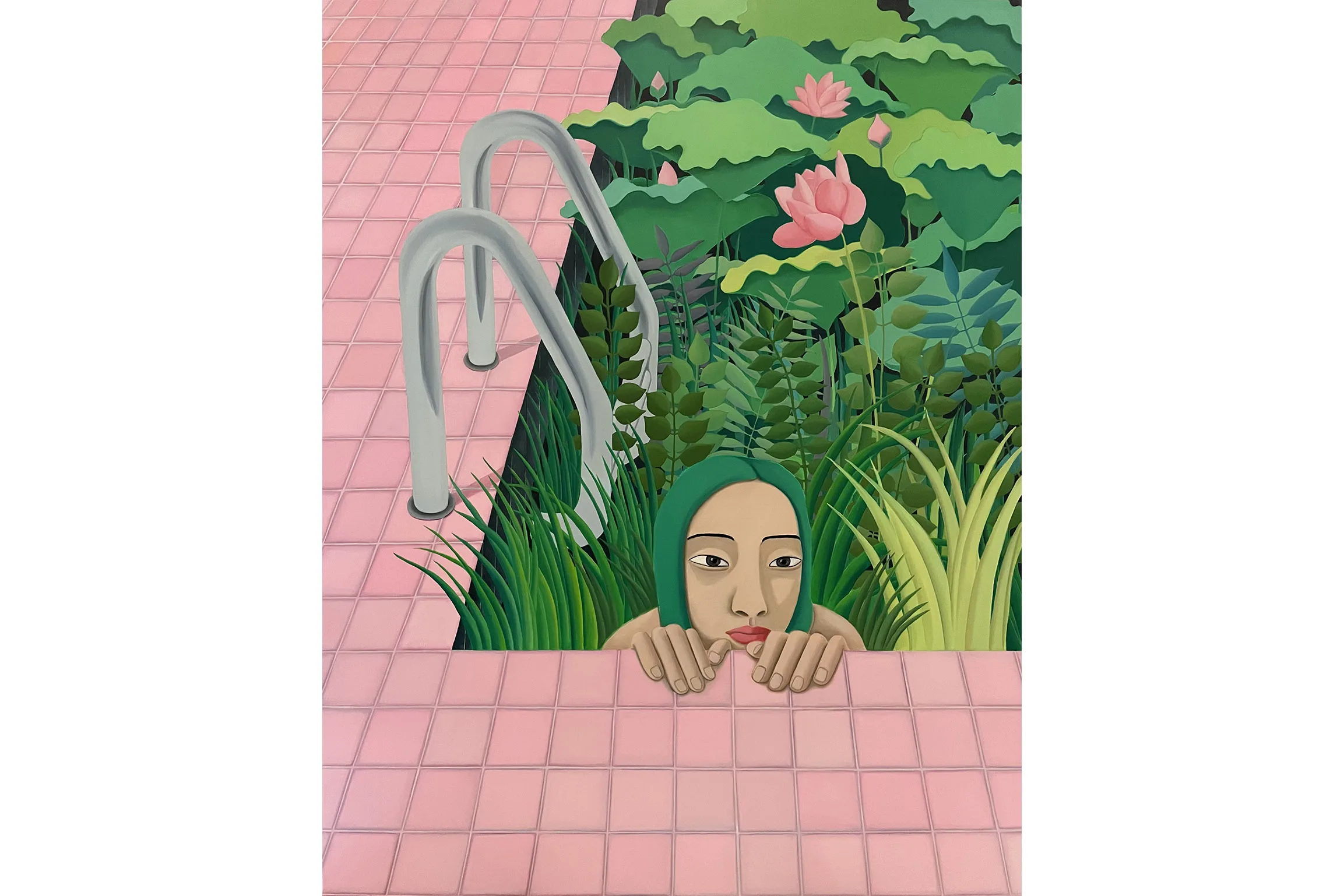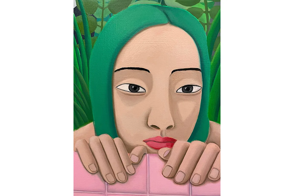 Visually combining daydream bright hues with allusions to personal experiences and generational trauma, Lee creates scenes of self-referential portraiture that seek to question visibility and invisibility in Korean diaspora. Drawing from a background in commercial art and design, the vibrant pinks, greens, and blues are carefully placed as Lee translates intimate memories and histories into compressed metaphorical spaces. Lee’s figures can be found in pools full of plants, peering at themselves in bathroom mirrors, peeking through openings in fabric, and behind fences—sets that help articulate their pensive, shy, curious, or cautious moods. Inspired by her defiant and creative matriarchal lineage—Lee’s grandmother was a Shaman, her aunt was a Buddhist priest, and her mother is a photographer and a gardener—Lee’s paintings embrace ritualistic remedies for healing.