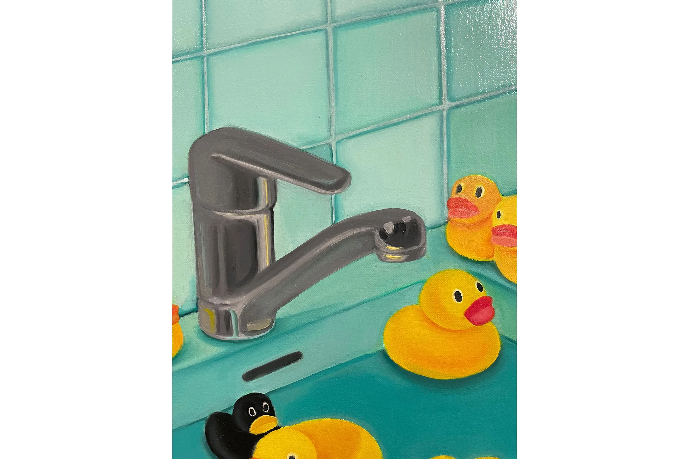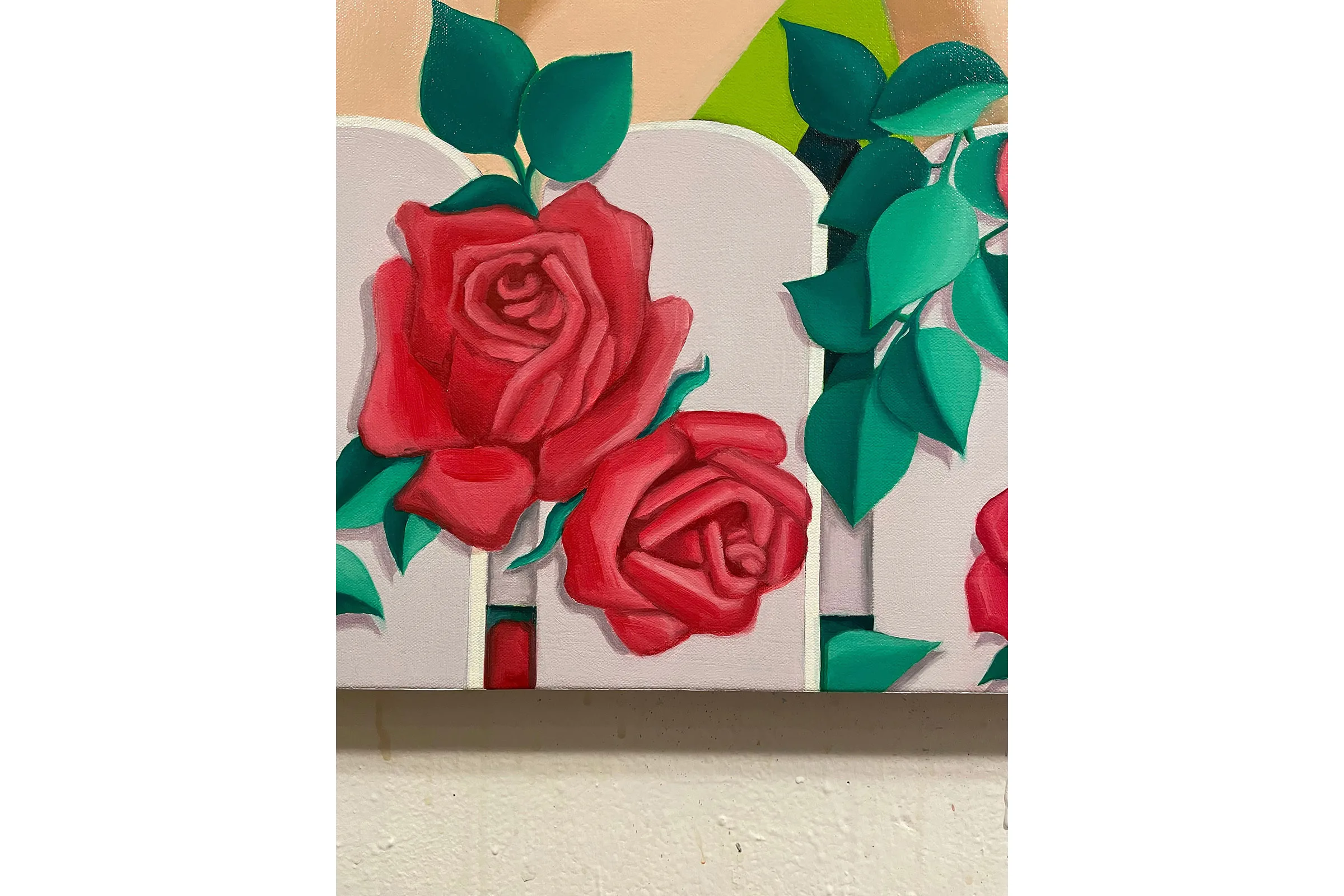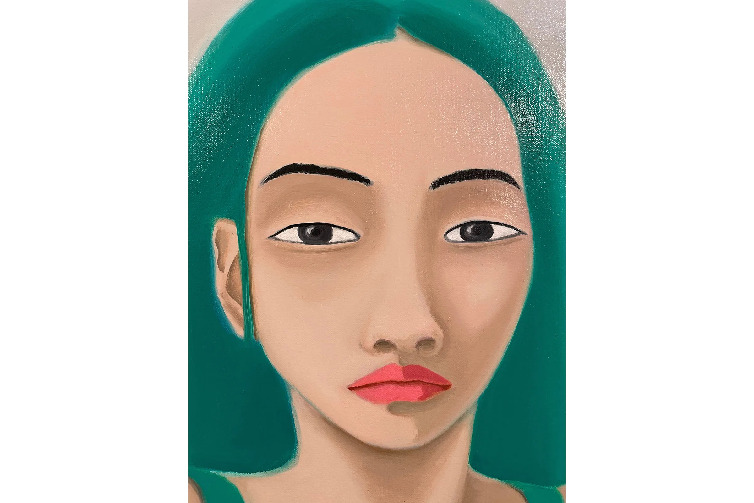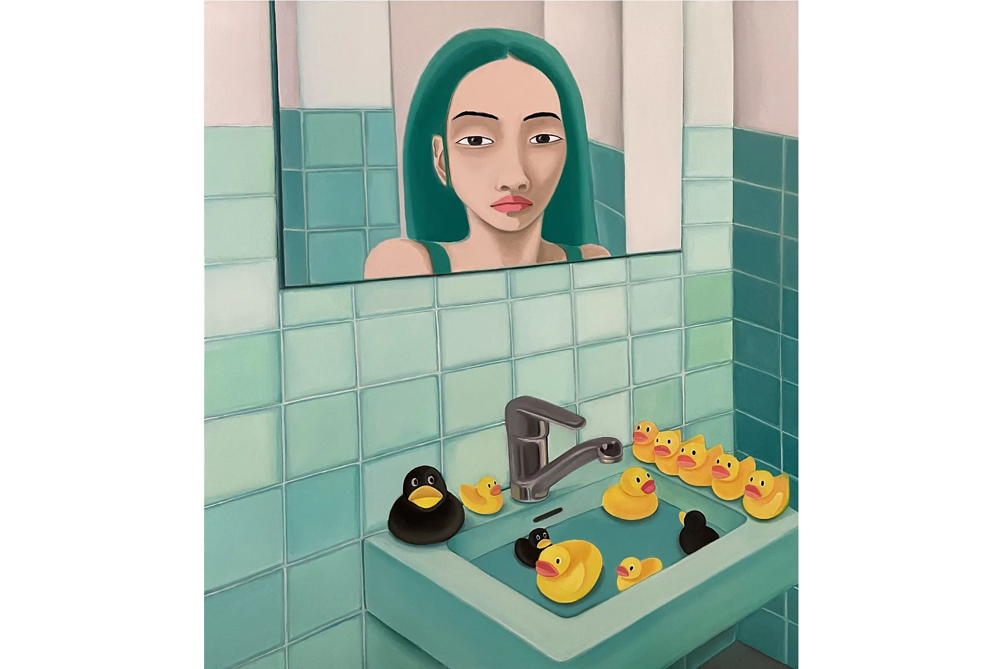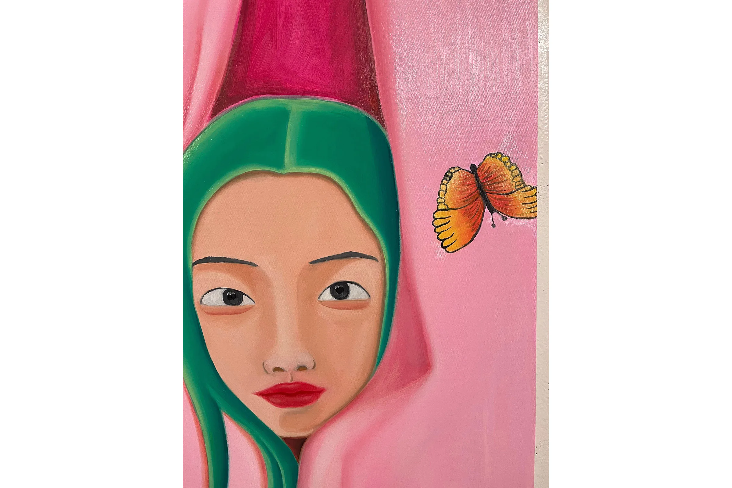 Visually combining daydream bright hues with allusions to personal experiences and generational trauma, Lee creates scenes of self-referential portraiture that seek to question visibility and invisibility in Korean diaspora. Drawing from a background in commercial art and design, the vibrant pinks, greens, and blues are carefully placed as Lee translates intimate memories and histories into compressed metaphorical spaces. Lee’s figures can be found in pools full of plants, peering at themselves in bathroom mirrors, peeking through openings in fabric, and behind fences—sets that help articulate their pensive, shy, curious, or cautious moods. Inspired by her defiant and creative matriarchal lineage—Lee’s grandmother was a Shaman, her aunt was a Buddhist priest, and her mother is a photographer and a gardener—Lee’s paintings embrace ritualistic remedies for healing.