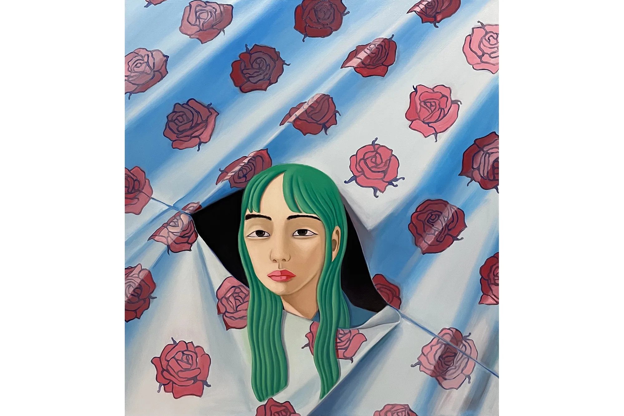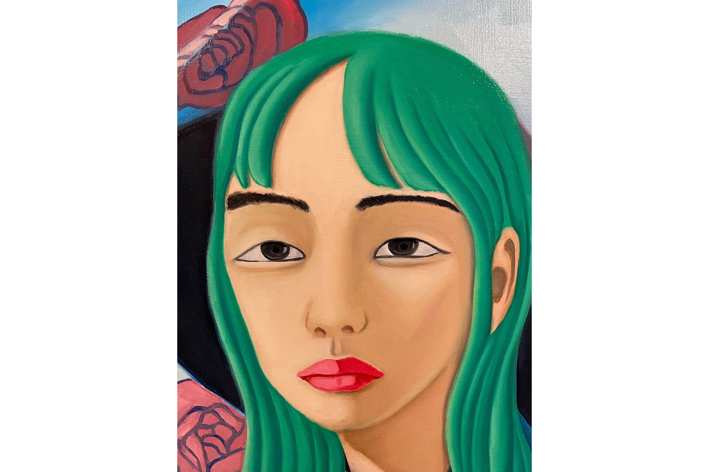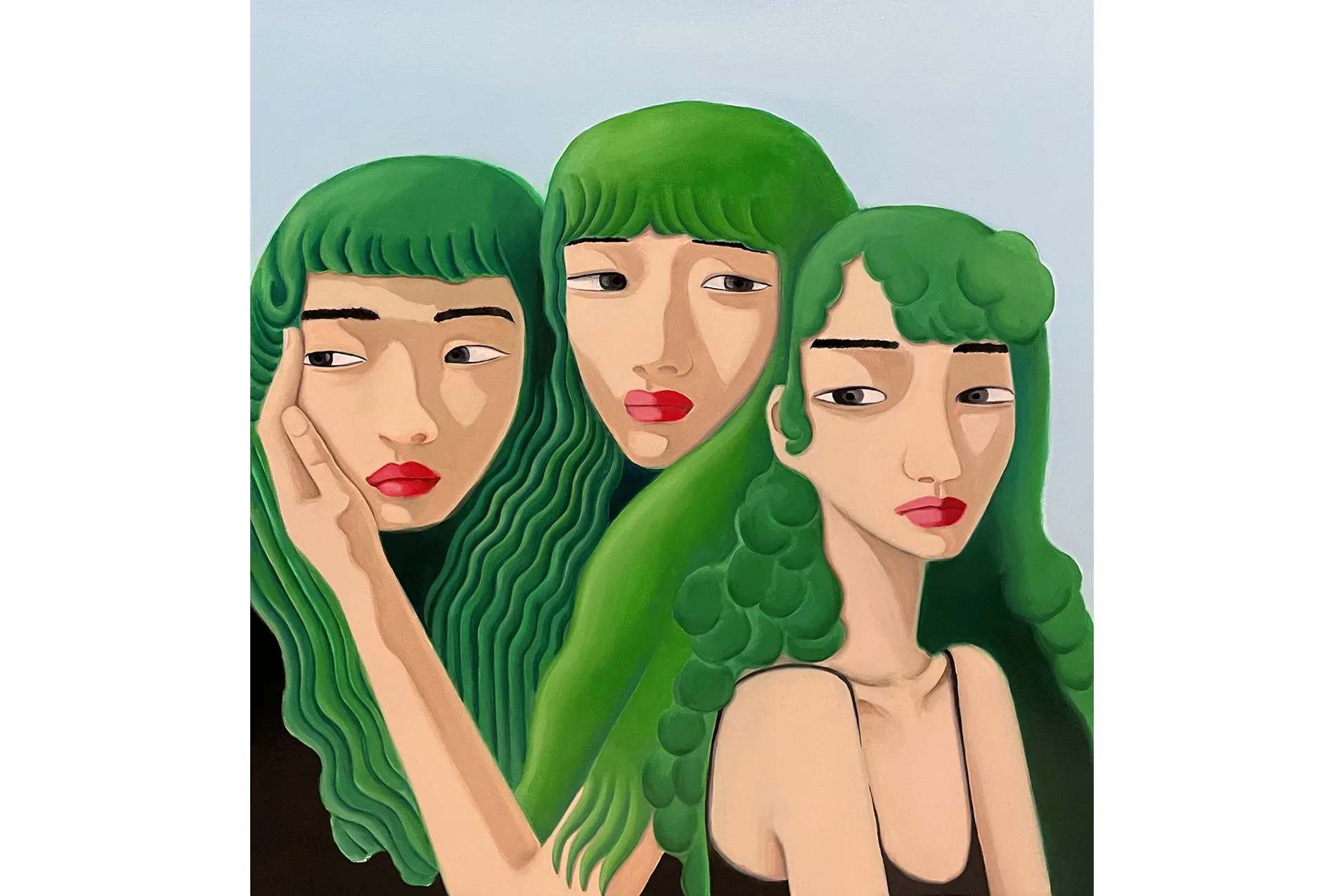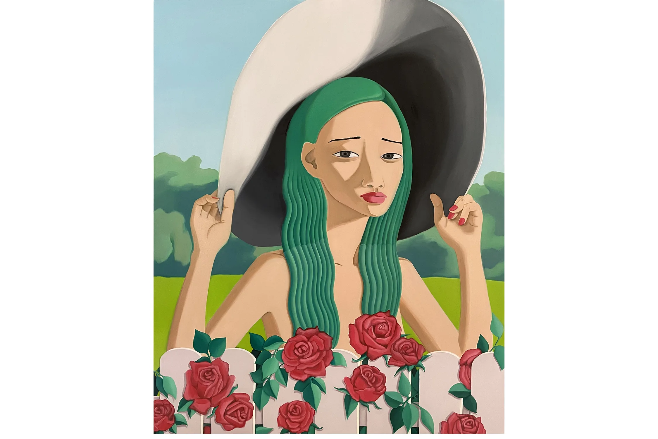 In domestic scenes, manicured landscapes, and imagined non-spaces Lee mixes elements of fantasy and realism to create introspective interpretations of her personal history. The figures in Best Friends (2021) huddle face to face, a hand gently cupping a cheek, each gesture exuding a necessary tenderness. Lee adorns her figures with elements of the natural world—an acknowledgement of traditional Korean femininity—though Lee’s plants and flowers are often metaphors for submission and docility. Green hair and flowing, curled locks draw direct parallels to patterns and colors found in the environment, while their voluminous, tangled forms reference verdant mountain ranges. Roses appear and reappear as markers of innocence and beauty, framing the subjects which hold them.