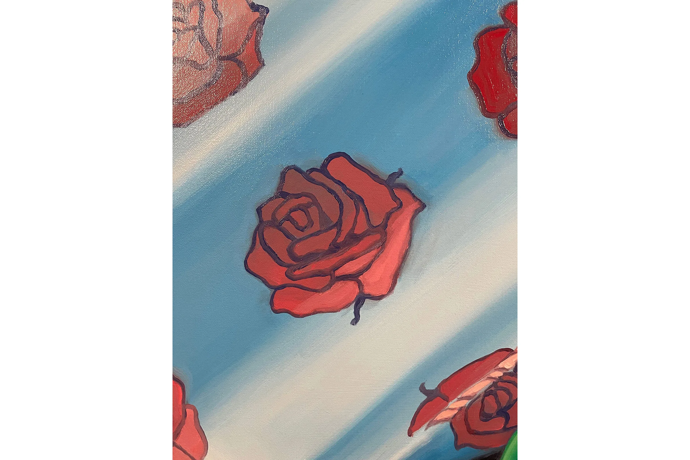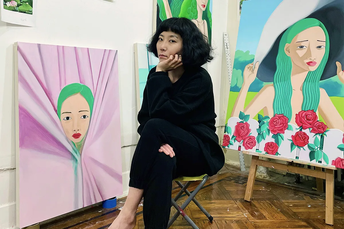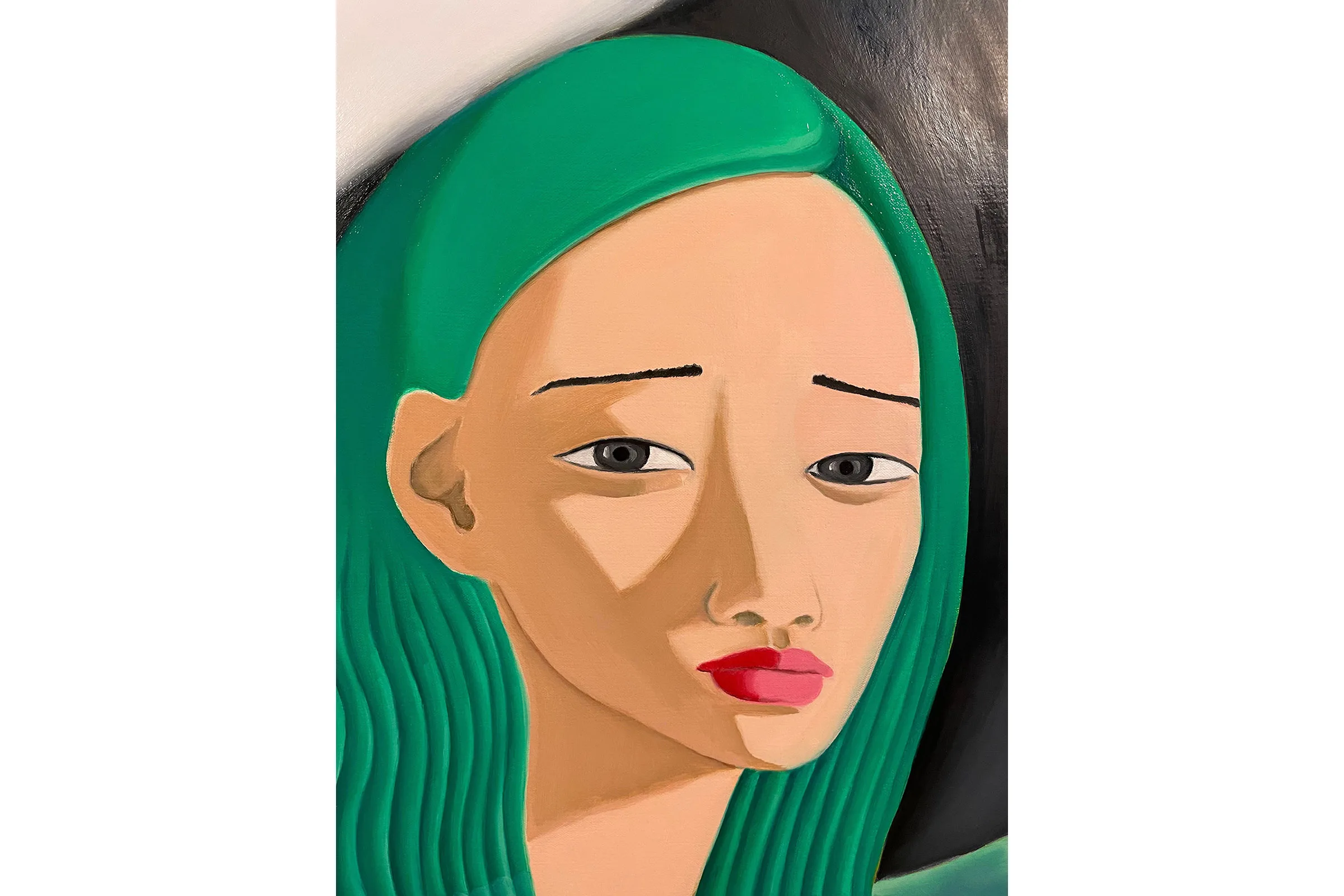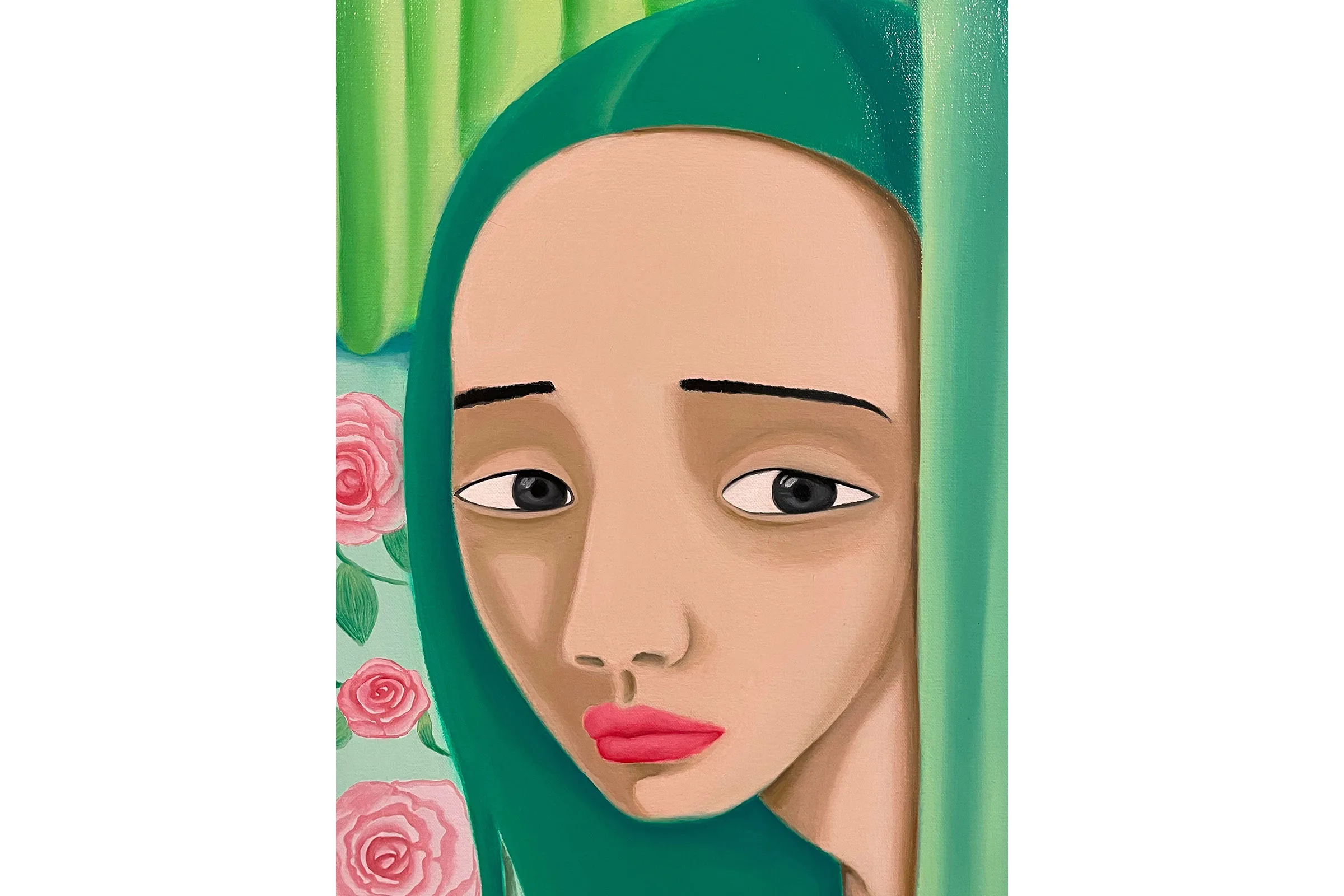 In domestic scenes, manicured landscapes, and imagined non-spaces Lee mixes elements of fantasy and realism to create introspective interpretations of her personal history. The figures in Best Friends (2021) huddle face to face, a hand gently cupping a cheek, each gesture exuding a necessary tenderness. Lee adorns her figures with elements of the natural world—an acknowledgement of traditional Korean femininity—though Lee’s plants and flowers are often metaphors for submission and docility. Green hair and flowing, curled locks draw direct parallels to patterns and colors found in the environment, while their voluminous, tangled forms reference verdant mountain ranges. Roses appear and reappear as markers of innocence and beauty, framing the subjects which hold them.