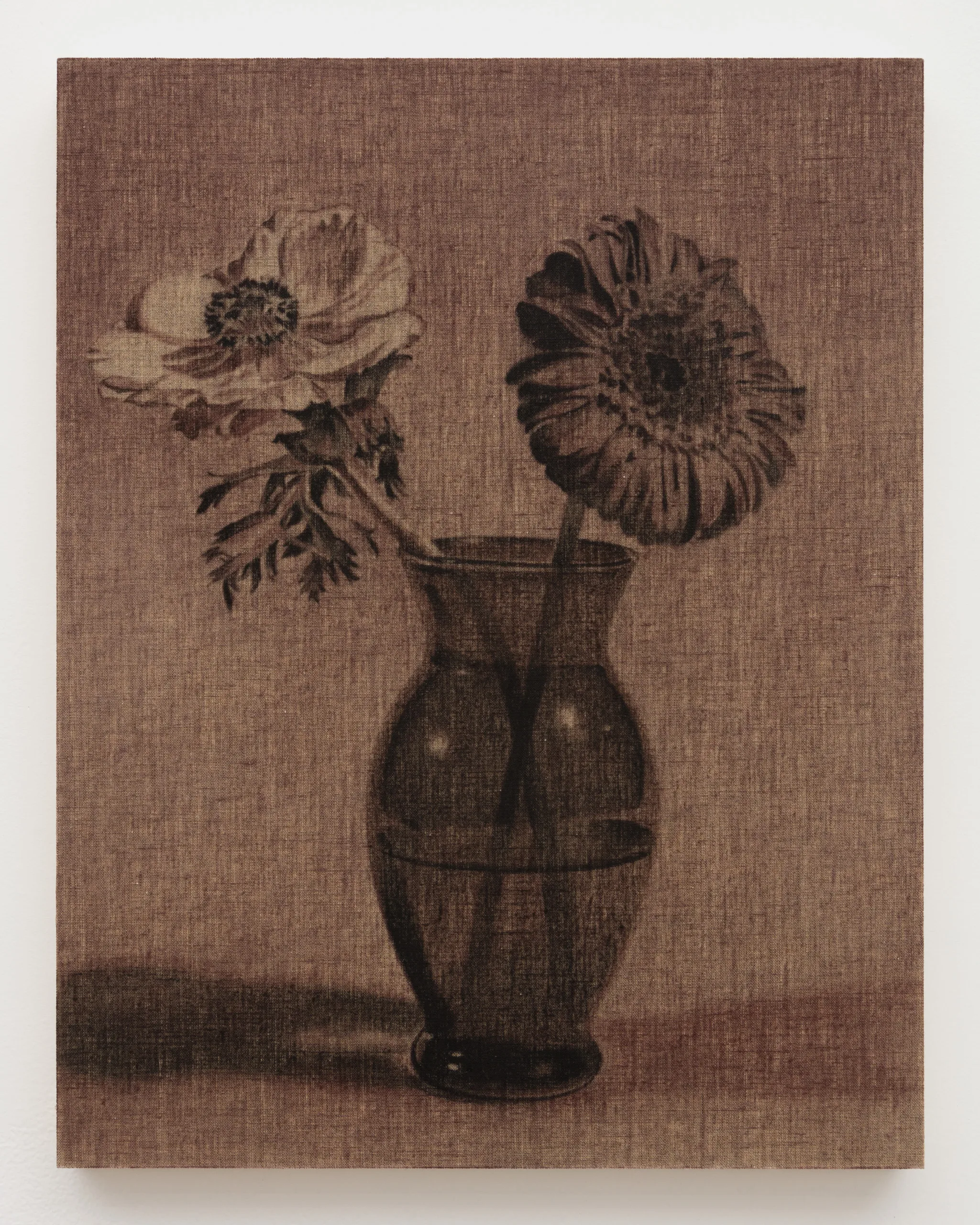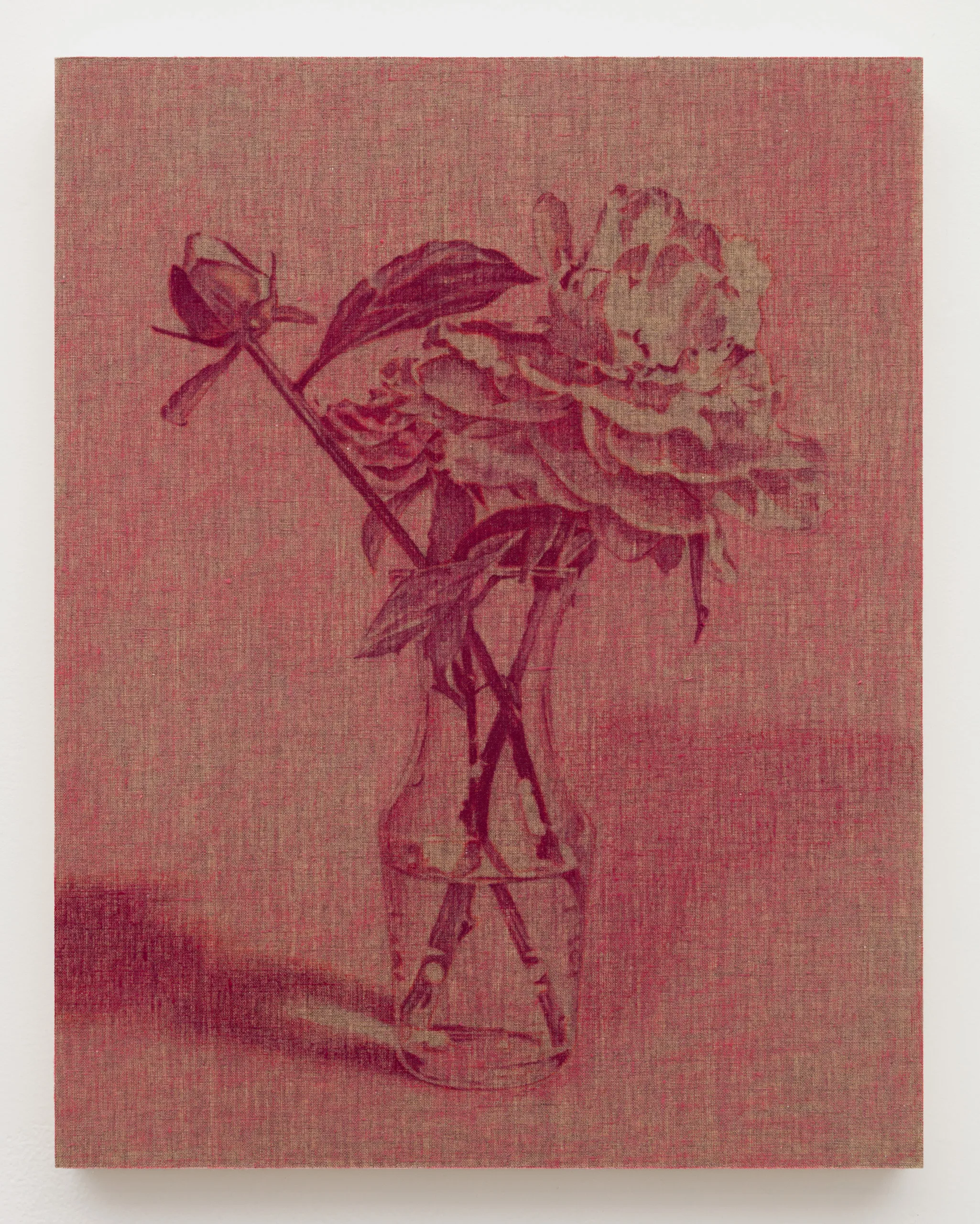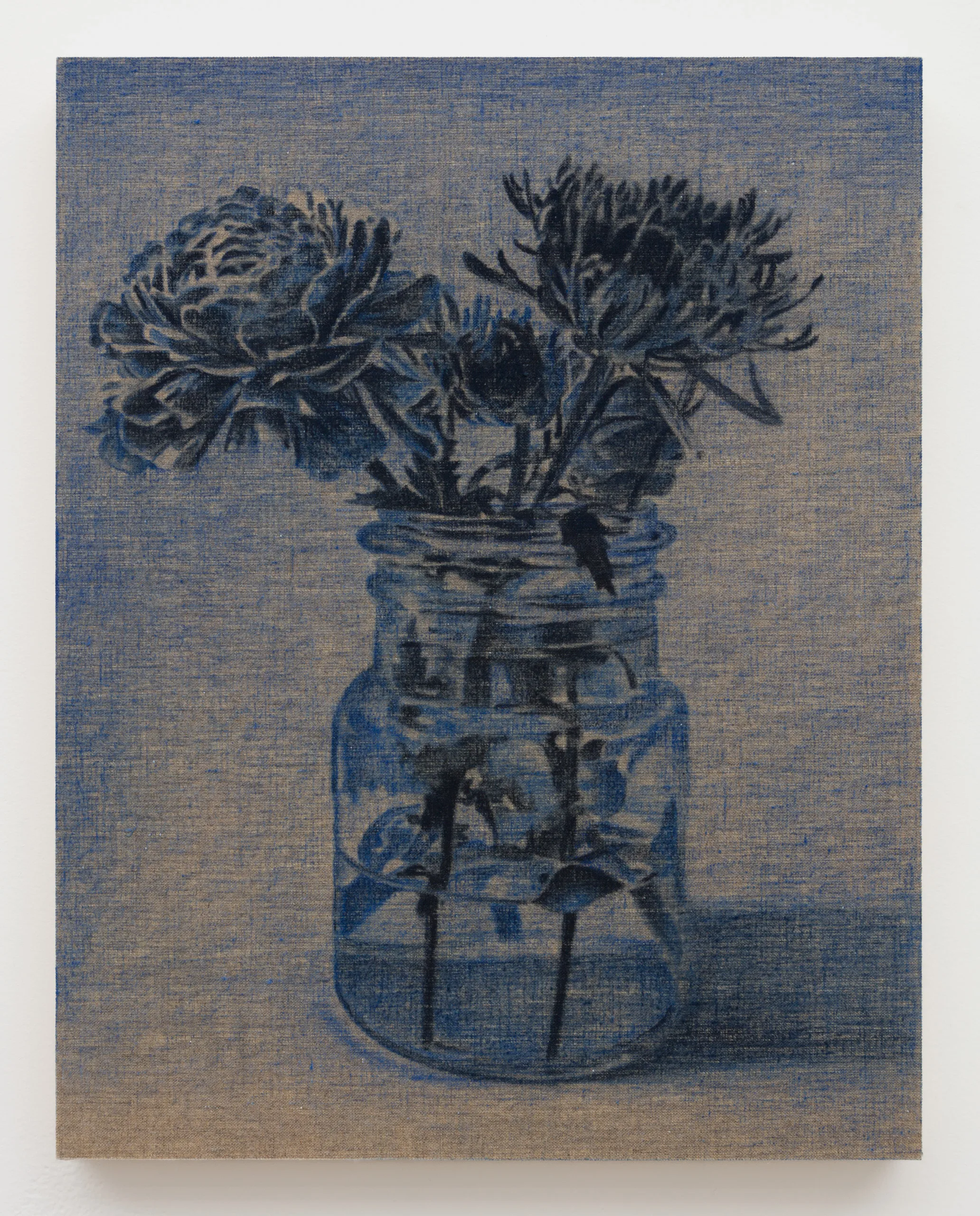 Andy Mister’s paintings of cut flowers in water-filled vessels merge the ephemerality of traditional drawing techniques with the physicality of painting. Mister’s paintings are intimate, both small in stature and also offering insight into the personal nature of the work—Mister recently moved with his wife and their two young children to a town near the Susquehanna River in upstate New York, a change of pace from city life. Immersed in the outdoors, Mister watches his children navigate the natural world with curiosity and joy. While previous paintings relied on found imagery, the paintings in Sonnets are all based on real flower arrangements made by all members of the Mister family. The artist’s kids choose flowers at the local farmer’s market and place them around the house in whatever vessel they can find—a jam jar used for turpentine, a glass left behind, or a small vase bought secondhand.