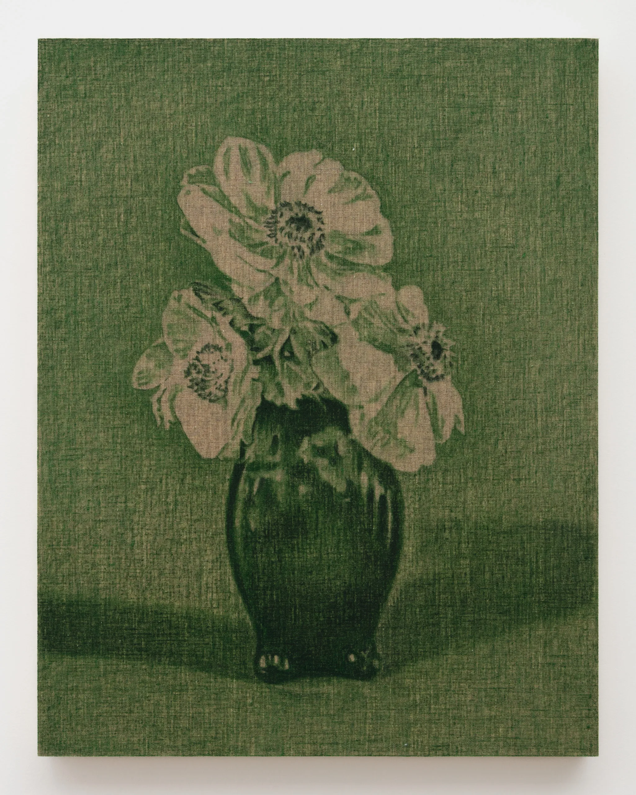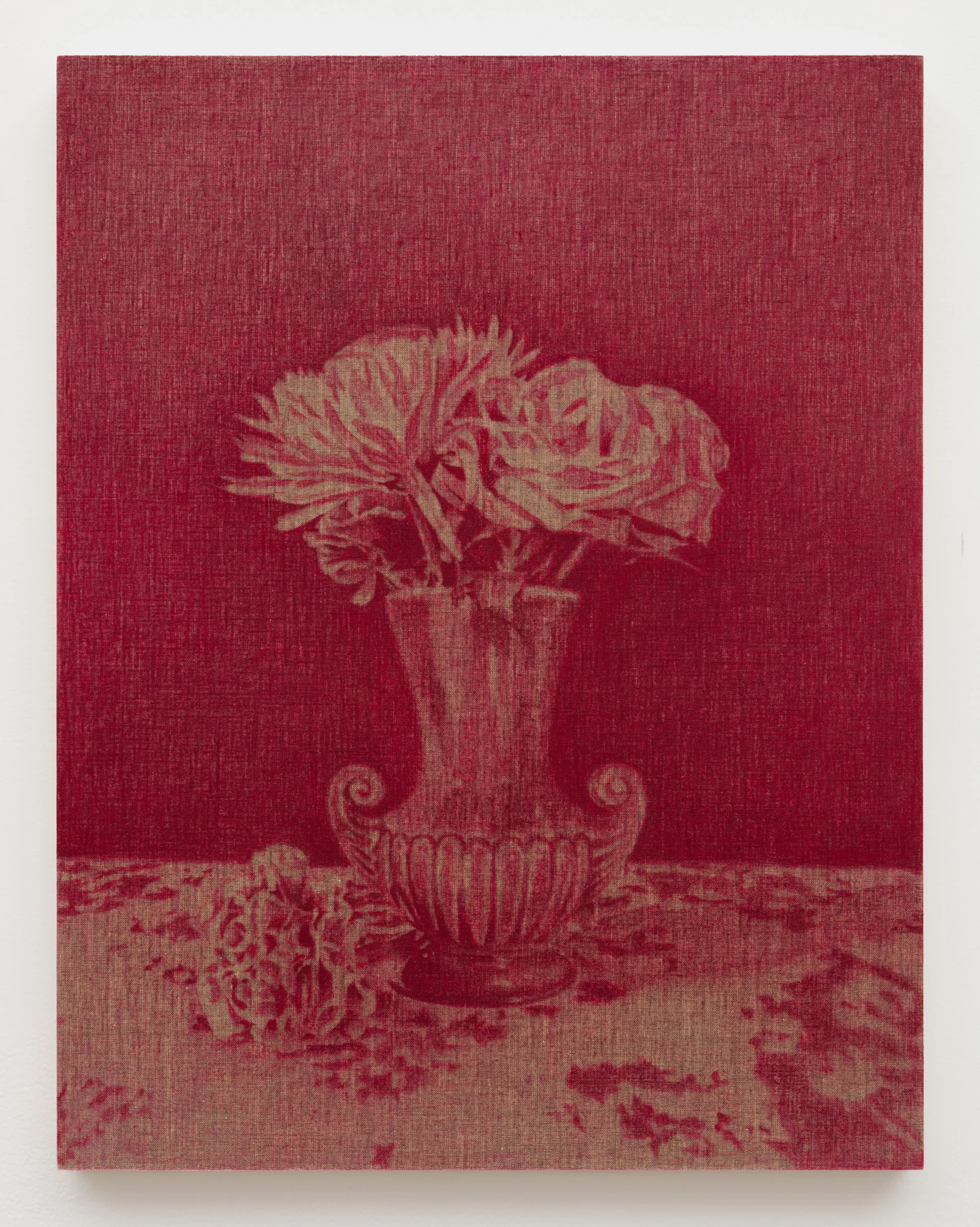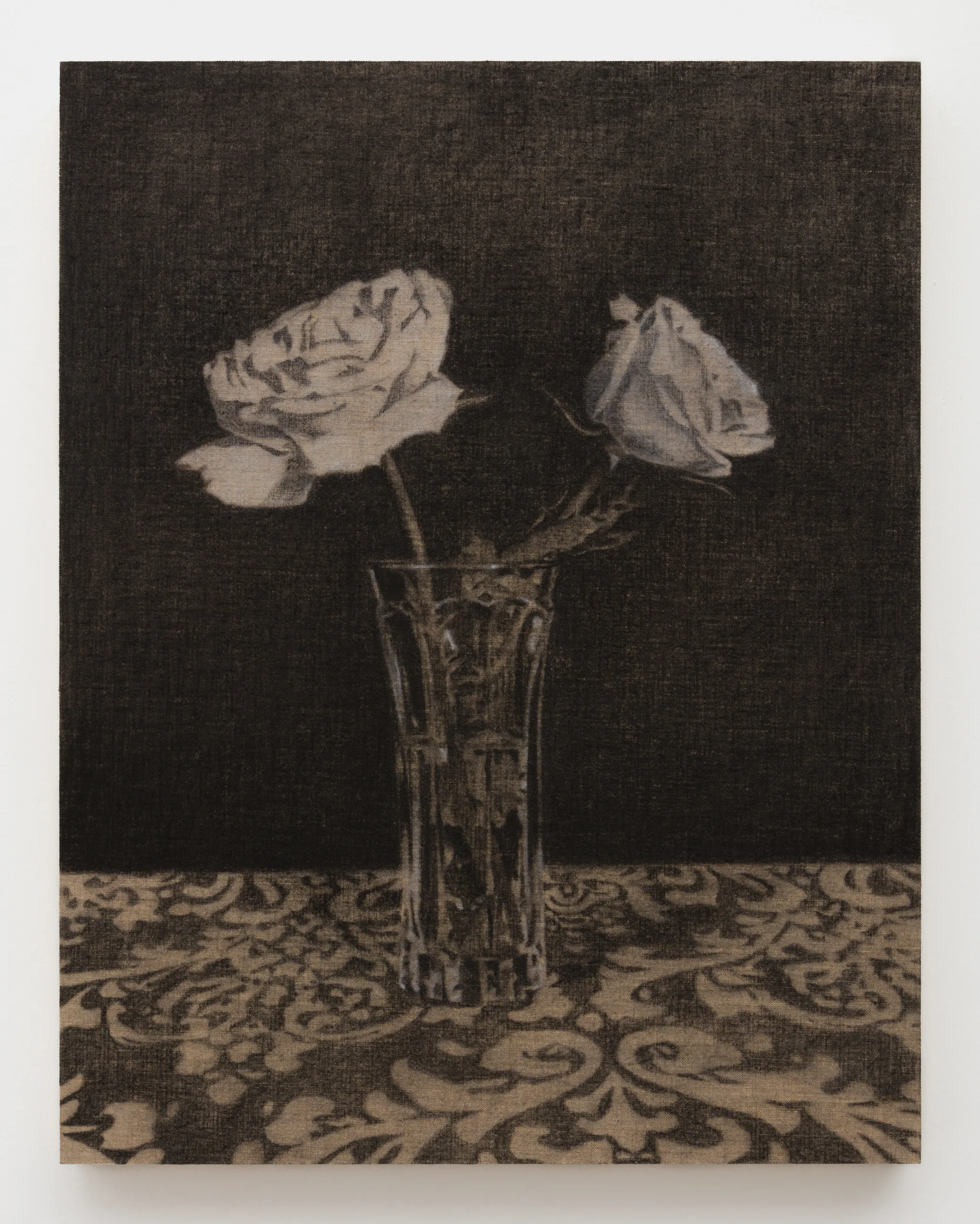 Nodding to the late poet Frank O’Hara, Mister’s paintings are small love poems to his family. Each flower has been considered, cared for, and lived with inside their home. Mister’s young son now keeps a small floral arrangement at his bedside, always replenished upon wilting. His toddler-aged daughter keeps a small vase with flowers on a bookshelf that she likes to touch and say goodnight to before going to sleep. Mister affirms, “A lot of my work in the past was about my own relationship to art history consumer culture. Now, as a father and a husband, the focus of my life has changed as I’m responsible for these two little beings and helping them navigate the world. I am trying, as it were, to bring something new into being, instead of copying something which was already there.” The artworks presented in Sonnets reveal Mister’s anticipatory nostalgia – reflecting his gratitude, documenting small passing moments, and allowing him to hold onto them for a little longer.