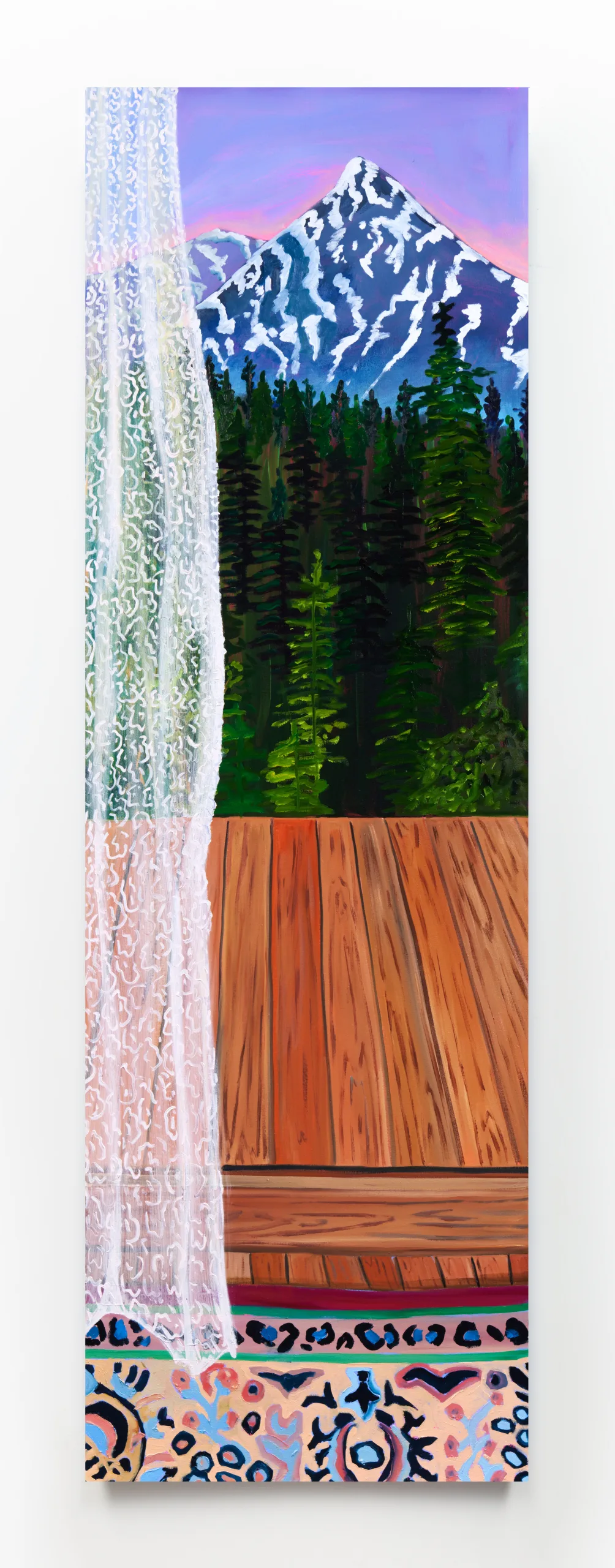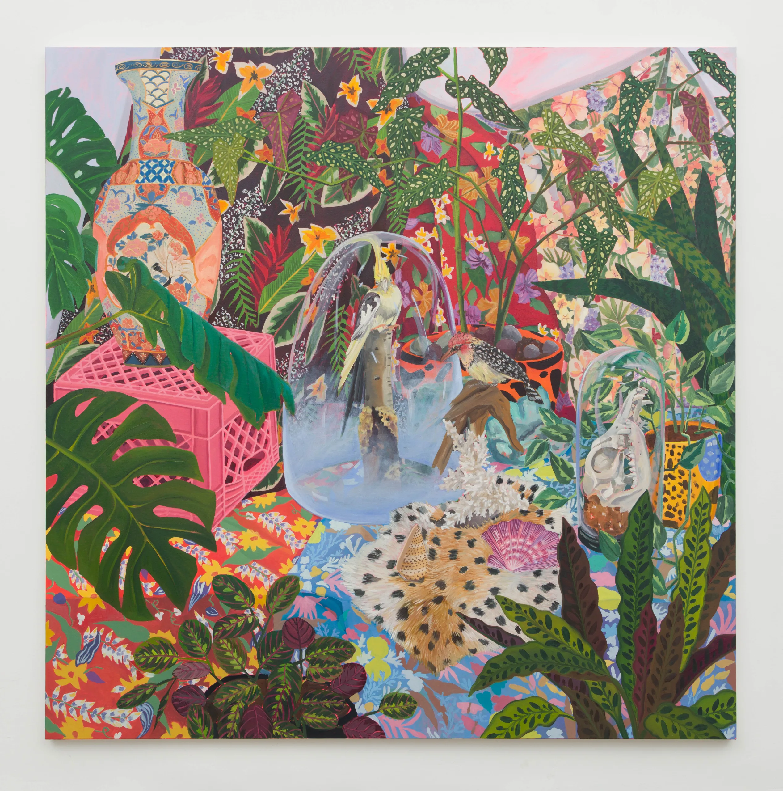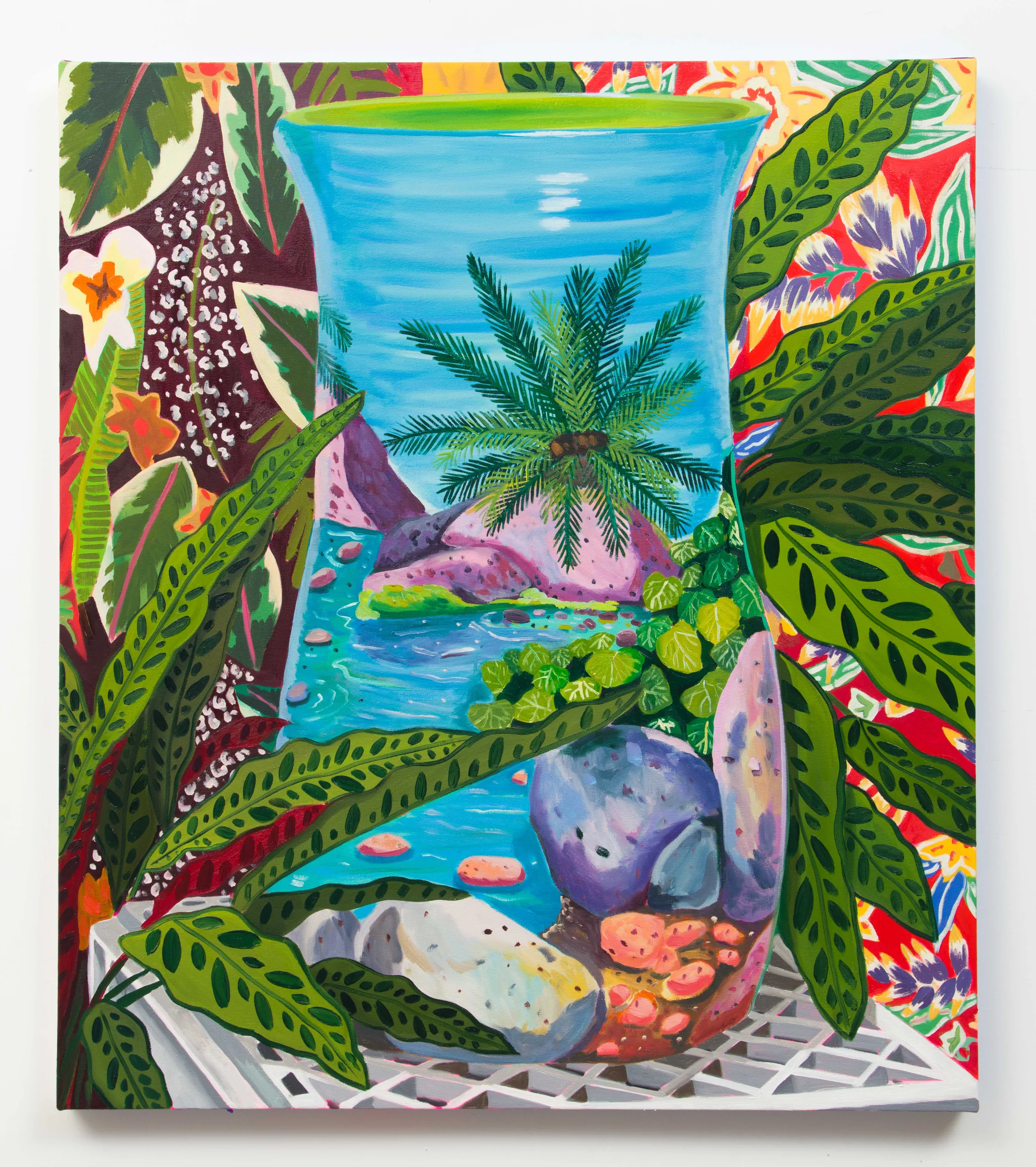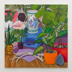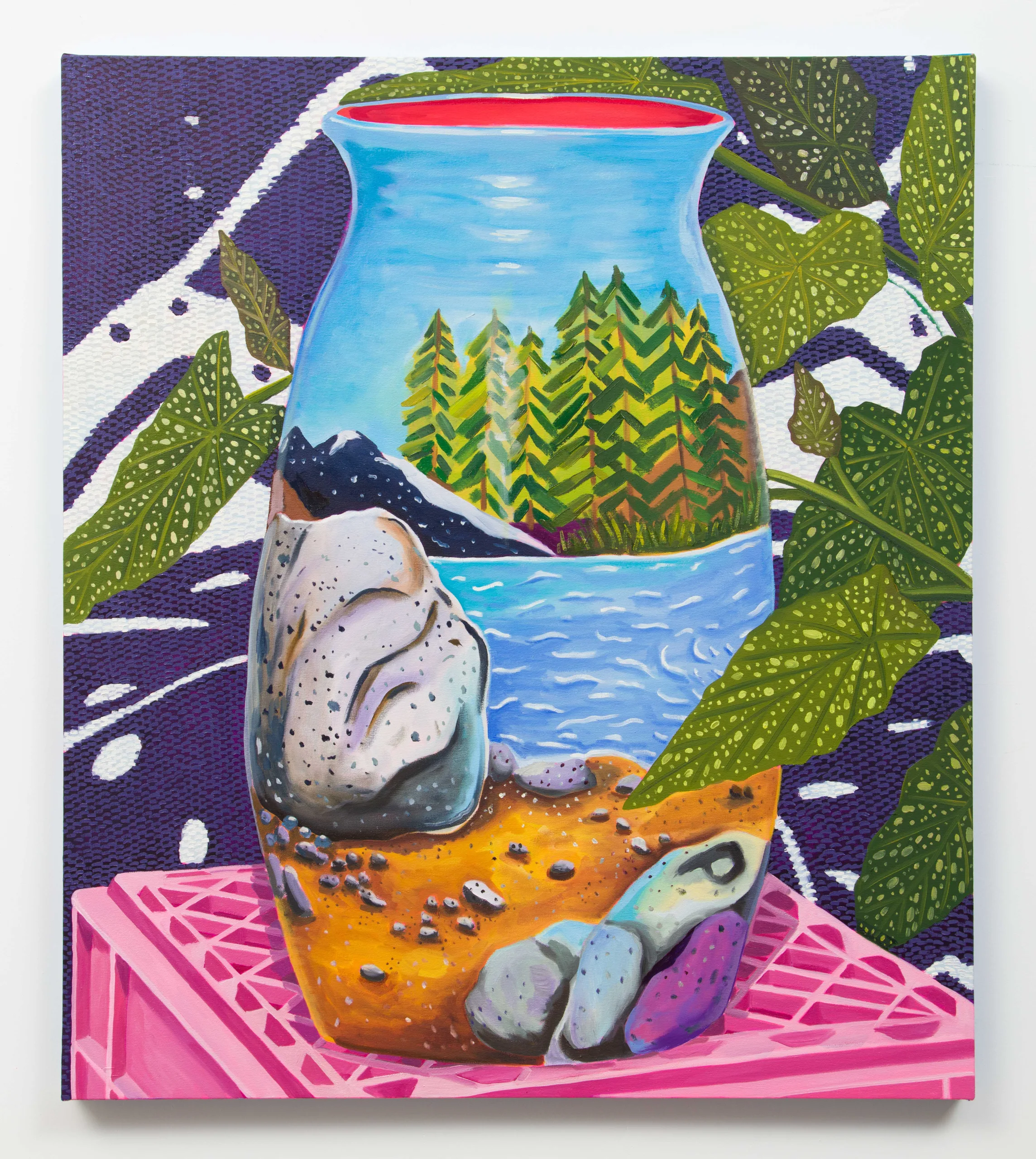 The paintings made for The Nature of Things are some of the densest Valdez has ever imagined. Objects are juxtaposed, unified with patterned fabrics covering vertical and horizontal surfaces underneath and behind. Large speckled or striped leaves interrupt space from the edges of canvases, inviting viewers to peek from one layer through to the next. Detailed, verdant, abundant, and saturated, Valdez strikes a balance between order and chaos. As the collection grows, objects are painted again and again. Valdez finds a variety of ways to render an object in paint, which can signify the passage of time or a reinterpretation of context to circulate new meanings.