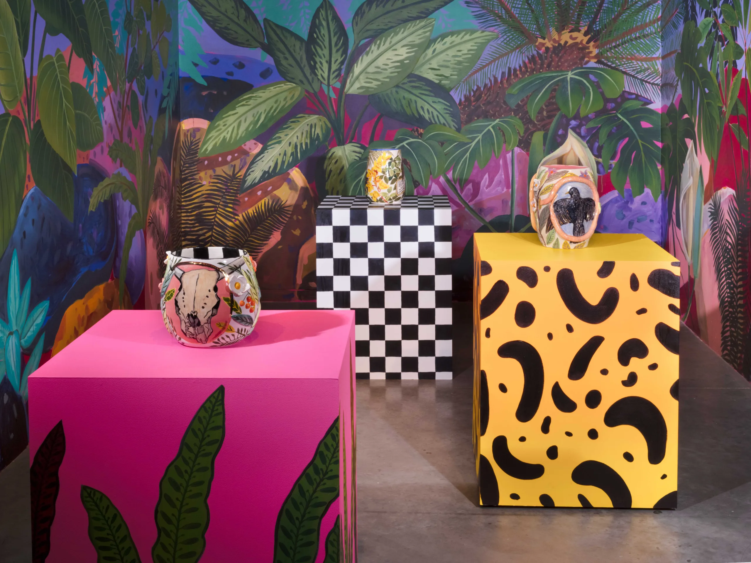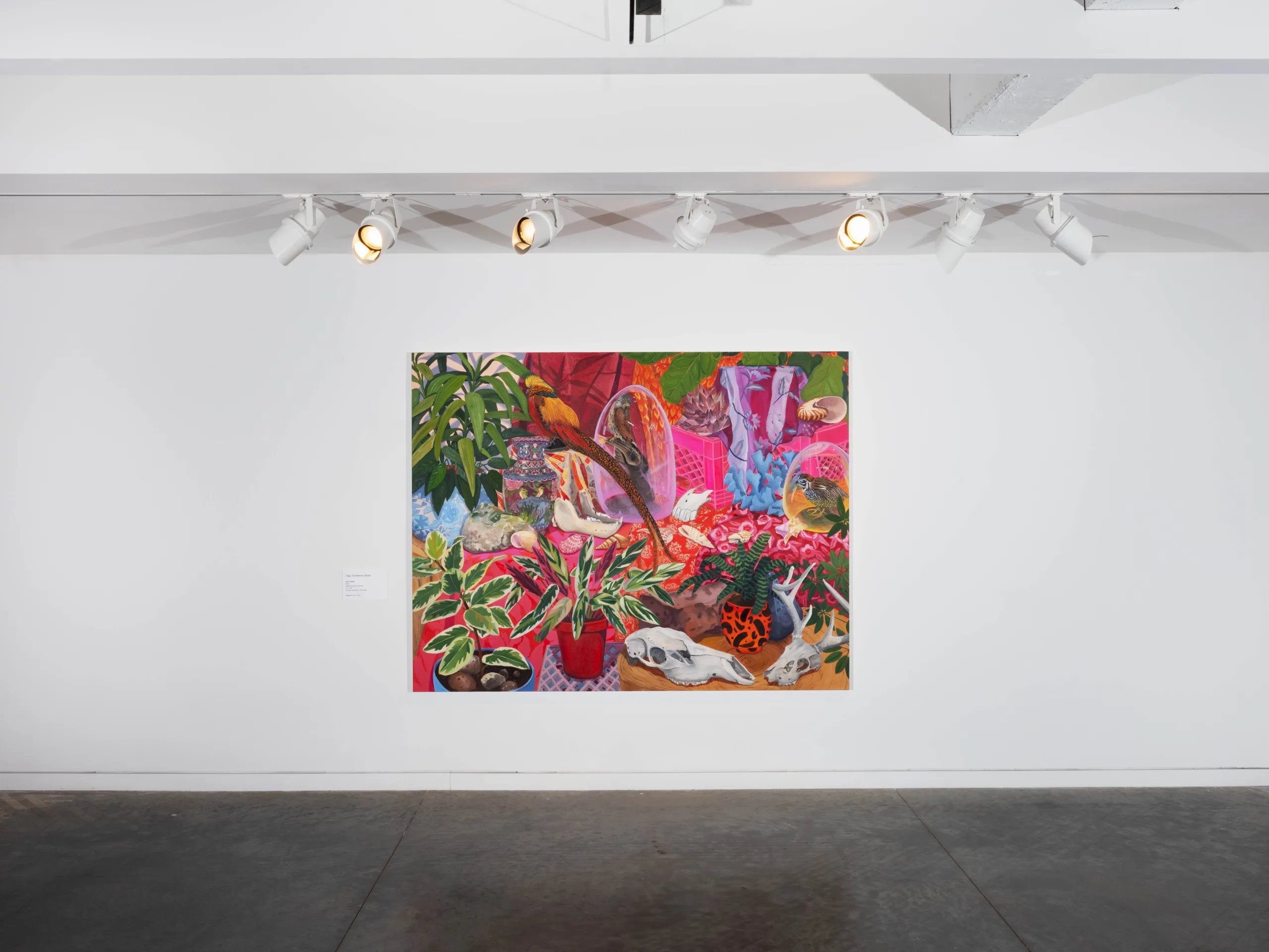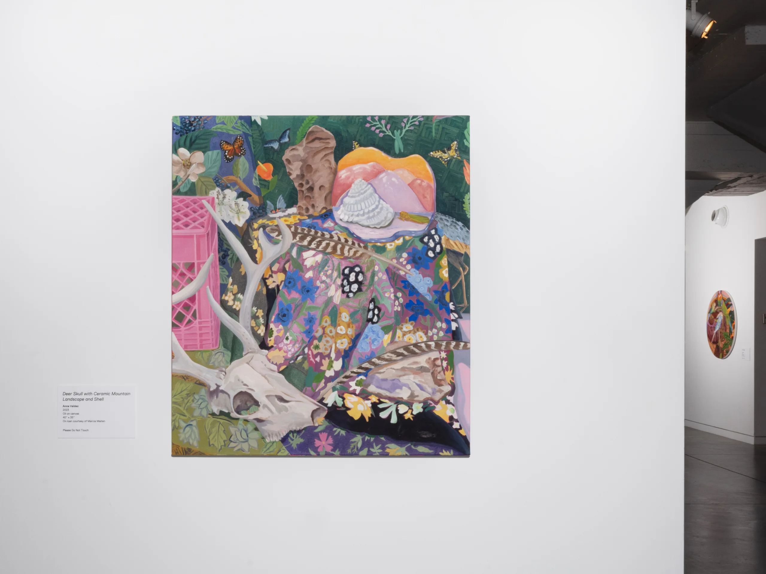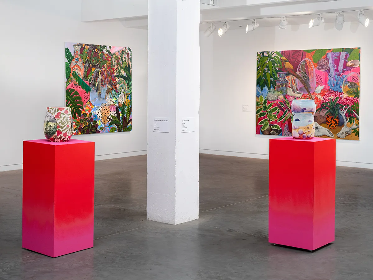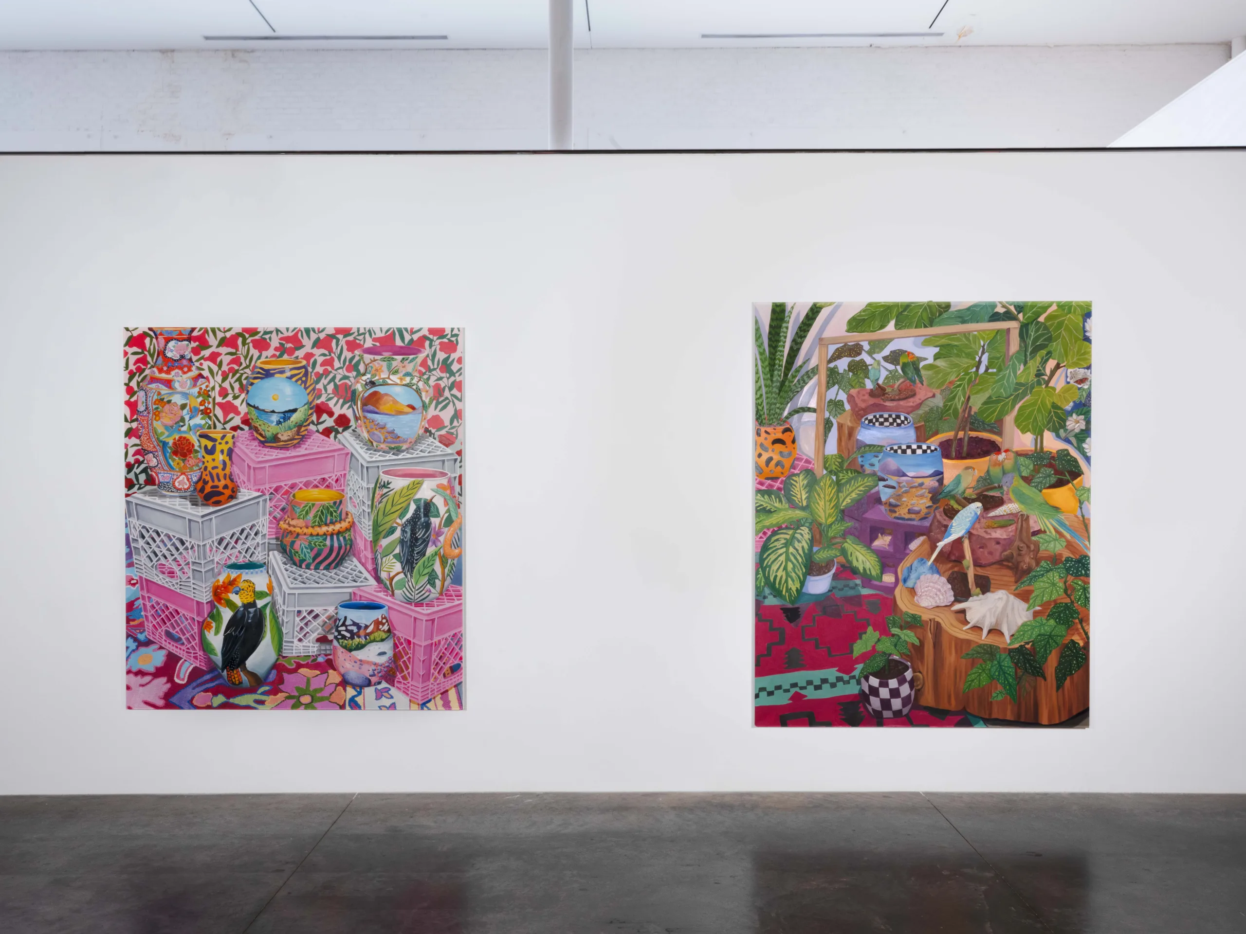 The Nature of Things features paintings and ceramics depicting maximalist compositions of still life arrangements that seek to explore object-making and how objects form a tapestry of visual history, both contemporary and historical. Valdez rearranges her growing collection of natural and human-made objects in endless permutations in her Los Angeles studio. Semi-precious rocks, plants, shells, corals, animal bones, and taxidermized birds line the studio shelves. Valdez also incorporates her own ceramic sculptures, paintings, photographs, antique vases, books, milk crates, textiles, and rugs as she creates her visual language. Parts of Valdez’s studio resemble a small natural history museum and objects are never deaccessioned. “My paintings are like contemporary versions of cabinets of curiosity,” Valdez explains, “presenting viewers with a visual feast of carefully chosen objects and arrangements.” As she plans compositions from grouped items, new narratives arise. Considering the cultural or personal significance of each object, as well as tactile qualities like color and texture, Valdez endeavors to access new relational stories, compelling the viewer to become absorbed into her world.