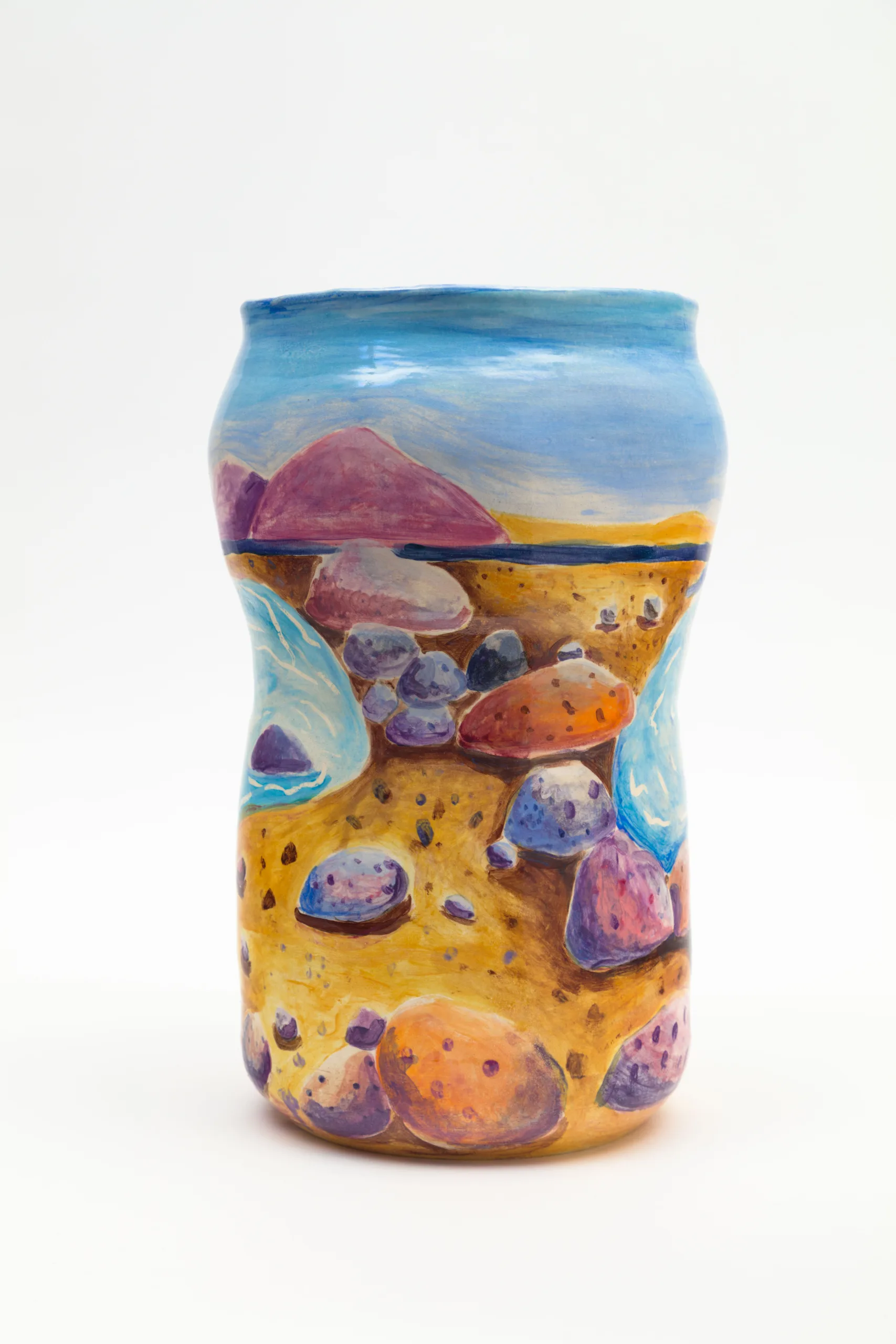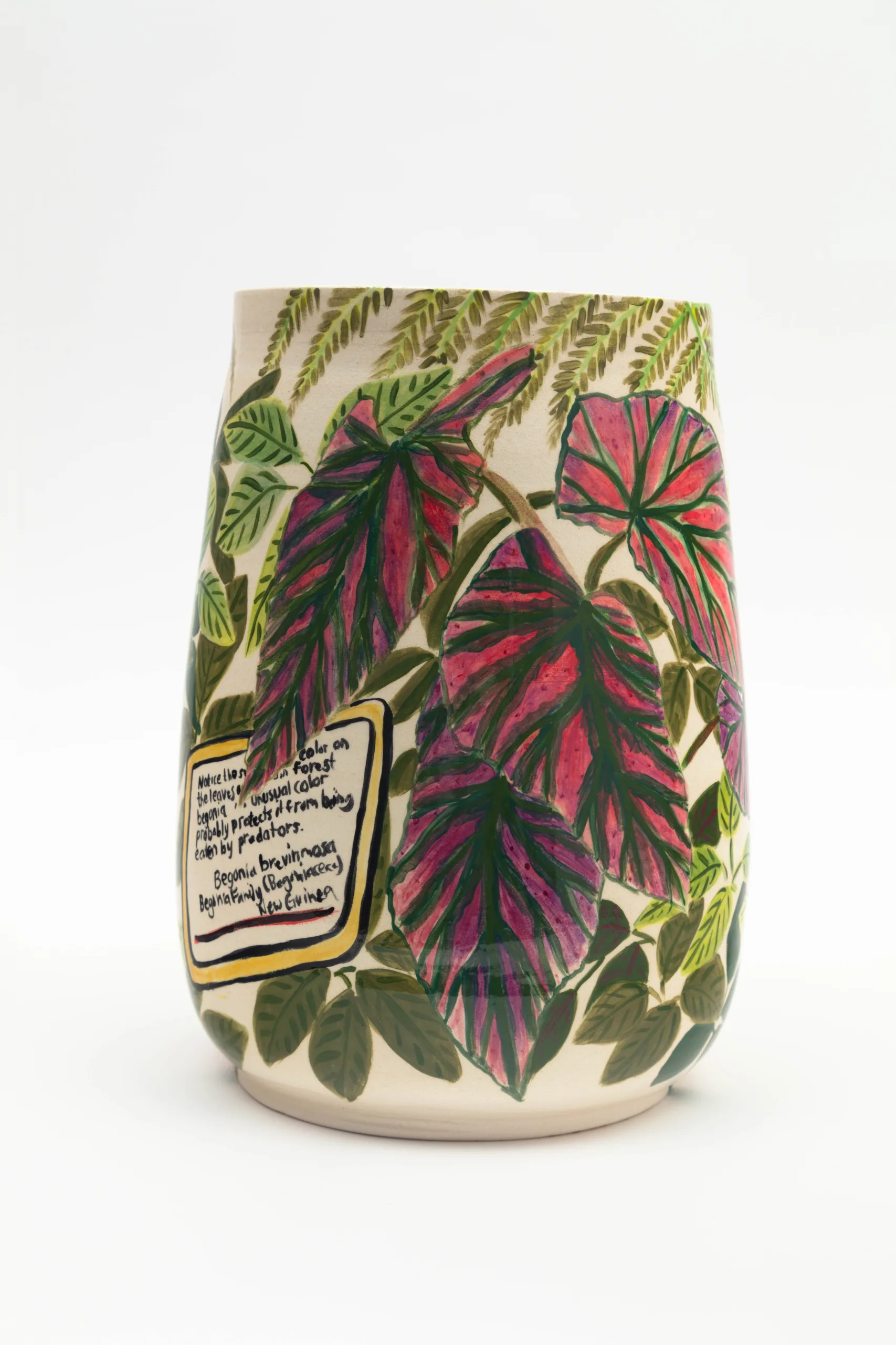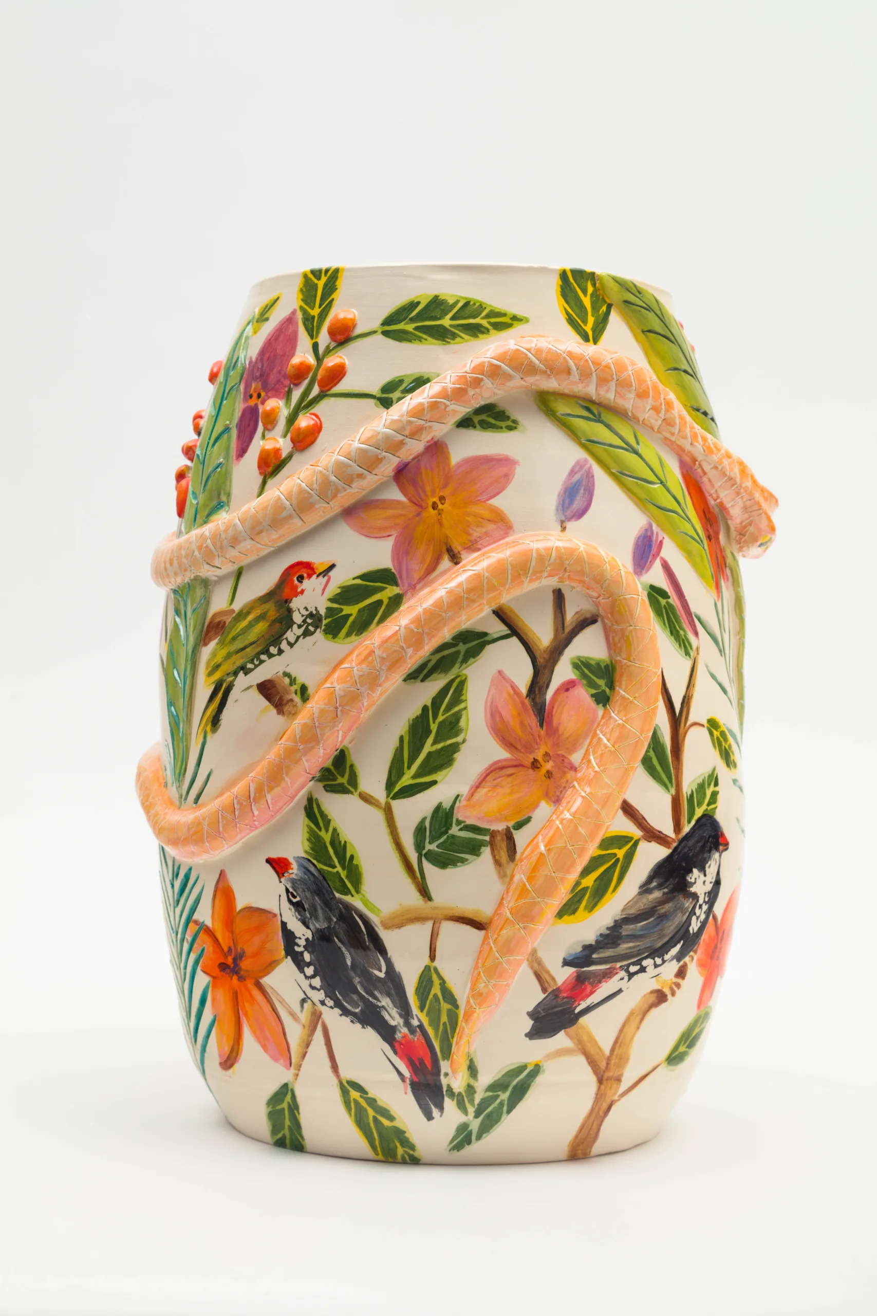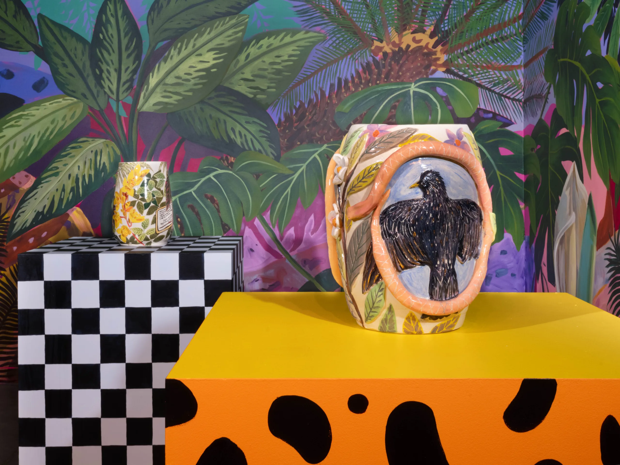 Strategies of reproduction, repetition, and pattern are also evident in Valdez’s ceramics, which can echo pre-existing objects or offer portals into paintings. Valdez has delved deeper into the craft of ceramics in an effort to generate objects that are specifically relevant and personal to her style. According to Valdez, “the impulse to fabricate ceramics is also born from the desire to generate a visual through-line that is uniquely my own.” Reoccurring vases land in a painting and function as a personal cultural artifact, capable of being dug up and examined again and again. The complex painted imagery on each ceramic encourages the exploration of multiple visual access points as the viewer moves around them.