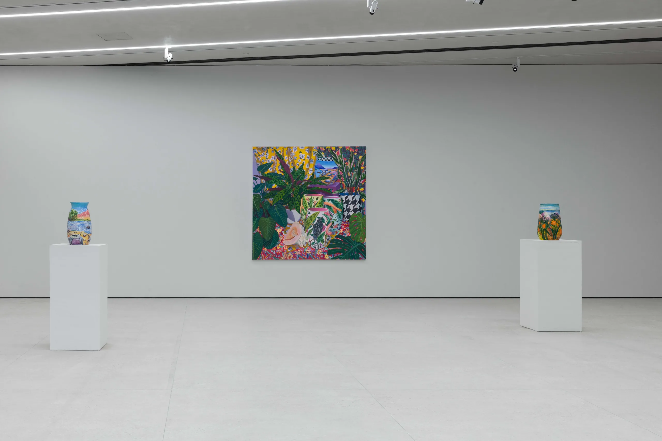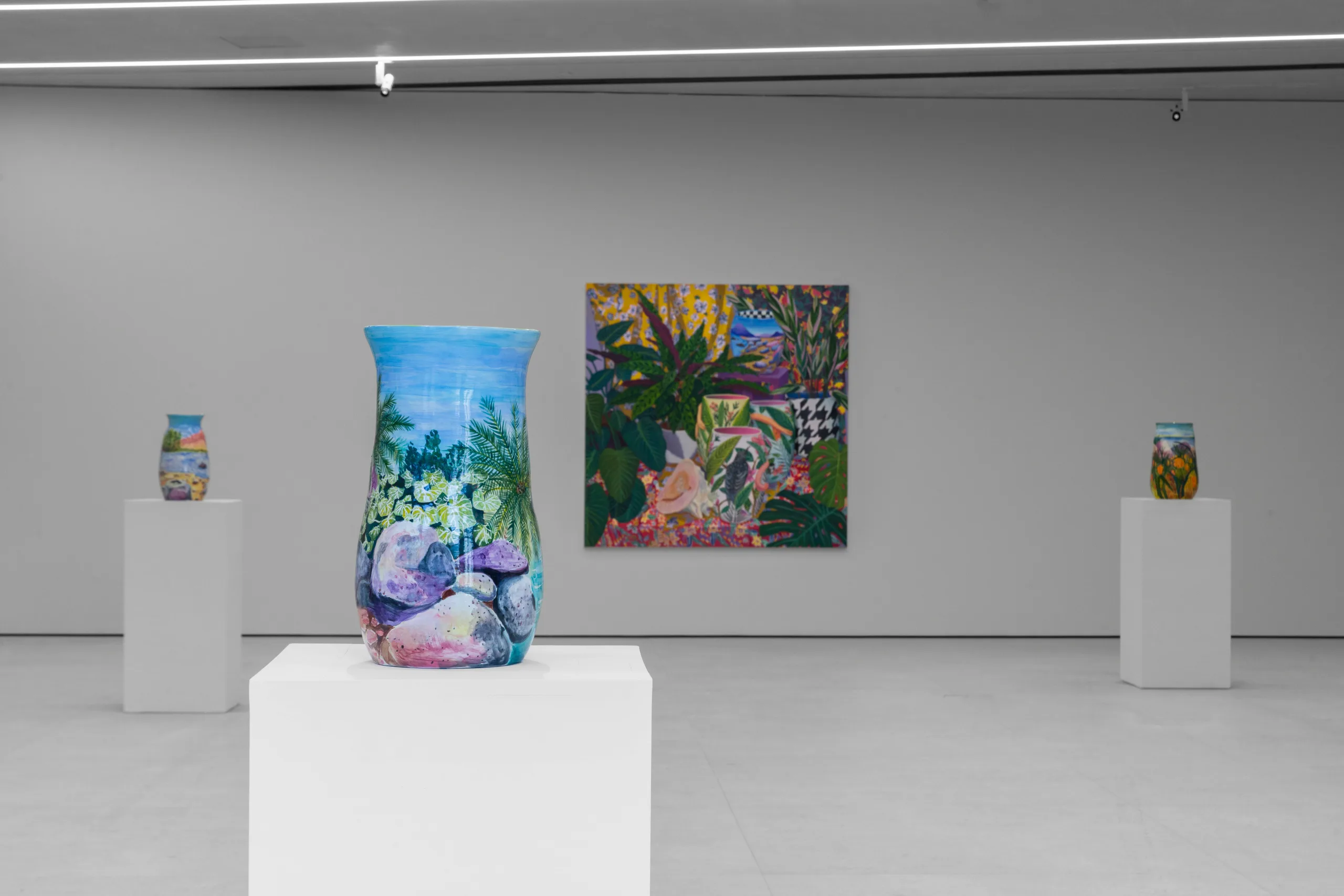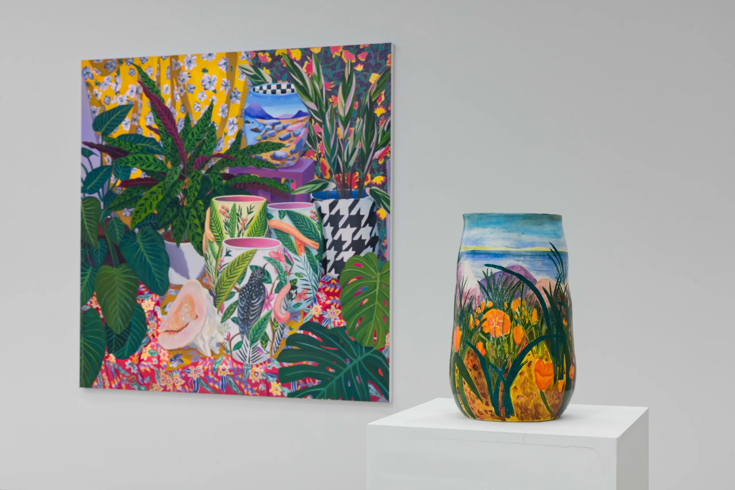 Valdez’s new paintings are some of her densest yet. Objects are cozy, placed in close proximity, with patterned fabrics covering most vertical and horizontal surfaces underneath and behind objects. Large speckled or striped leaves interrupt space from the edges of canvases, inviting viewers to peek from one layer through to the next. Detailed, verdant, abundant, and saturated, Valdez strikes a balance between order and chaos. As the collection grows, objects are painted again and again. Valdez finds a variety of ways to render an object in paint, which can signify the passage of time or help differentiate between two representations of the same idea. Strategies of pattern, repetition, and reproduction are particularly evident in Valdez’s ceramics, which can echo preexisting objects or offer portals into paintings. The imagery found on her vases wraps completely around the surface, forming 360 degree scenes. Despite their simplicity in form, the complex painted imagery encourages the exploration of multiple visual access points and the discovery of various uses from a single object.
