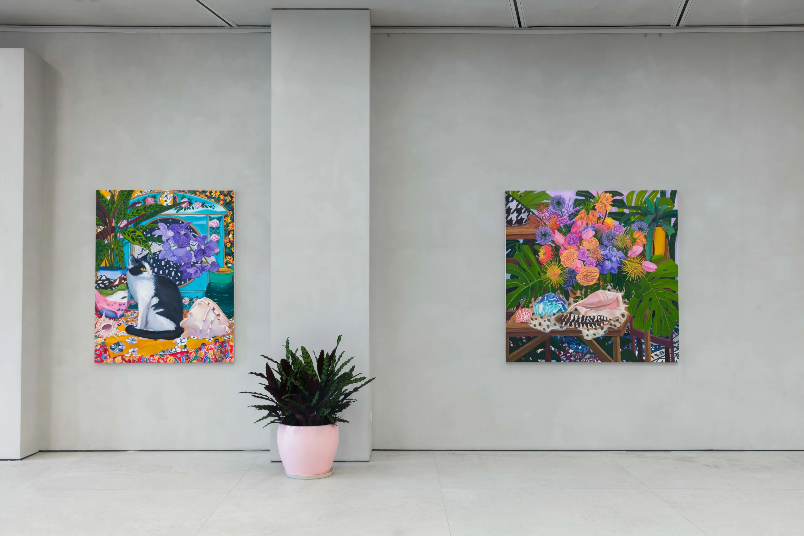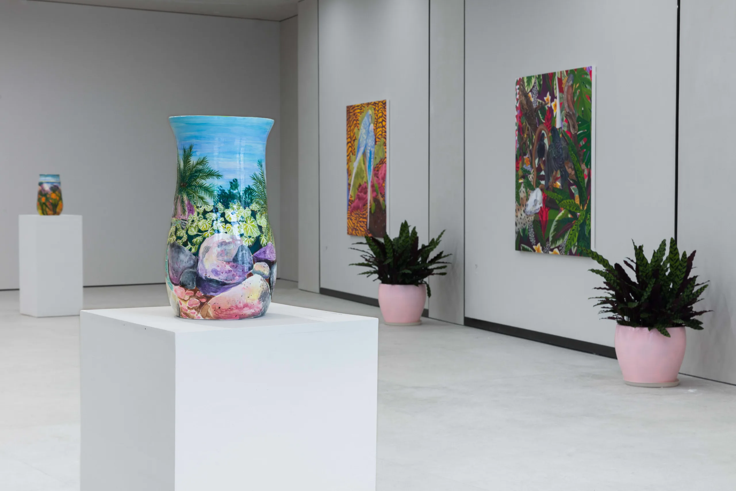 A painting featuring two headless woman statues amidst shell, plants, pink flowers, and striped leaves.A painting shows three taxidermized birds and some animal bones. There are striped leaves and flowers surrounding the canvasA small bouquet filled with different type of vibrant flowers, striped leaves surrounding the canvas also.A painting shows a cat sitting on a patterned fabric. The animal is surrounded by plants and flowers in vases. There are also shells and coralsThe canvas shows five vases with different landscape designs painted on those. Small snake is lingering on three vases. Striped leaves are everywhereA painting focuses on a botanical garden view of a pond. There are four taxidermized birds looking at the pond.A painting showcases a vase filled with vibrant flowers and plants, surrounded by striped leaves, forming a colorful bouquet.A pond landscape is painted on a ceramicA landscape with wildflowers overlooking the lake is painted on a ceramicYosemite Landscape is painted on a ceramic