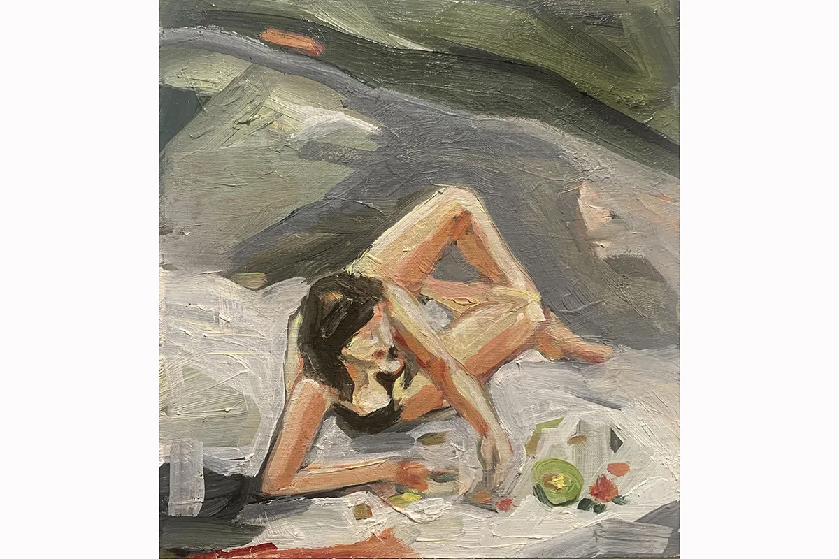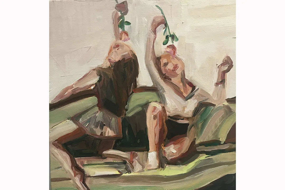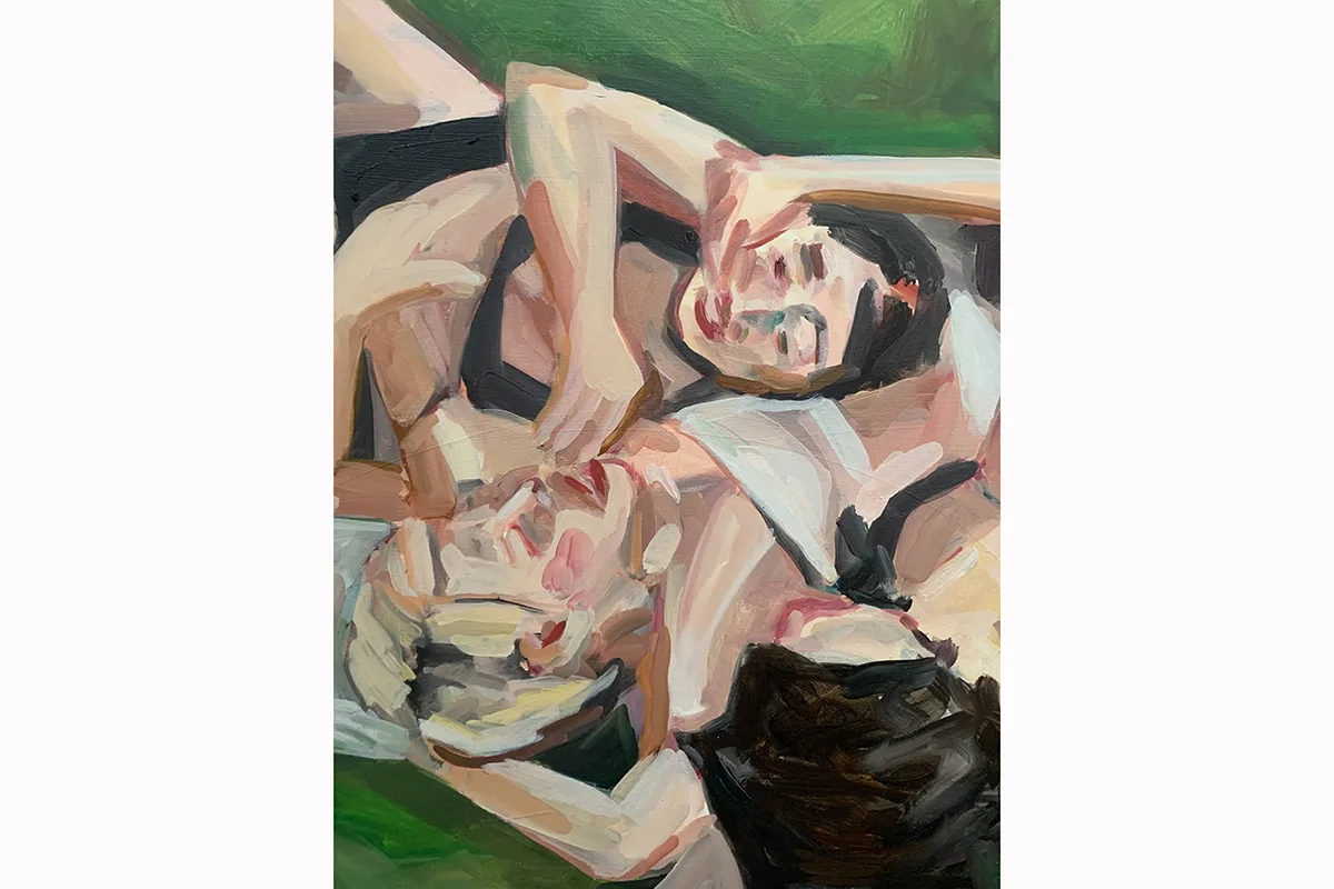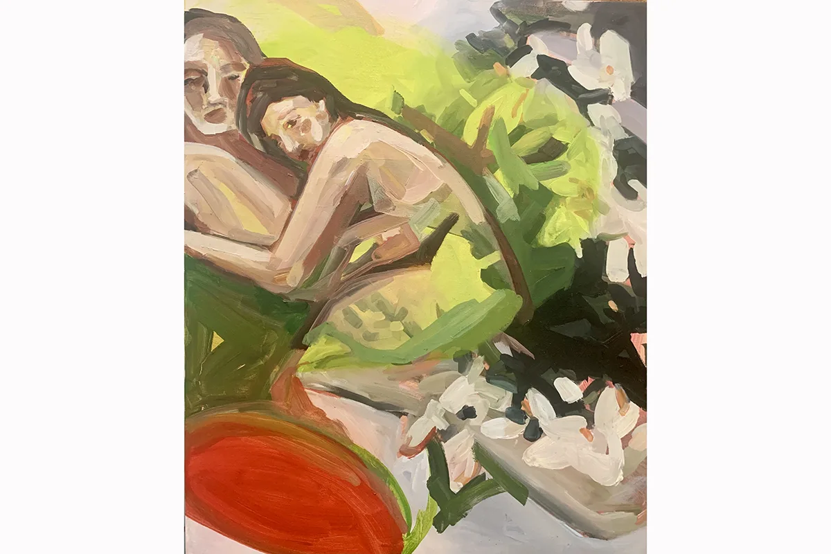 Wheless plays with her paint as her protagonists play with their food, meandering for pleasure because completing the task is not the point. A flower smells sweeter when dangled above the nose, as two ladies demonstrate in Romantics (2021). They balance on a sofa with their eyes closed—we don’t gaze either. We move through the world, feeling the world emotionally and sensorily in our bodies [1]—Effortless and uninhibited paint strokes like rose petals grazing noses. Colors blend when Wheless applies them wet on wet—boundaries are only fun when pushed up against and curiosity is richly rewarded. The two figures in Held (2021) hold each other. Wheless emphasizes the tenderness of their embrace by easing their physical boundaries—they merge into their landscape because all matter matters and pleasure is the path to revolution.
