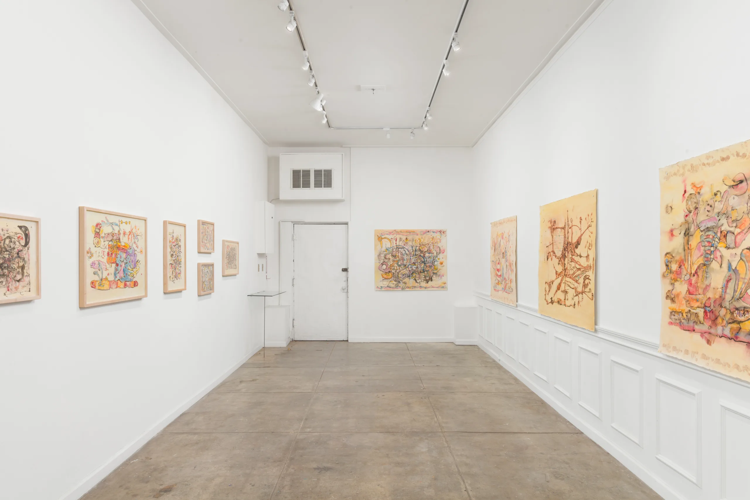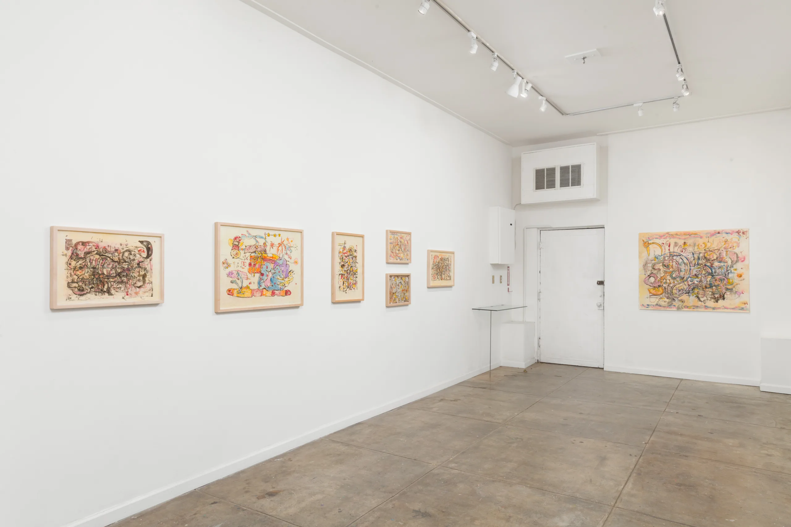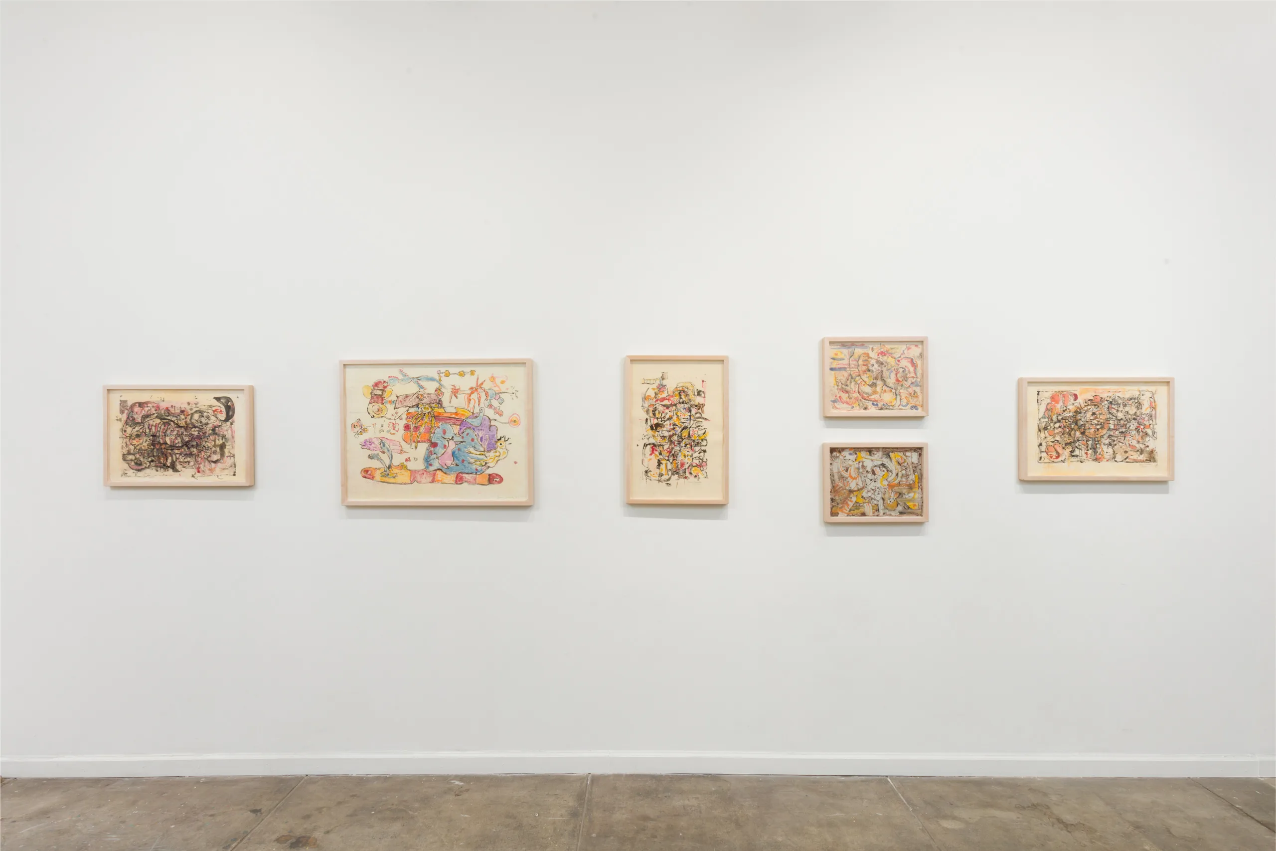 Titled Beachwood, the exhibition is rooted in Granade’s home studio in Beachwood Canyon outside of Los Angeles and the six-month span during which these works were made. The imagery—drawn from the surrounding landscape and from intimate encounters with animals, illness, loss, and renewal—moves fluidly between abstraction and figuration, refusing a fixed hierarchy between the two. Birds collide and scatter, insects and animals mutate into hybrid forms, and architectural structures dissolve into biological or celestial visions. References range from x-rays of a beloved dog’s spine to found moments and symbols of revelation, hope, and redemption. Filtered through a deeply personal visual vocabulary shaped by years of looking across disciplines and histories, these layered, hallucinatory images form unstable fields in which meaning remains provisional.