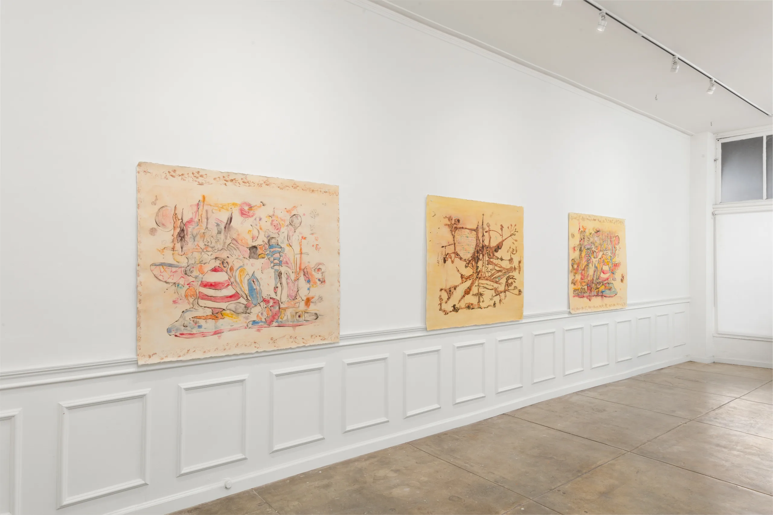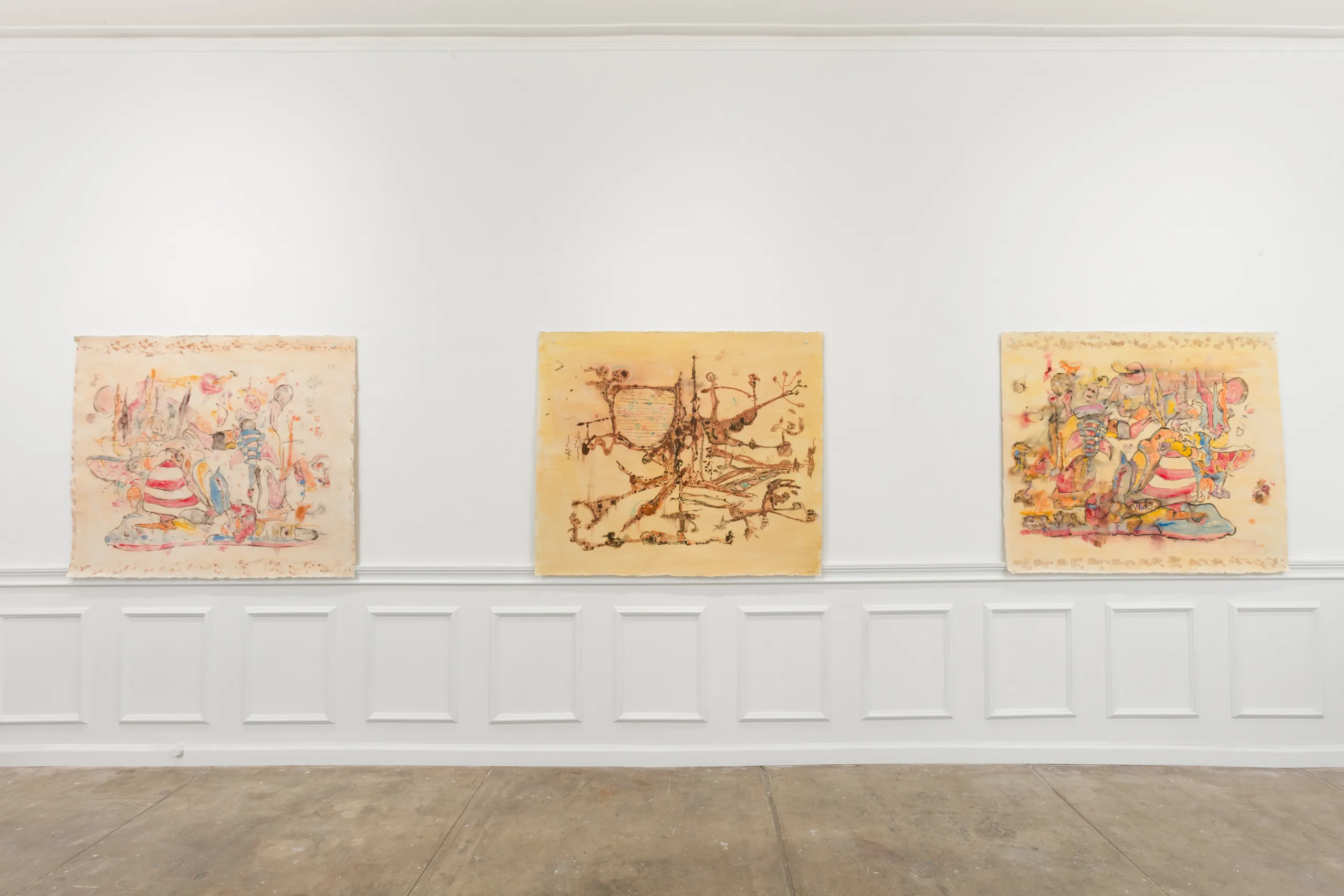 Beachwood brings together a body of Rives Granade’s monoprints made through a labor-intensive, improvisational process. Watercolor is painted onto a soapy sheet of plexiglass, allowed to dry, and then reactivated through contact with soaked paper, with pressure applied by the artist’s own weight and a rolling pin. Some sheets are pulled once, others twice, allowing earlier images to linger as ghosts—residual color reawakening unpredictably in subsequent impressions. In several works, the paper itself bears environmental history, having been soaked in recent rains before printing. The resulting images are absorbed into the fibers rather than resting on the surface, producing a worked, tapestry-like materiality in which paper and pigment become inseparable. Chance operates as a necessary collaborator, yielding surprises, errors, and moments of unexpected clarity.