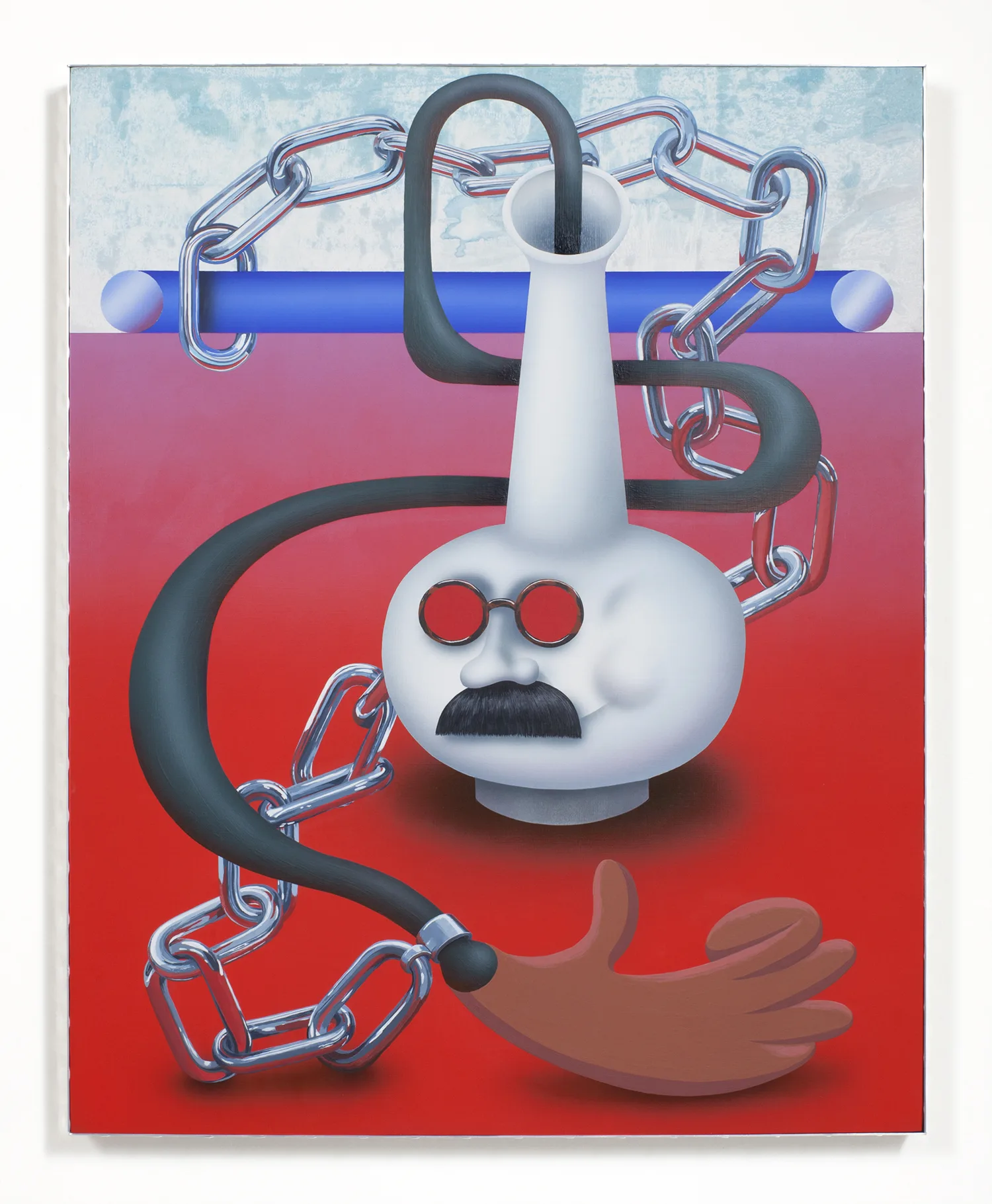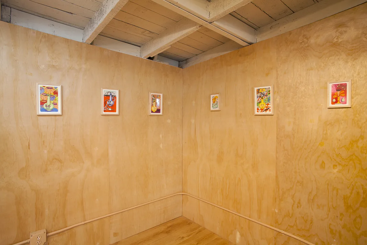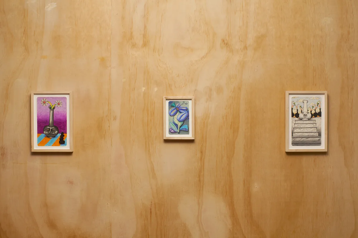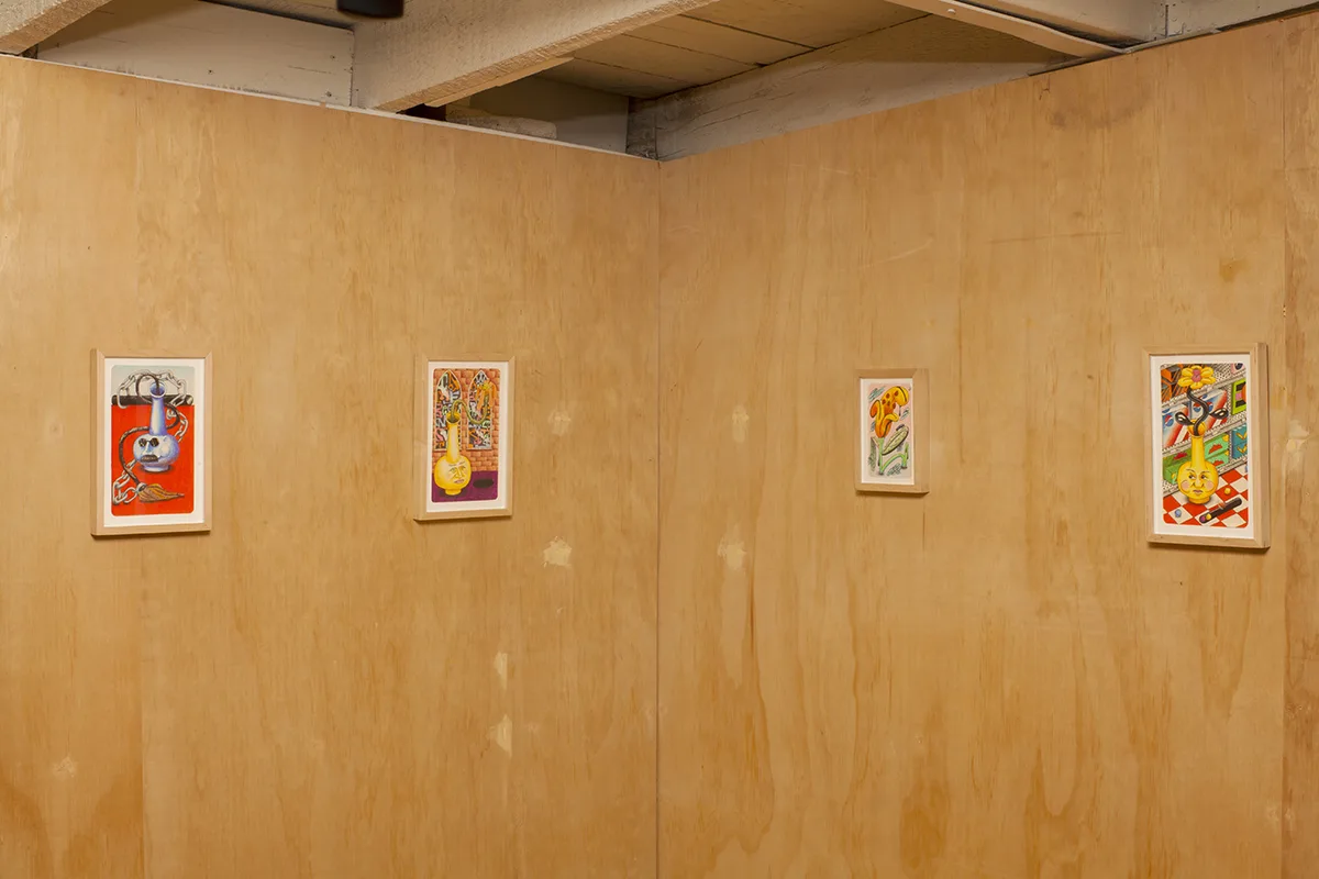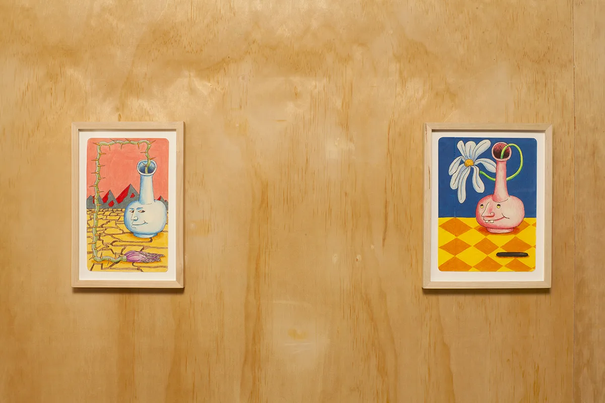 Sanders explores internalized fears, spirituality, and the human condition through a series of works on paper and paintings executed over the past two years. The paintings stem from the works on paper, which Sanders creates while sitting in church. Many depict personified characters, insects or cheap plastic Teleflora vases (an object that Sanders obsessively collects from thrift stores). Sanders places these characters into narrative and surreal settings. Despite their cartoonish quality, the works suggest a deep level of introspection. Through metaphor and symbol, they become a collection of visual parables meant to unearth hopes and anxieties, both universal and unique to Sanders’ own experience.