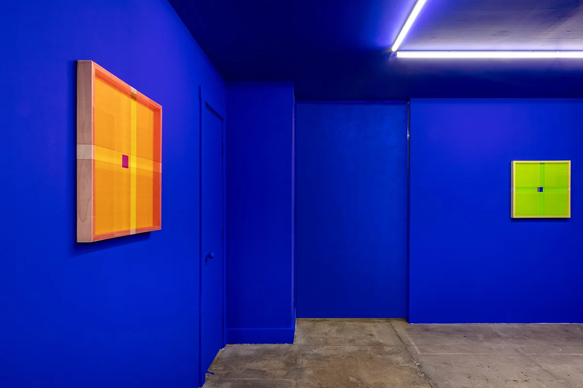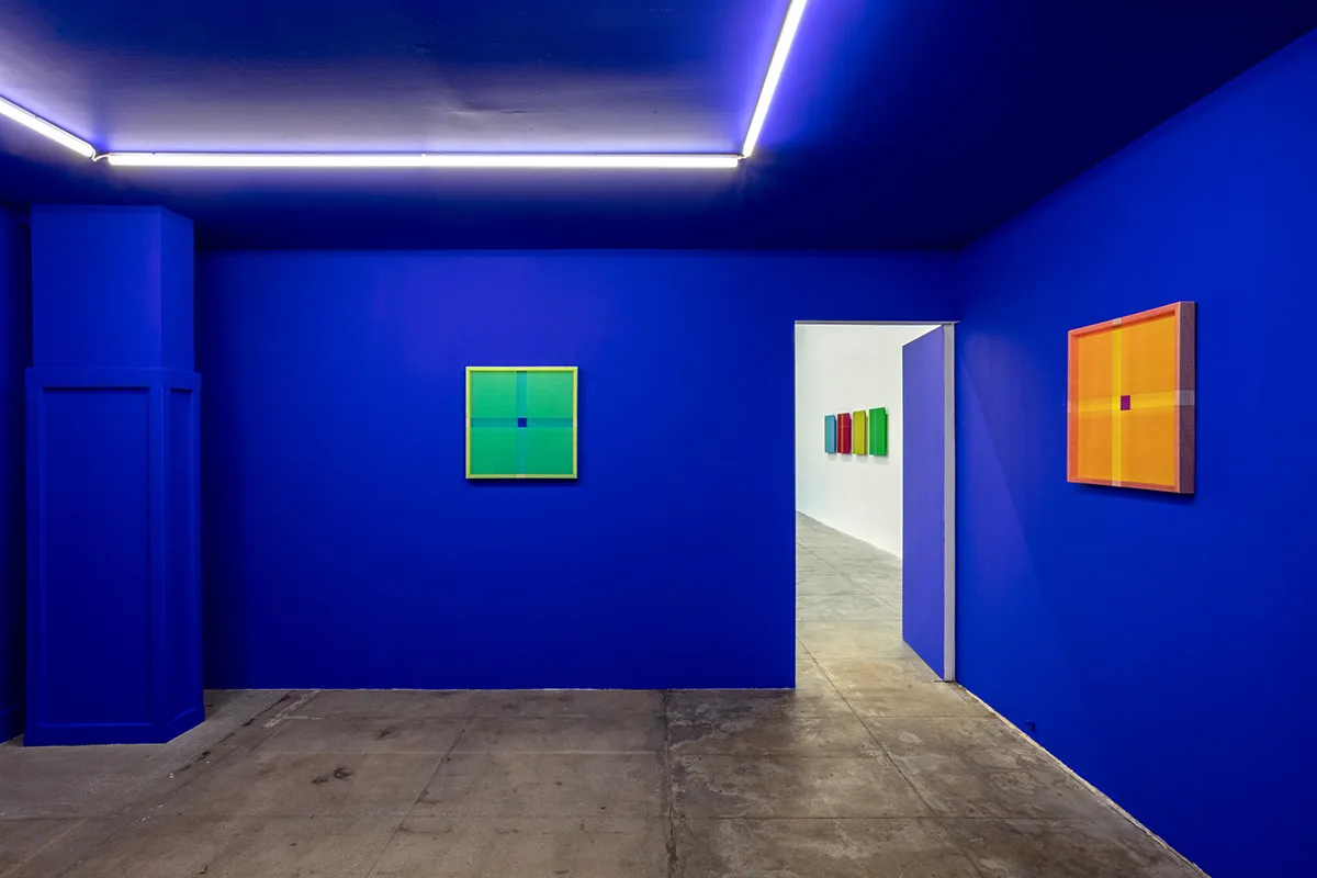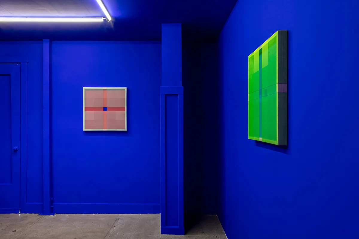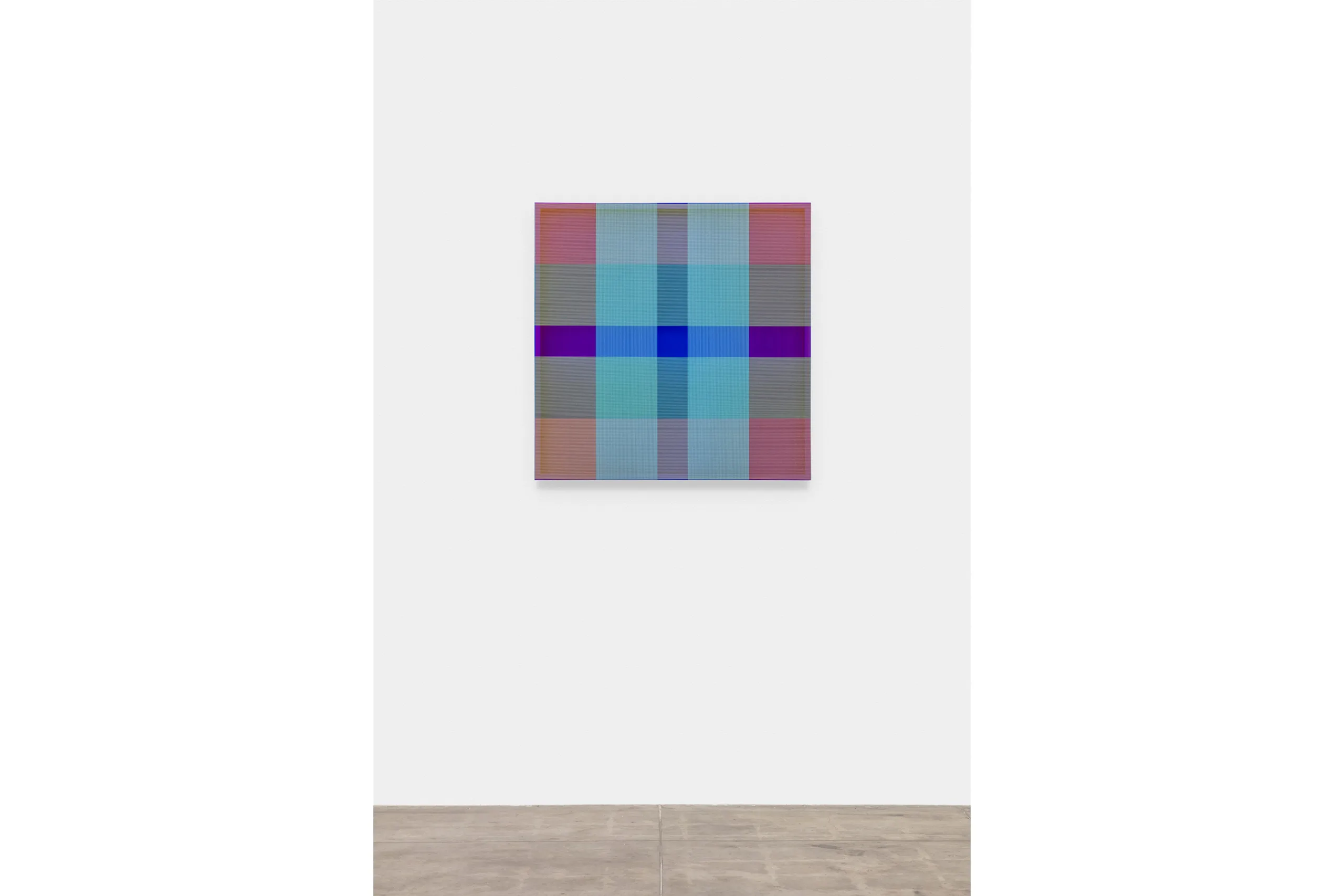 The back gallery is an immersive installation in International Klein Blue. Co-invented by French artist Yves Klein in 1960, IKB uses a matte, synthetic resin binder that allows the suspended ultramarine pigment to maintain its aesthetic potency. A blue born of conceptualism, IKB’s super saturation was made to provoke perception. “To sense the soul, without explanation, without words, and to depict this situation,” Klein declared, “is what led me to monochrome painting.” In the center of each of Wills’ blue room panels is a small blue square, framed by thousands of colored threads that reflect light, create patterns with their layering, and cast shadows on their supports—as if a square could determine whether artworks have souls. “Abstract work should have a bit of a heartbeat,” says Wills, “with material, let’s say, having a voice.”