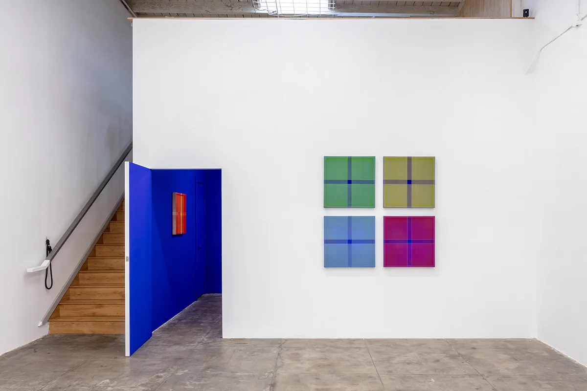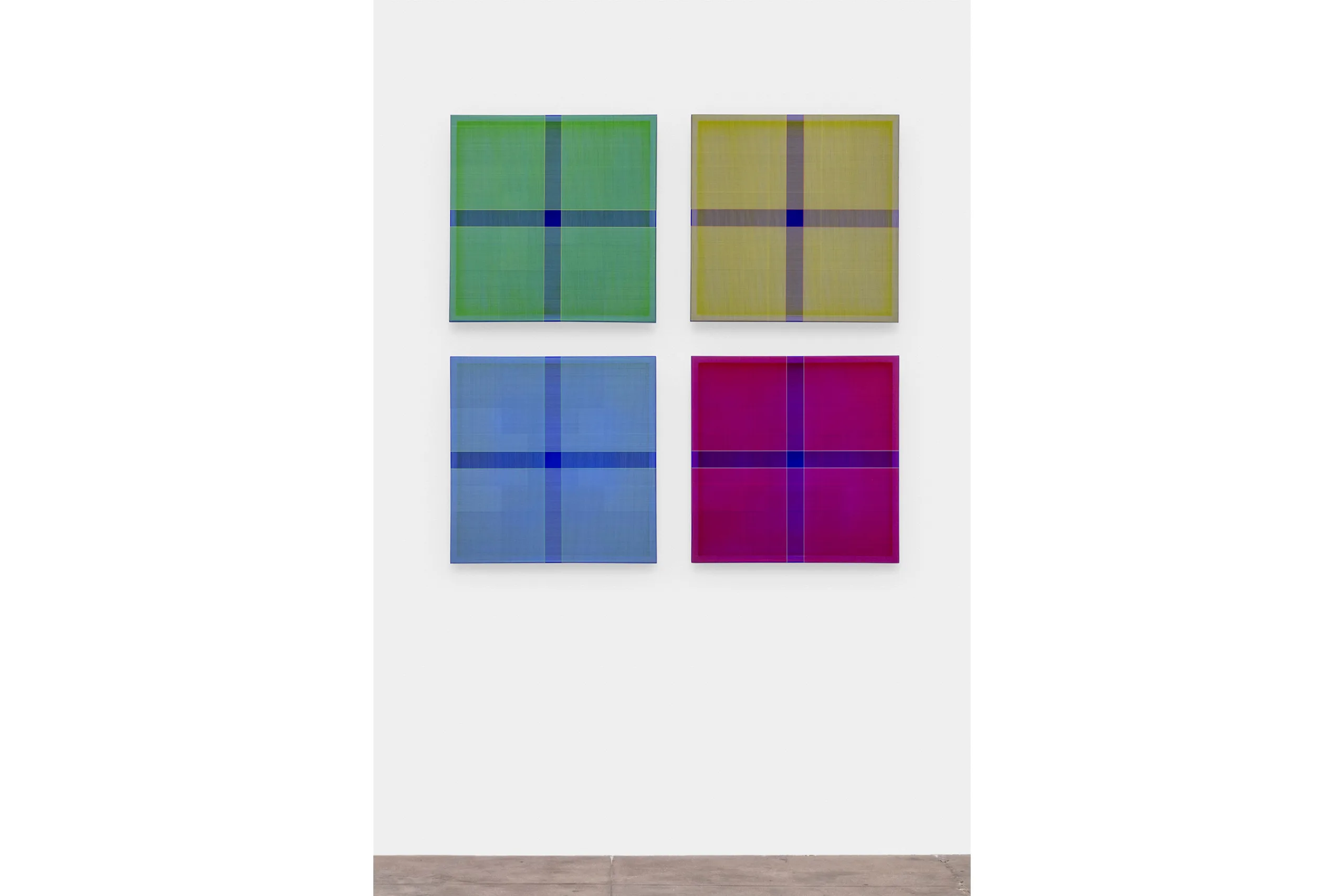 In the largest gallery, individual works use a repeating color scheme—turquoise, red, yellow, and green threads wrapped around International Klein Blue-painted panels. One quadtych of deeply beveled panels appears to hover off the wall, supporting alternating layers of threads wrapped vertically or horizontally. While a single color plays the primary role per panel, adjacent colors appear to occupy the spaces between. Harnessing the notion of this perceived reflected color, Wills expands the composition beyond traditional dimensions.