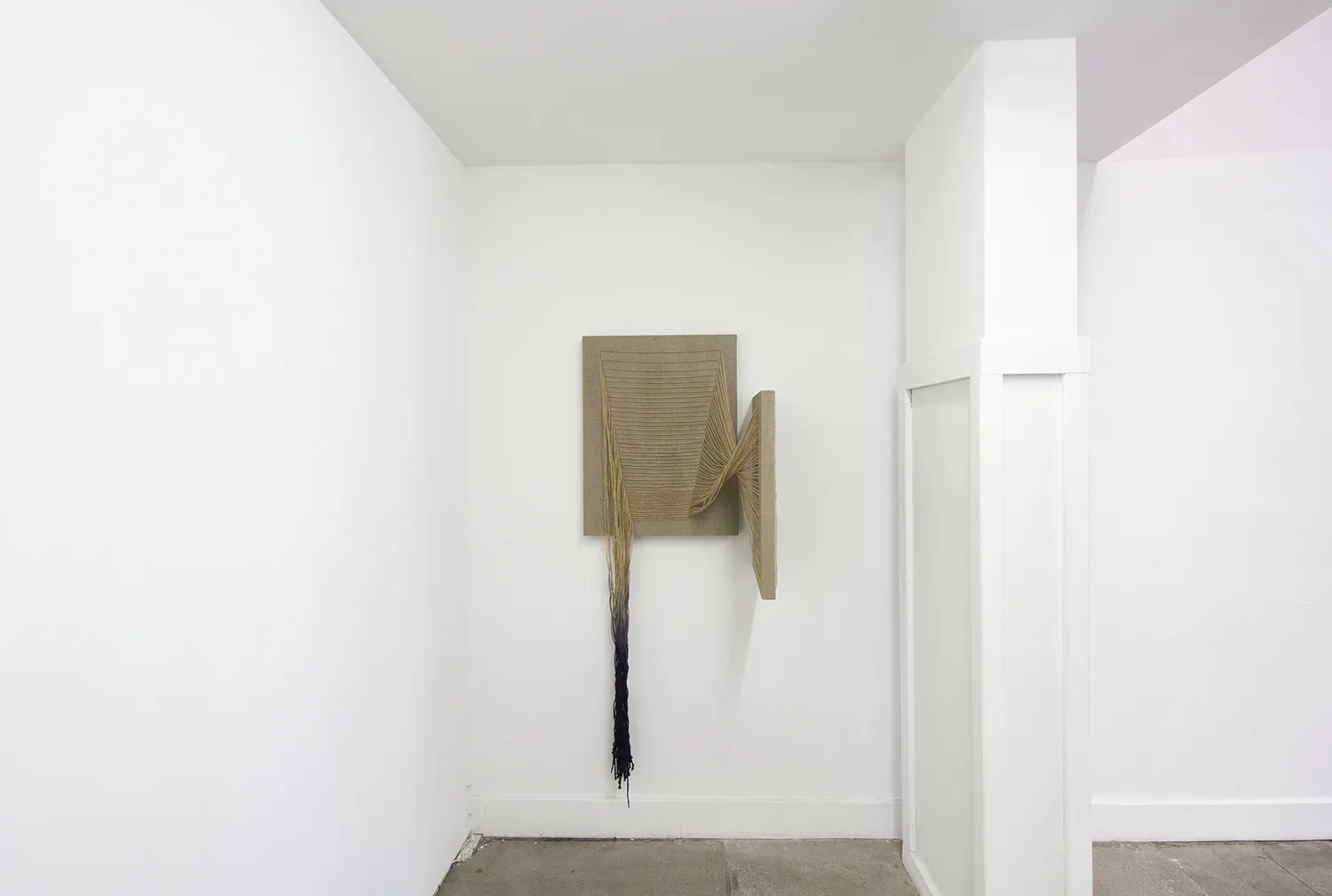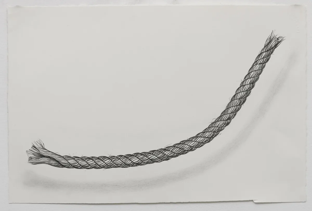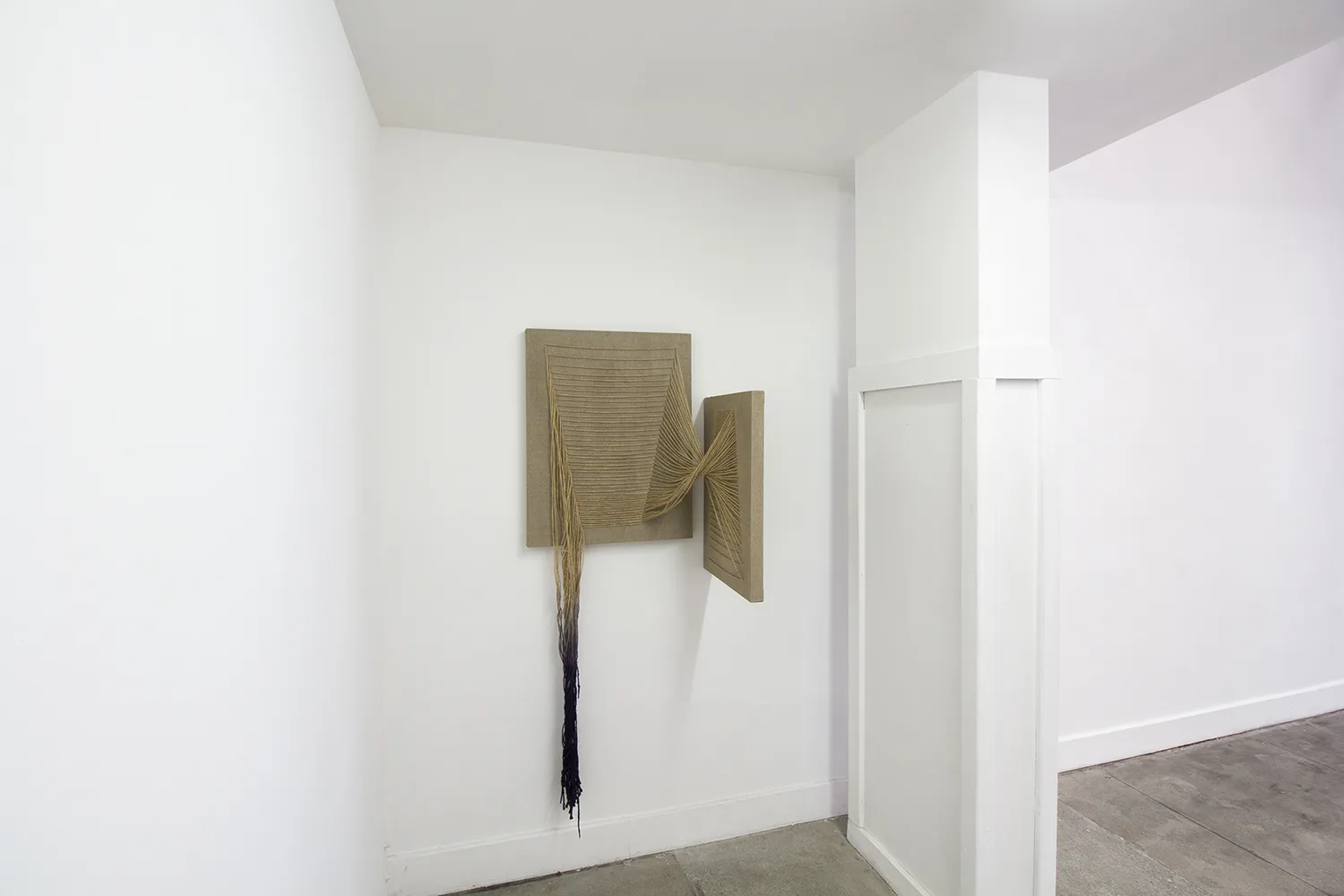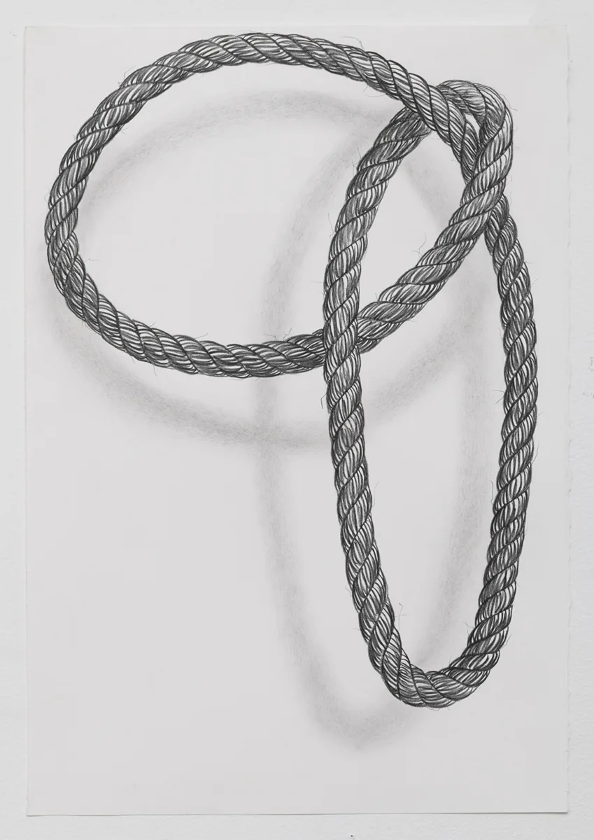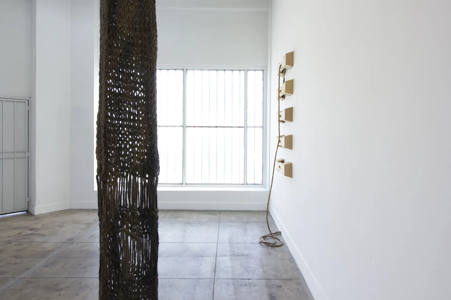 The central focus of Parducci’s exhibition consists of twenty-three 16’, hand-knit jute pillars spanning from floor to ceiling. Arranged in a staggered grid measuring approximately 14 feet square, they reference the twenty-three interior columns of the Parthenon that surrounded the monumental statue of Athena. Over the two years Parducci spent knitting these pillars, she considered the gendered aspects of labor, and the symbolic significance of the physical remnants of Western history. Appearing, but failing to be structurally supportive, Parducci’s knit columns, along with related sculptures and drawings, address the dual nature of societies that build, and then ultimately destroy themselves. Through the substitution of a traditionally feminine craft as the means of production, Parducci considers these recurring cycles in history and wonders about the possibilities of a society built from a female perspective.