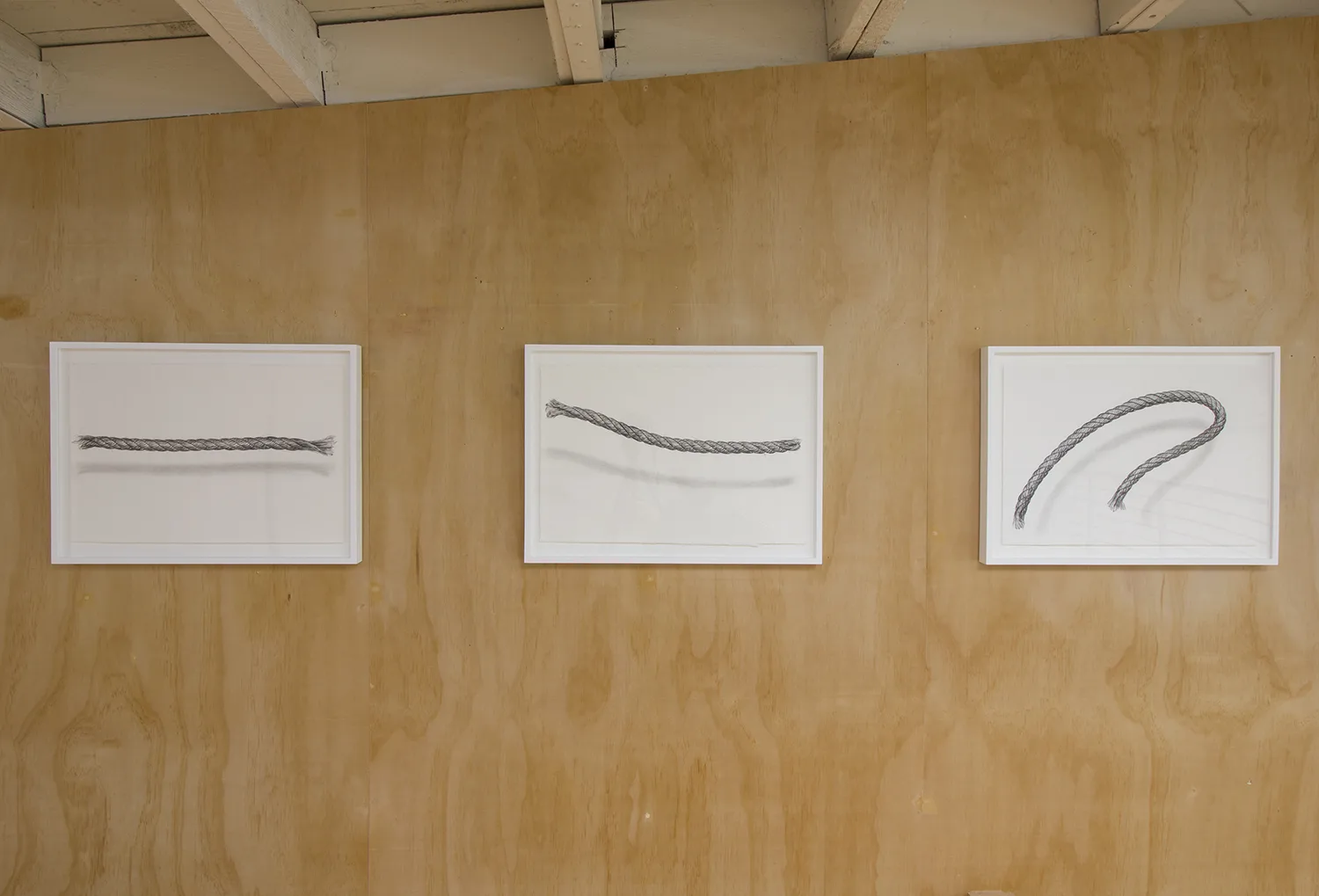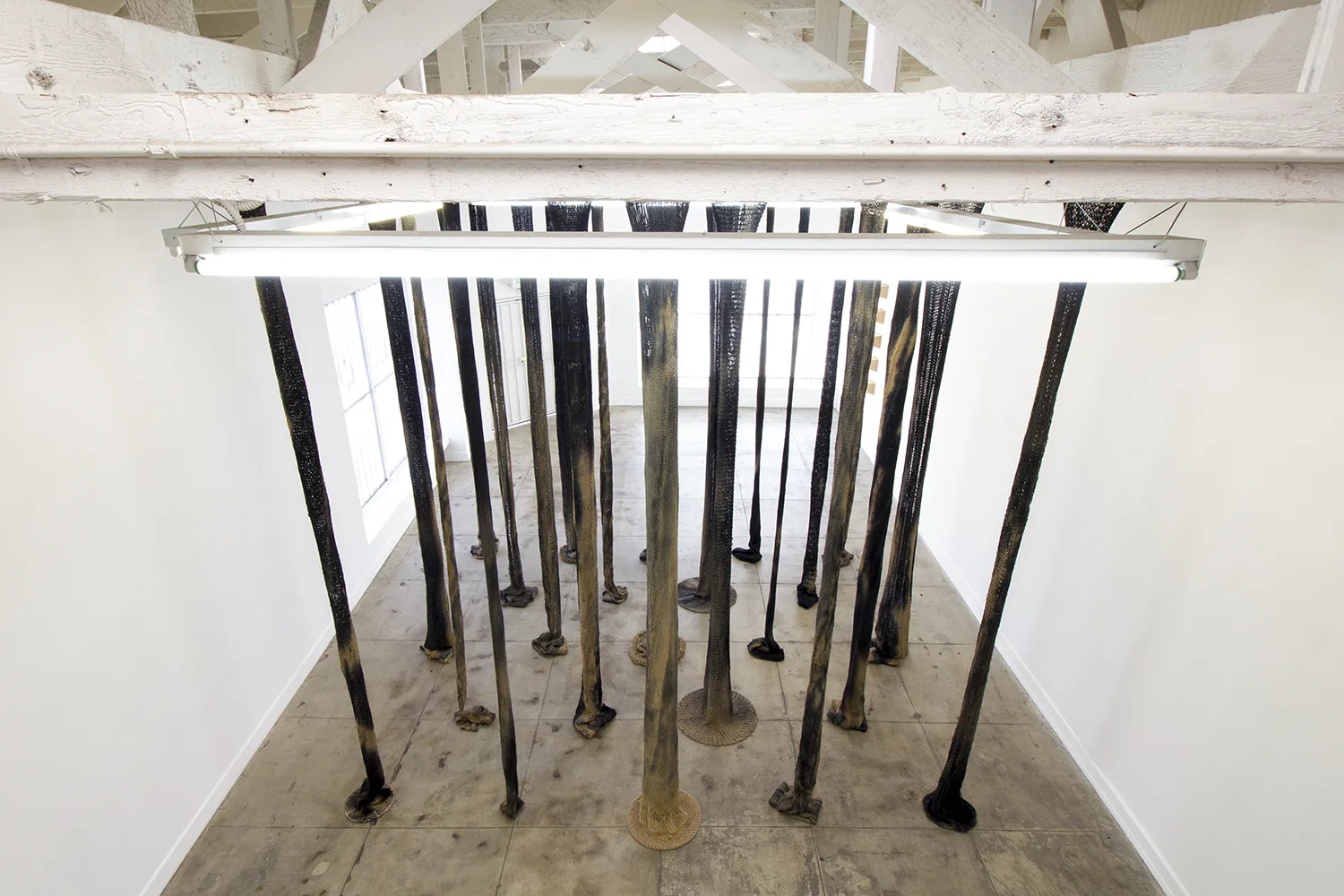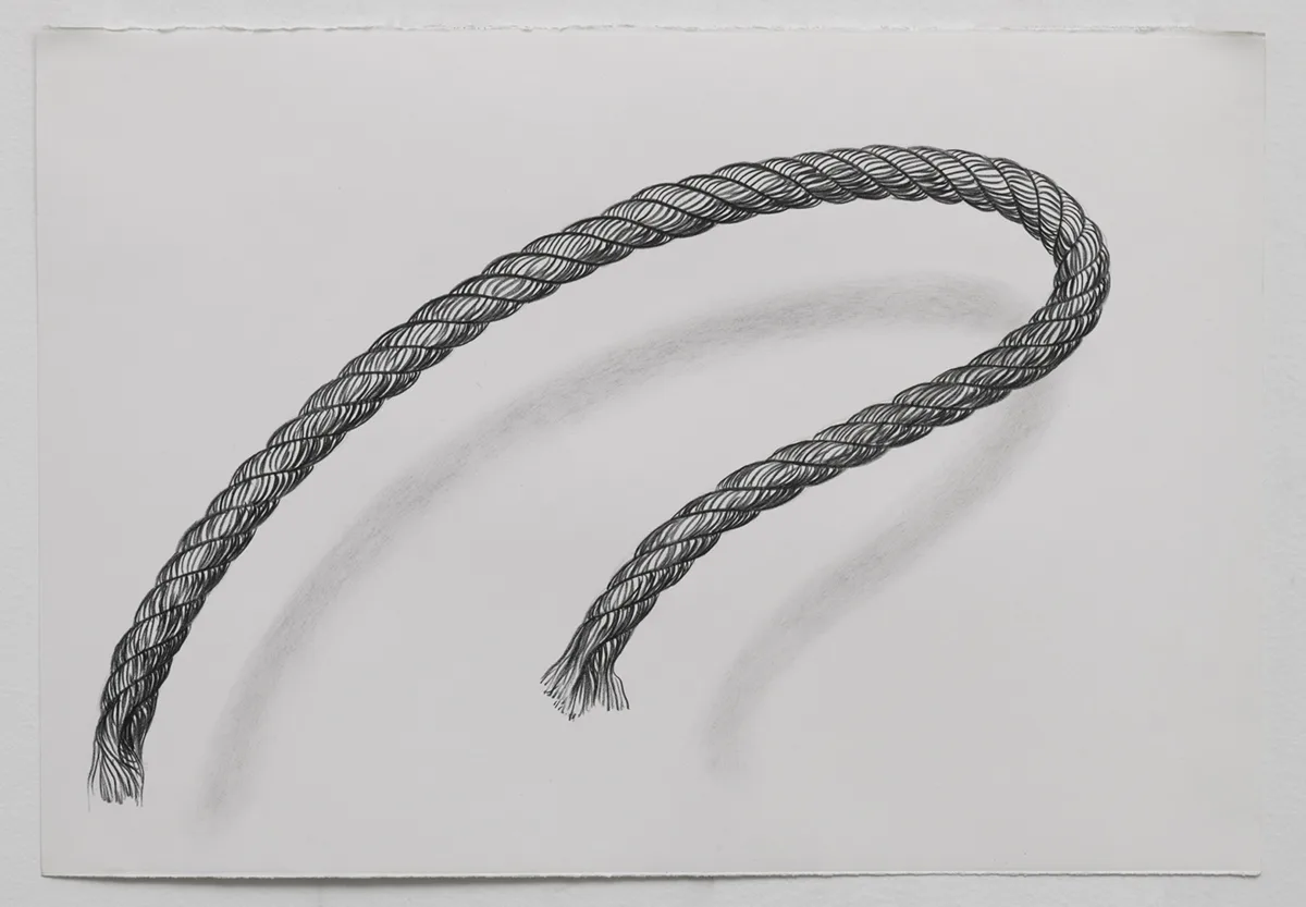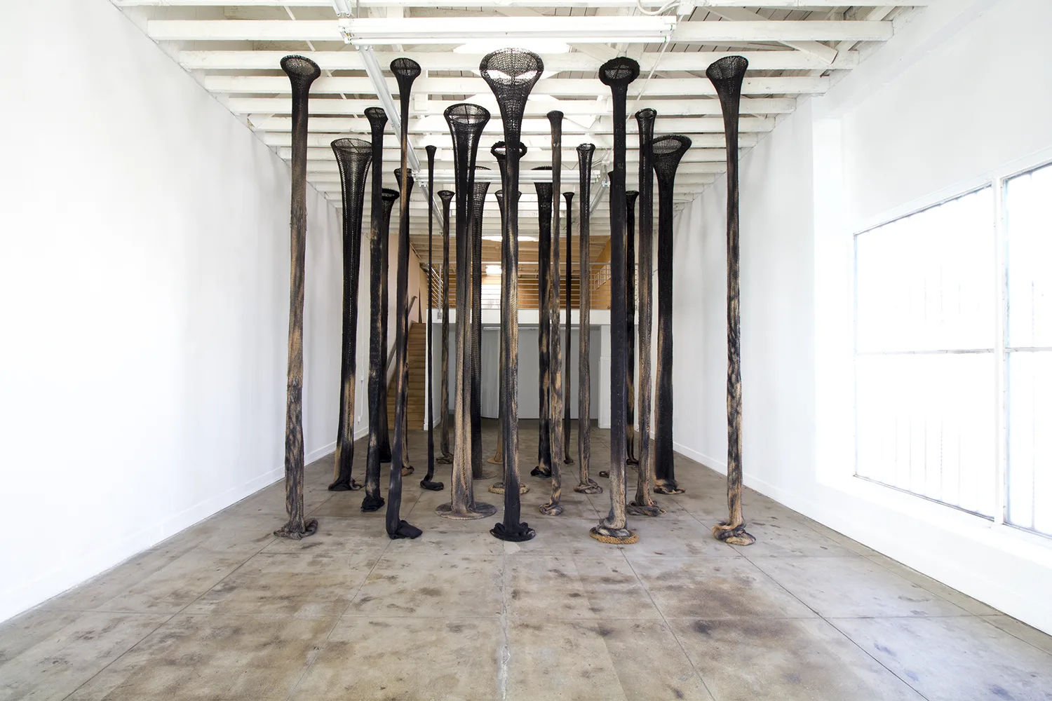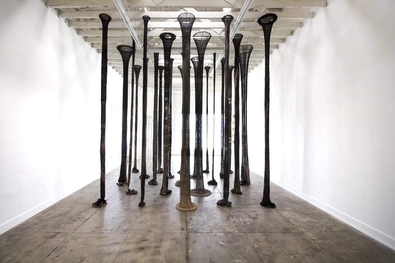 The central focus of Parducci’s exhibition consists of twenty-three 16’, hand-knit jute pillars spanning from floor to ceiling. Arranged in a staggered grid measuring approximately 14 feet square, they reference the twenty-three interior columns of the Parthenon that surrounded the monumental statue of Athena. Over the two years Parducci spent knitting these pillars, she considered the gendered aspects of labor, and the symbolic significance of the physical remnants of Western history. Appearing, but failing to be structurally supportive, Parducci’s knit columns, along with related sculptures and drawings, address the dual nature of societies that build, and then ultimately destroy themselves. Through the substitution of a traditionally feminine craft as the means of production, Parducci considers these recurring cycles in history and wonders about the possibilities of a society built from a female perspective.