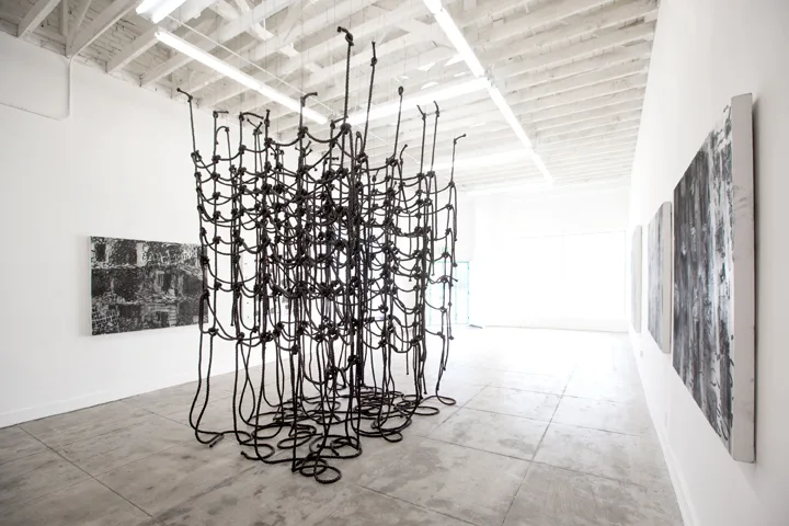 In The Space Between Us Parducci investigates images of disaster sites. This imagery signifies a continued investigation of prior concerns as Parducci has long been interested in the desperation that is born of catastrophe and violence. Her 2007-2011 “Survival Project” installation consisted of a tent in the shape of a larger than life gas mask among paintings, video and utilitarian objects, such as a survivalist manual. More recent paintings depict Morse code dots and dashes containing phrases such as, “Abandon All Hope,” “Save Me and I’ll Fuck You,” or “Await Verbal Instruction” overlaid across images of burning buildings. The Space Between Us originates specifically from images of the Murrah Federal Building attack from 1995 in Oklahoma City. Parducci draws visual parallels between the Murrah imagery and recent footage of disaster sites in the Middle East. Parducci addresses the intersection of personal referents of loss and the seemingly endless devastation that infuses our daily lives through media; our own experiences transform within the framework of these images. This large-scale project involves drawings, paintings and free hanging sculptural works made from rope that serve as visual testaments that expand and deepen the vernacular of tragedy and loss.