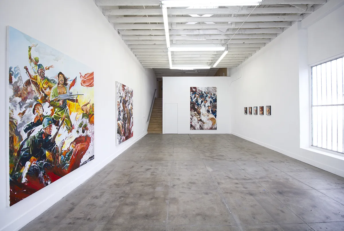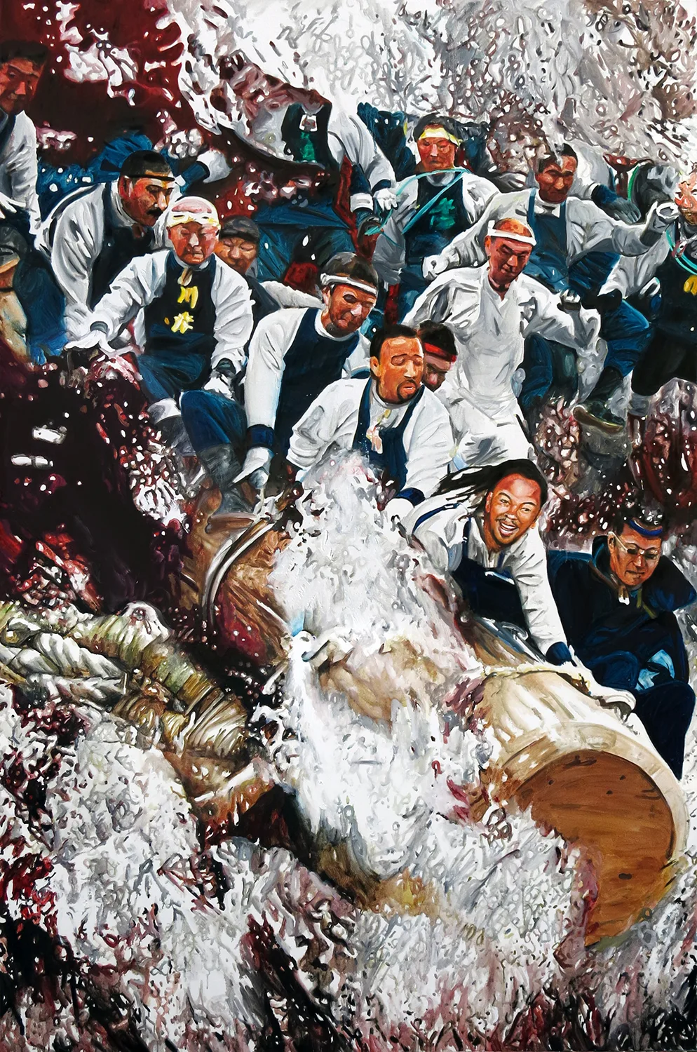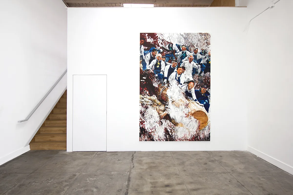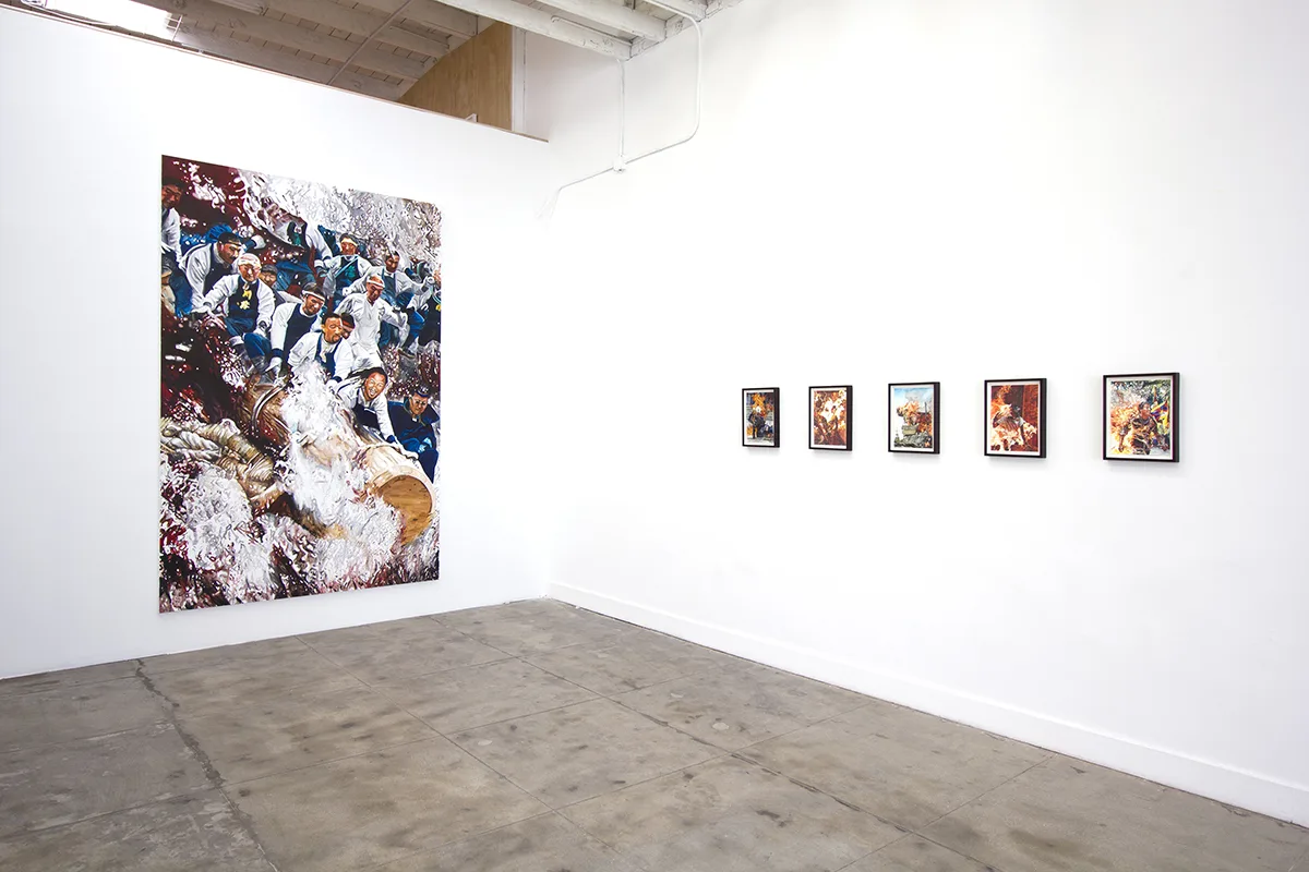 If traditional history painting extended into the era of fake news and virtual reality, it might well look like the world that Ruíz builds in this latest group of large-scale oil paintings and small watercolors. In Come Harder, a 9-foot-tall canvas, Ruíz gives his interpretation of the 1,200- year-old Japanese Onbashira Festival, where participants transport massive fir trunks to the shrines of Suwa. The event involves riding the logs down hills to demonstrate bravery, and participants are often injured or killed. Ruíz confounds images from the event with his own memory of riding Splash Mountain at Disneyland with a sexually frustrated crew of middle school friends. Rough Riders, a title that references Theodore Roosevelt, a hip-hop label and studded condoms, portrays a horse race crash, where jockeys and horses plummet into a climactic splash of red liquid, human and animal body parts. Another work, Black, Red and Deadly, combines a North Korean propaganda painting with elements from a video game; the painting’s bare-chested central figure grins widely while holding a machine gun. Part reality and part parody, the works are terrifying and preposterous in their depiction of masculinity taken to the extreme.