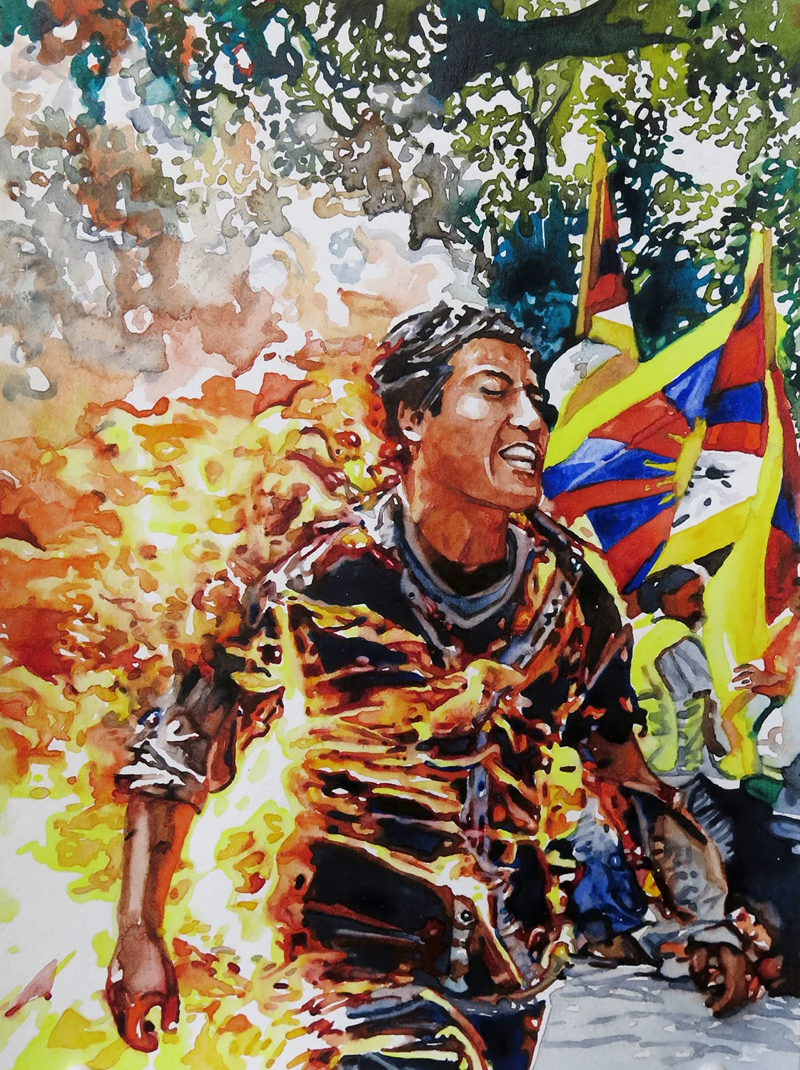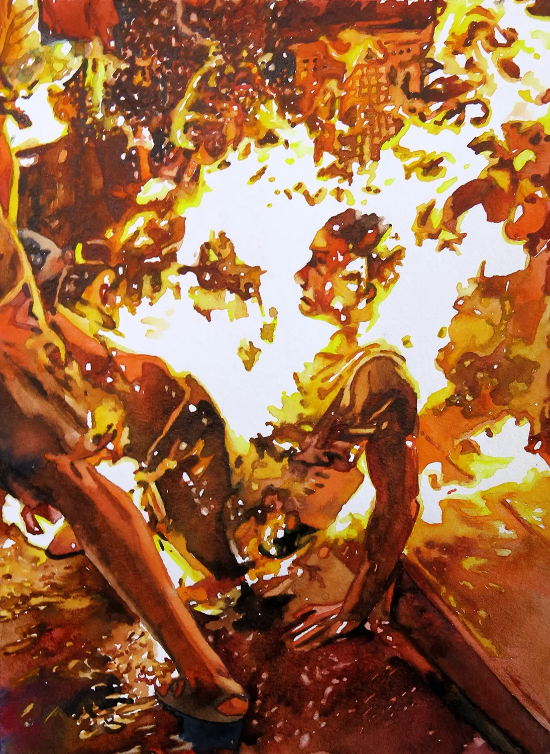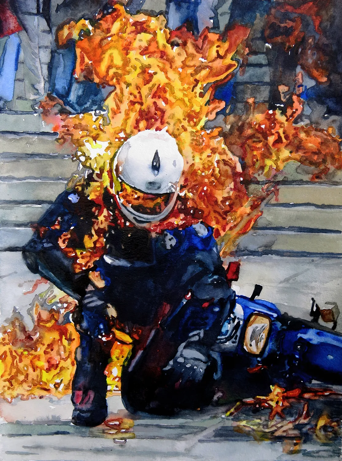 If traditional history painting extended into the era of fake news and virtual reality, it might well look like the world that Ruíz builds in this latest group of large-scale oil paintings and small watercolors. In Come Harder, a 9-foot-tall canvas, Ruíz gives his interpretation of the 1,200- year-old Japanese Onbashira Festival, where participants transport massive fir trunks to the shrines of Suwa. The event involves riding the logs down hills to demonstrate bravery, and participants are often injured or killed. Ruíz confounds images from the event with his own memory of riding Splash Mountain at Disneyland with a sexually frustrated crew of middle school friends. Rough Riders, a title that references Theodore Roosevelt, a hip-hop label and studded condoms, portrays a horse race crash, where jockeys and horses plummet into a climactic splash of red liquid, human and animal body parts. Another work, Black, Red and Deadly, combines a North Korean propaganda painting with elements from a video game; the painting’s bare-chested central figure grins widely while holding a machine gun. Part reality and part parody, the works are terrifying and preposterous in their depiction of masculinity taken to the extreme.