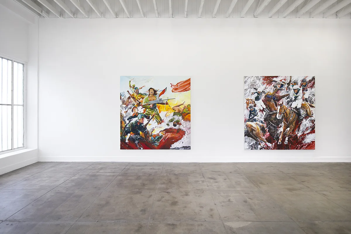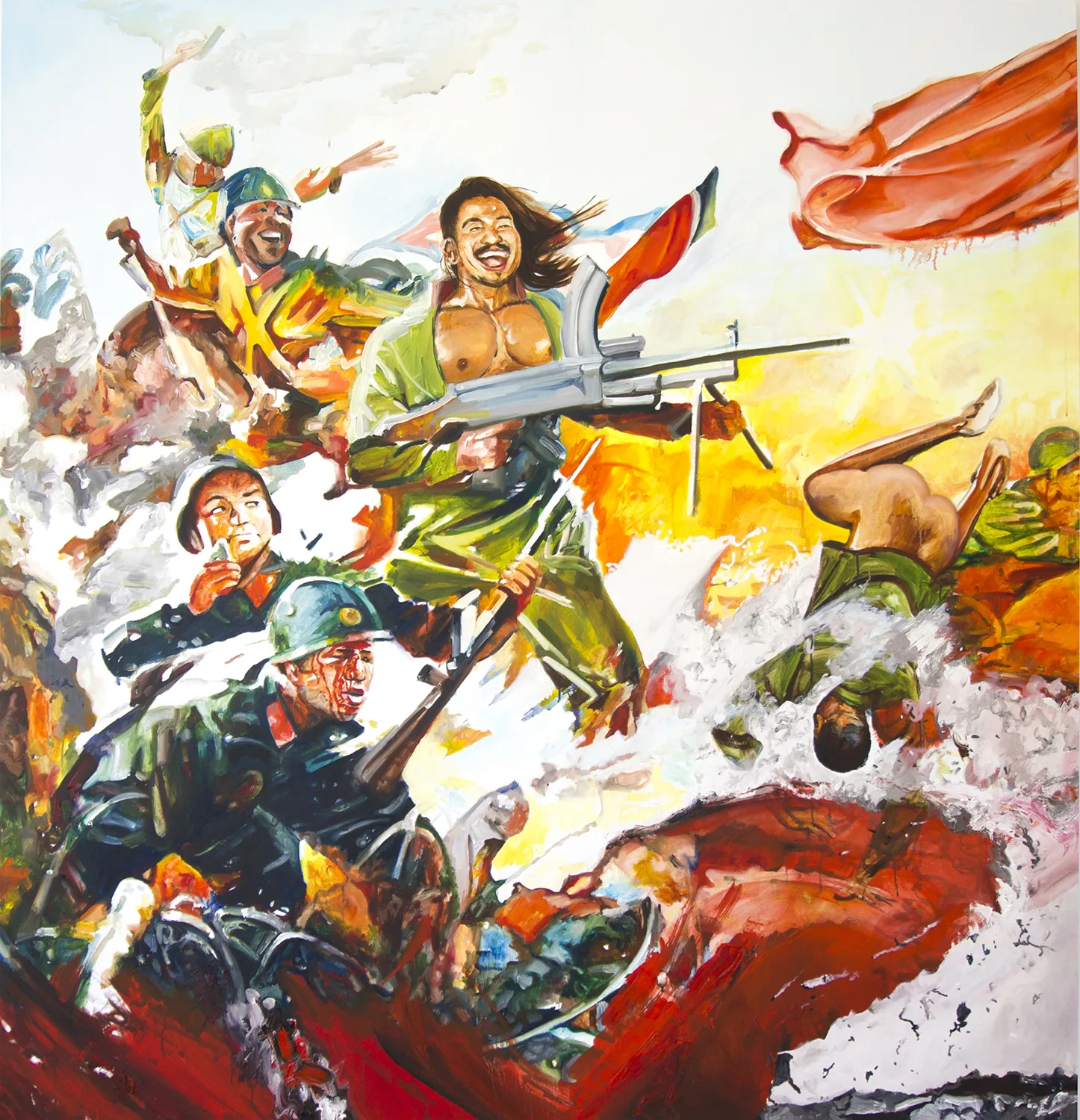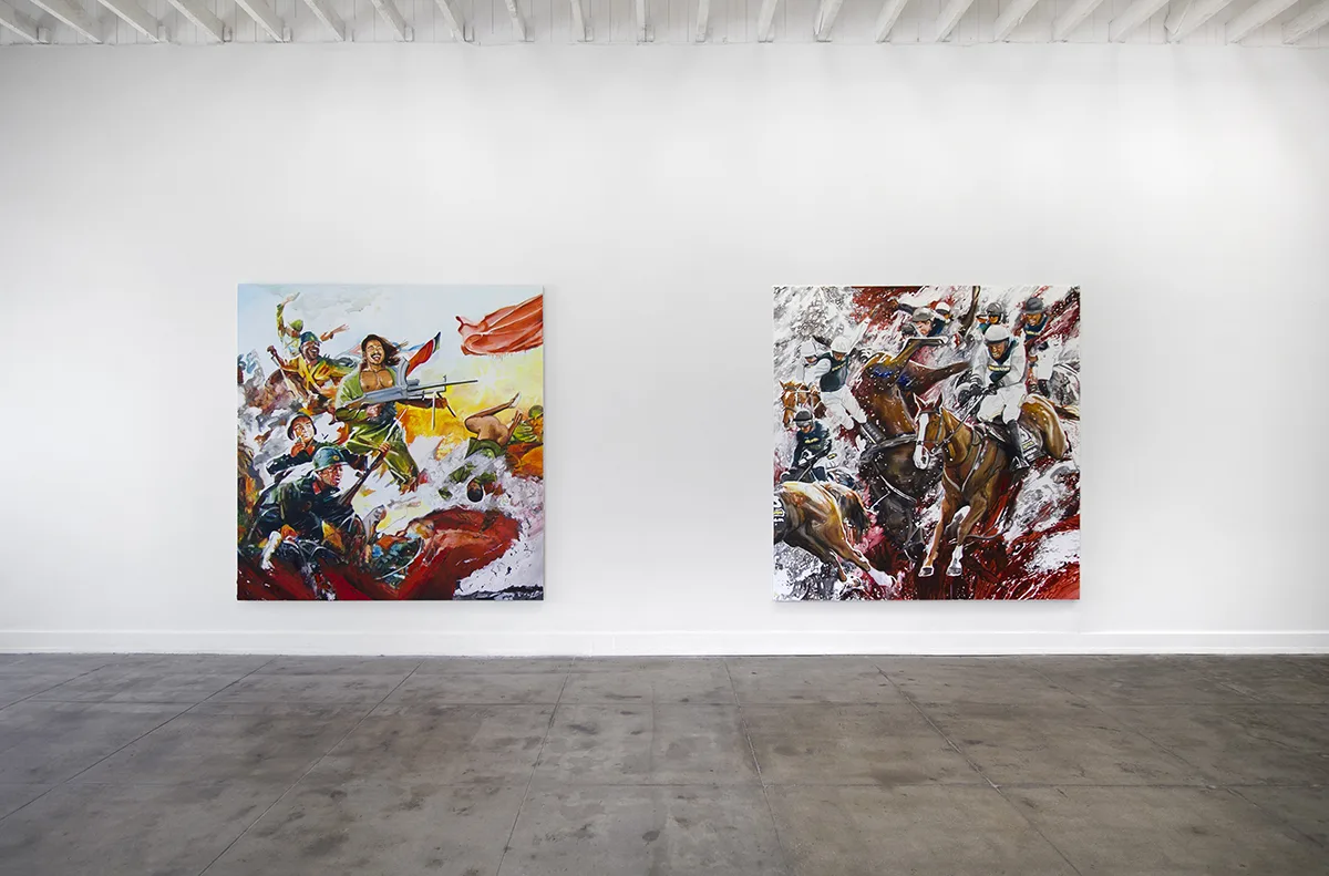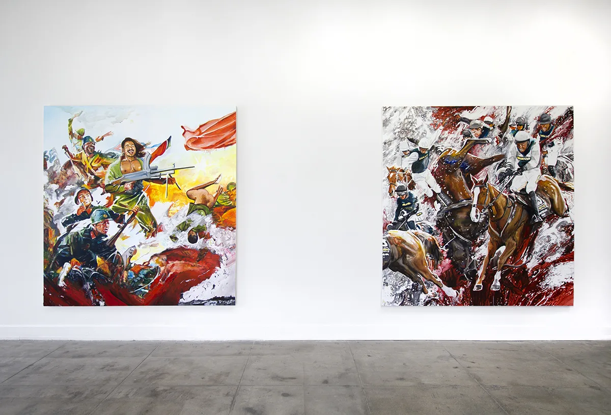 Throughout the exhibition we see bloodied, gun-toting macho men, almost cartoonish in their extreme, participating in representations of actual events. In each image, these groups of men are enveloped in an ecstatic, borderline erotic, moment as they’re swallowed by an admonishing red wave that embodies excitement and terror.