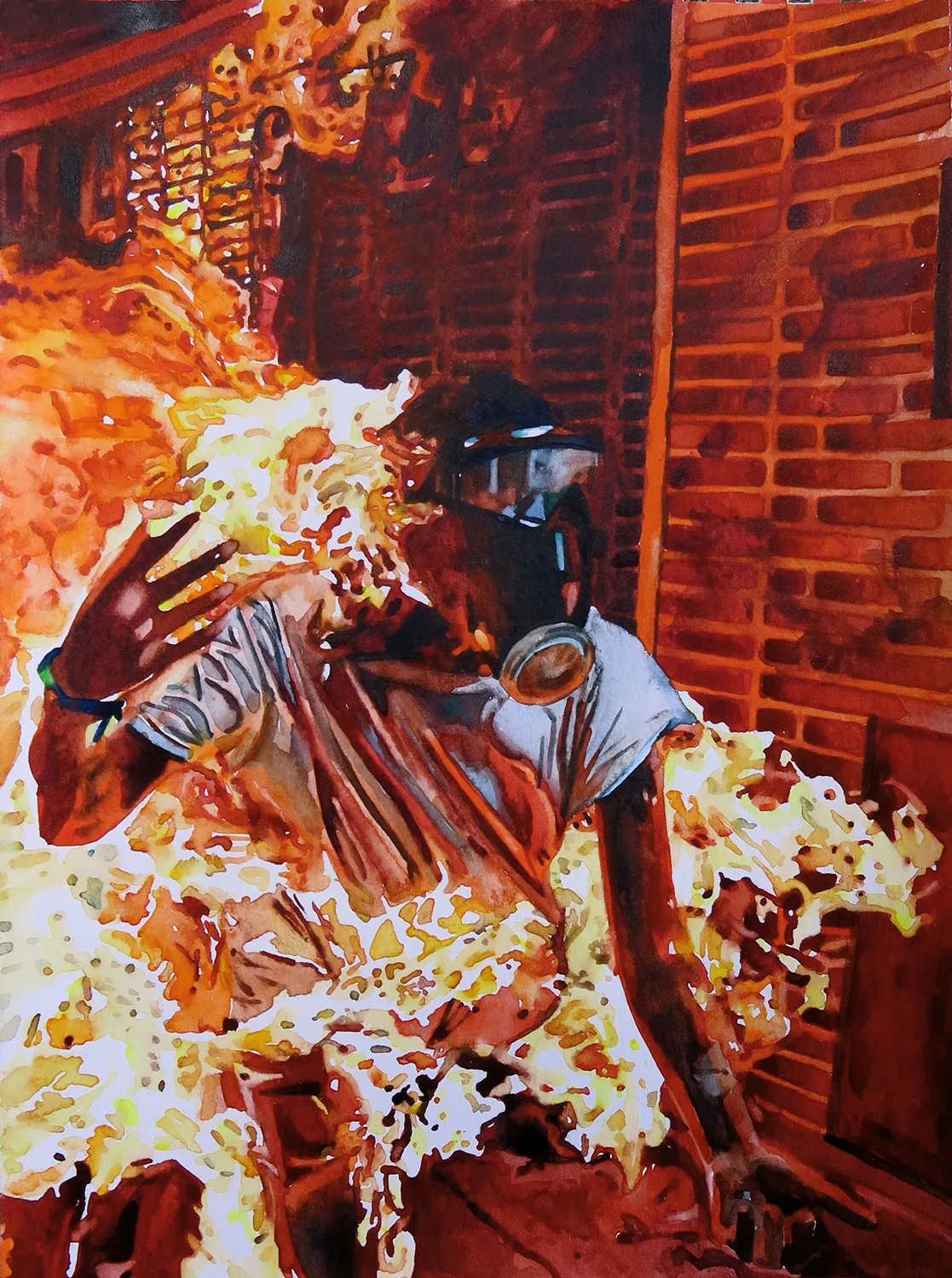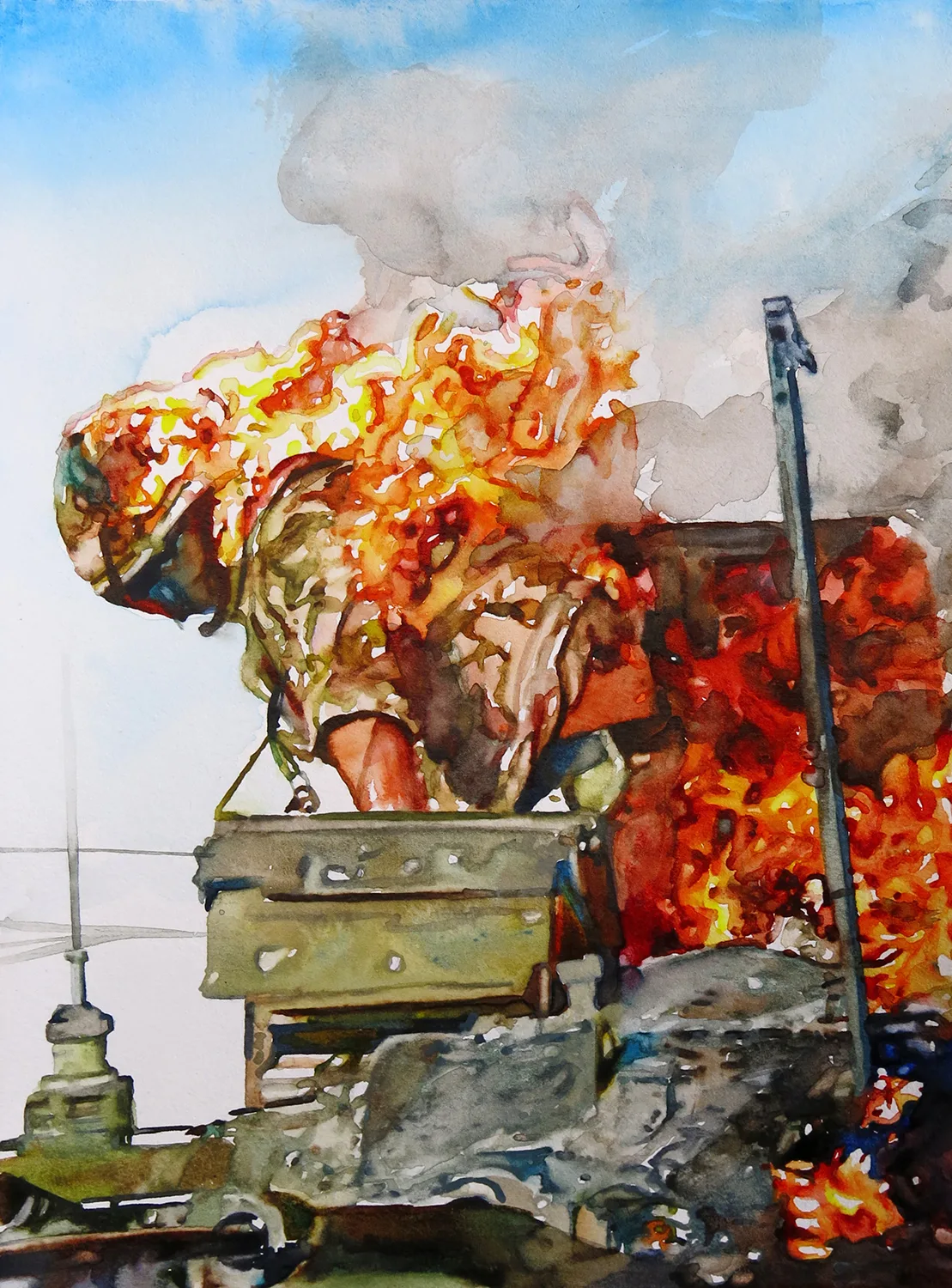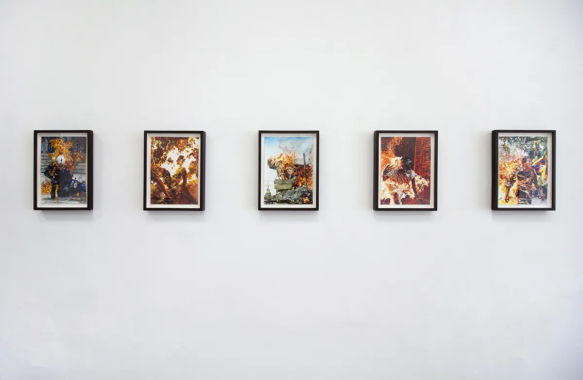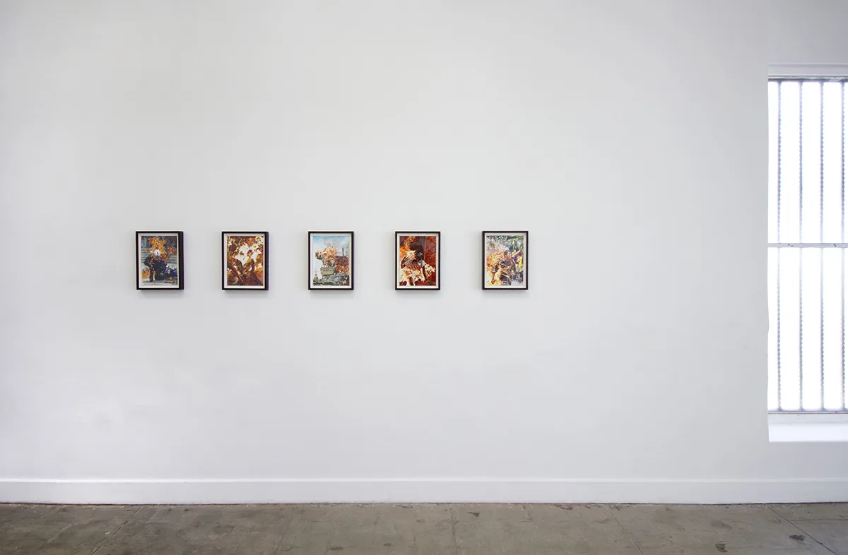 Throughout the exhibition we see bloodied, gun-toting macho men, almost cartoonish in their extreme, participating in representations of actual events. In each image, these groups of men are enveloped in an ecstatic, borderline erotic, moment as they’re swallowed by an admonishing red wave that embodies excitement and terror.