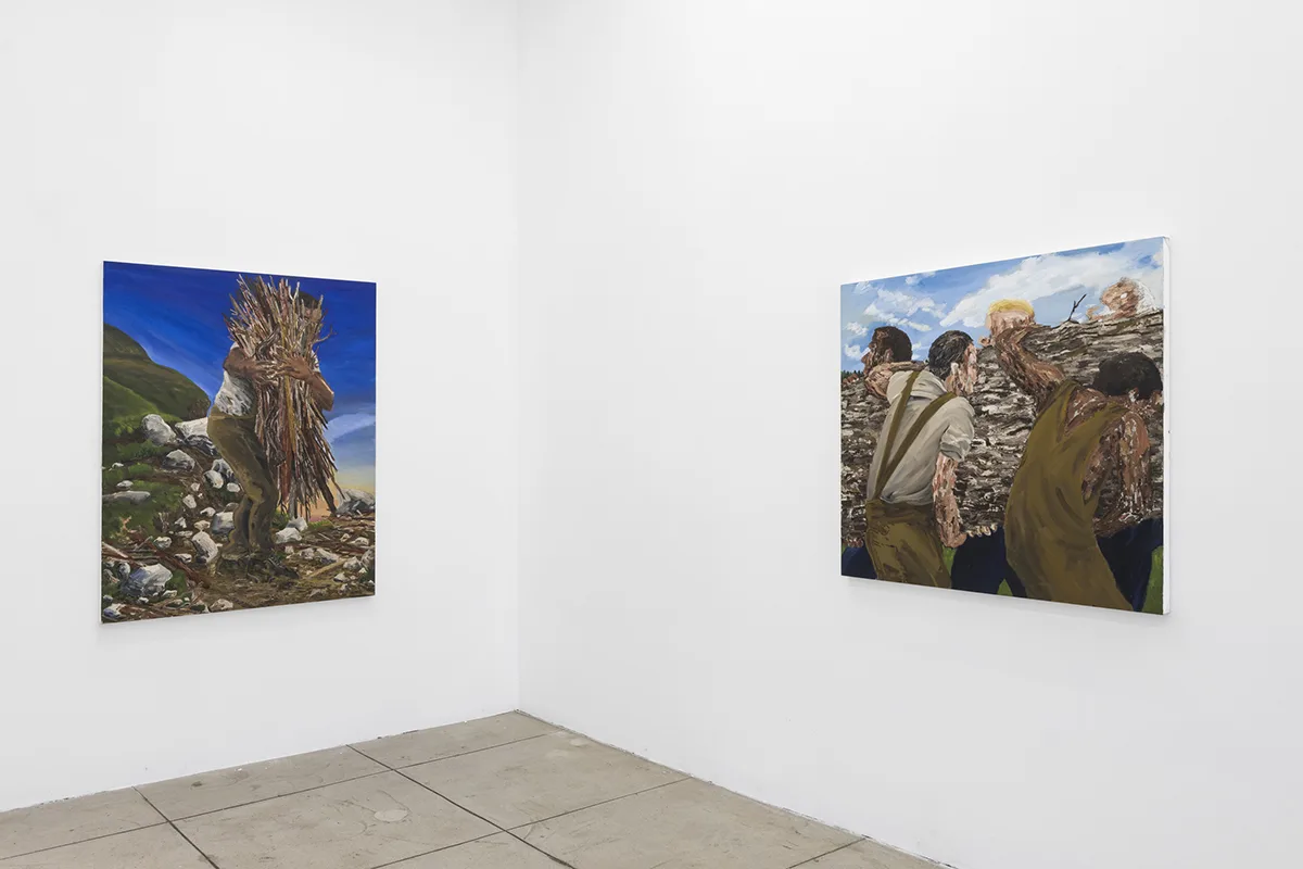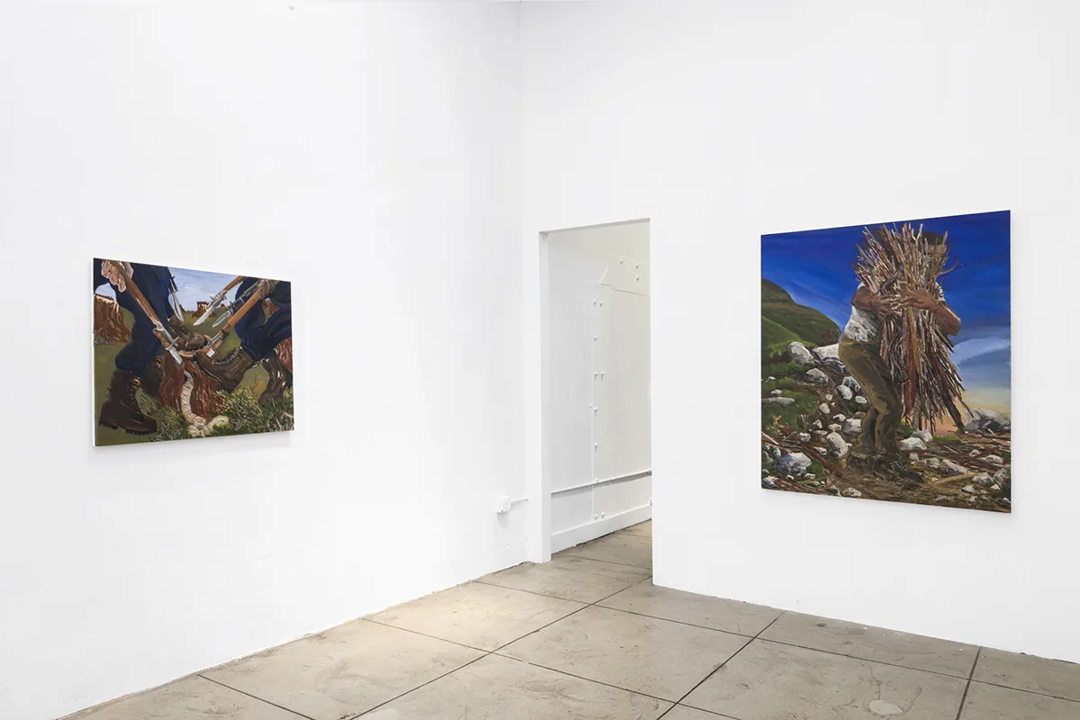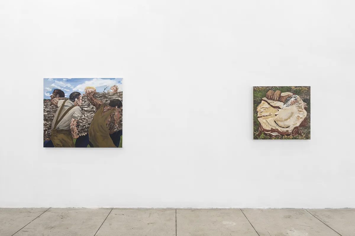 A painting shows a solitary figure carries an unwieldy bunch of sticks down a mountain as dusk sets inA painting depicting four figures with their features blurred kneeling over a stump. Another pair of hands enters the images from the left and is pulling a rope seemingly attached to the stump or something on the stump.Several men attempt to move a tree trunk too big to fit onto the canvasA painting shows another stump is being stomped and stabbed in an act of collective enforcement as a sand-colored snake escapes through a knot holeA painting depicting a stump. Place above the stump are two pair of hands. The left hand of the first figure is holding a small bird and the other pair of hands squeezing the left wrist of the other figure