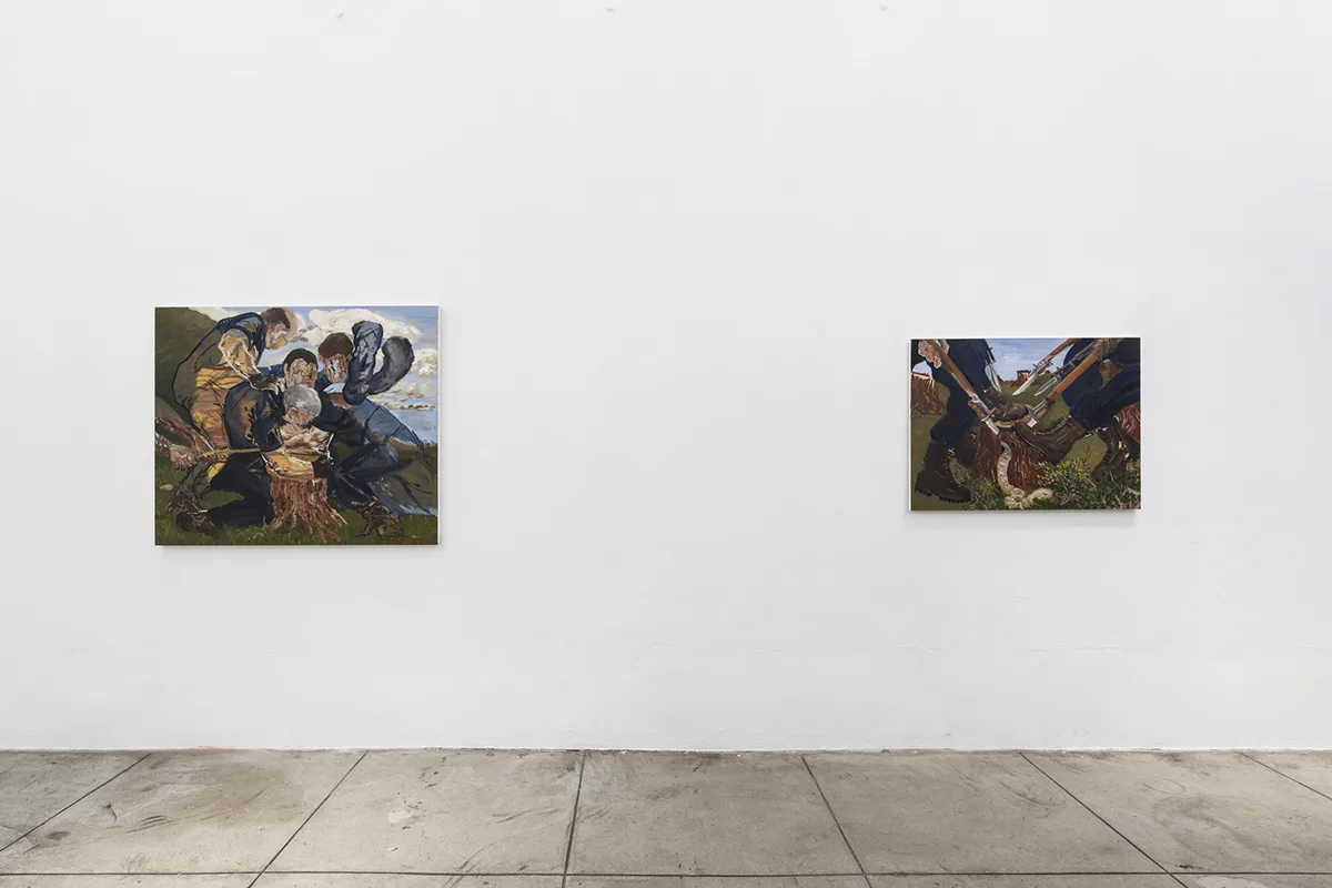 In the exhibition’s titular work, Quietly Persisting (2023), limbs tangle as figures endeavor to yank a stump from the ground. Though the leaves, branches, and trunk have already been removed and great force is being applied, the stump is immovable—anchored by roots hidden deep underground. In Boots & Bayonets (2023), another stump is stomped and stabbed in an act of collective enforcement as a sand-colored snake escapes through a knot hole. These scenes of perceived violence also celebrate persistence—stumps endure in these moments of grandiose intensity, akin to a turning point in which the mythical protagonist’s metaphorical armor is stripped to reveal true nature.