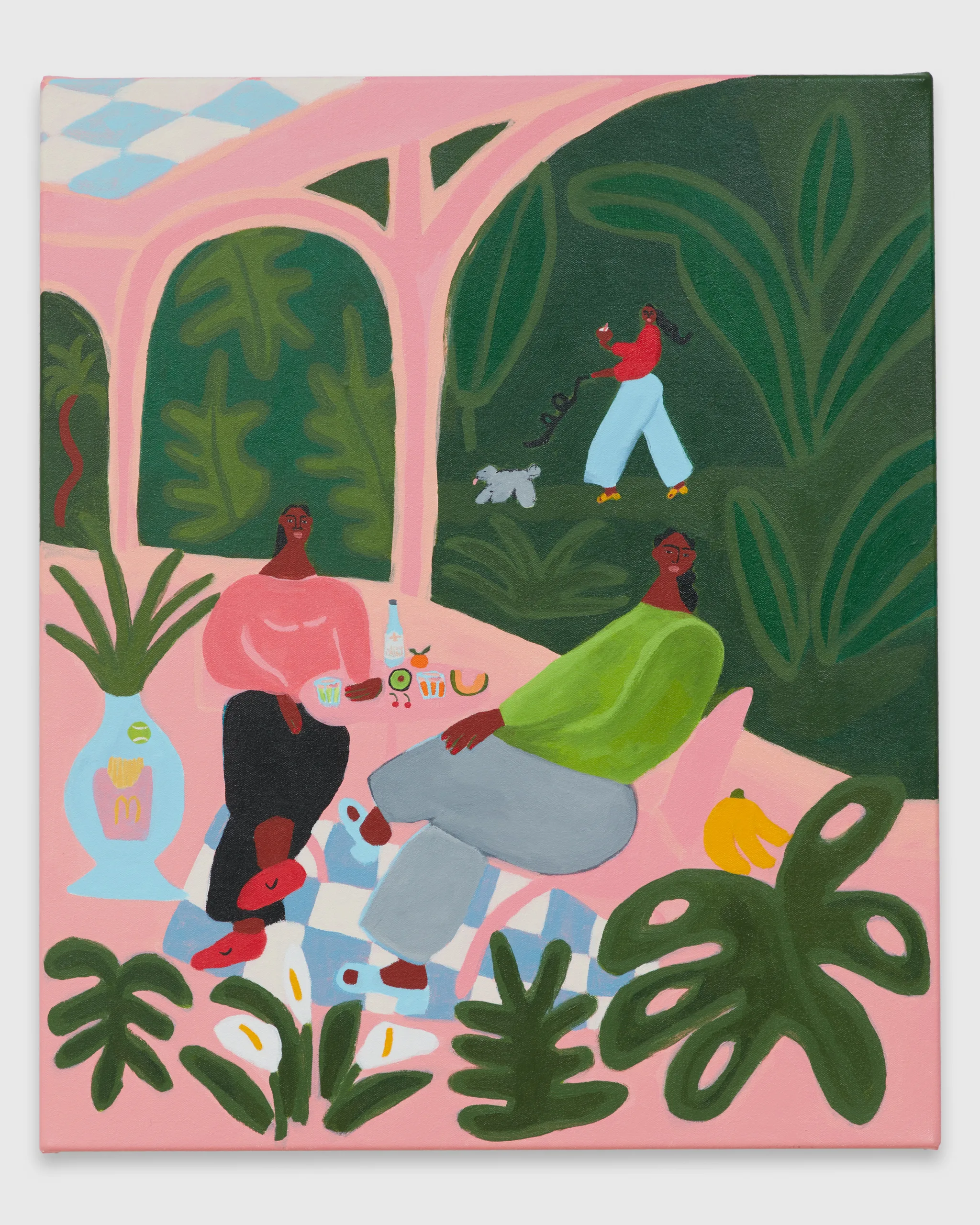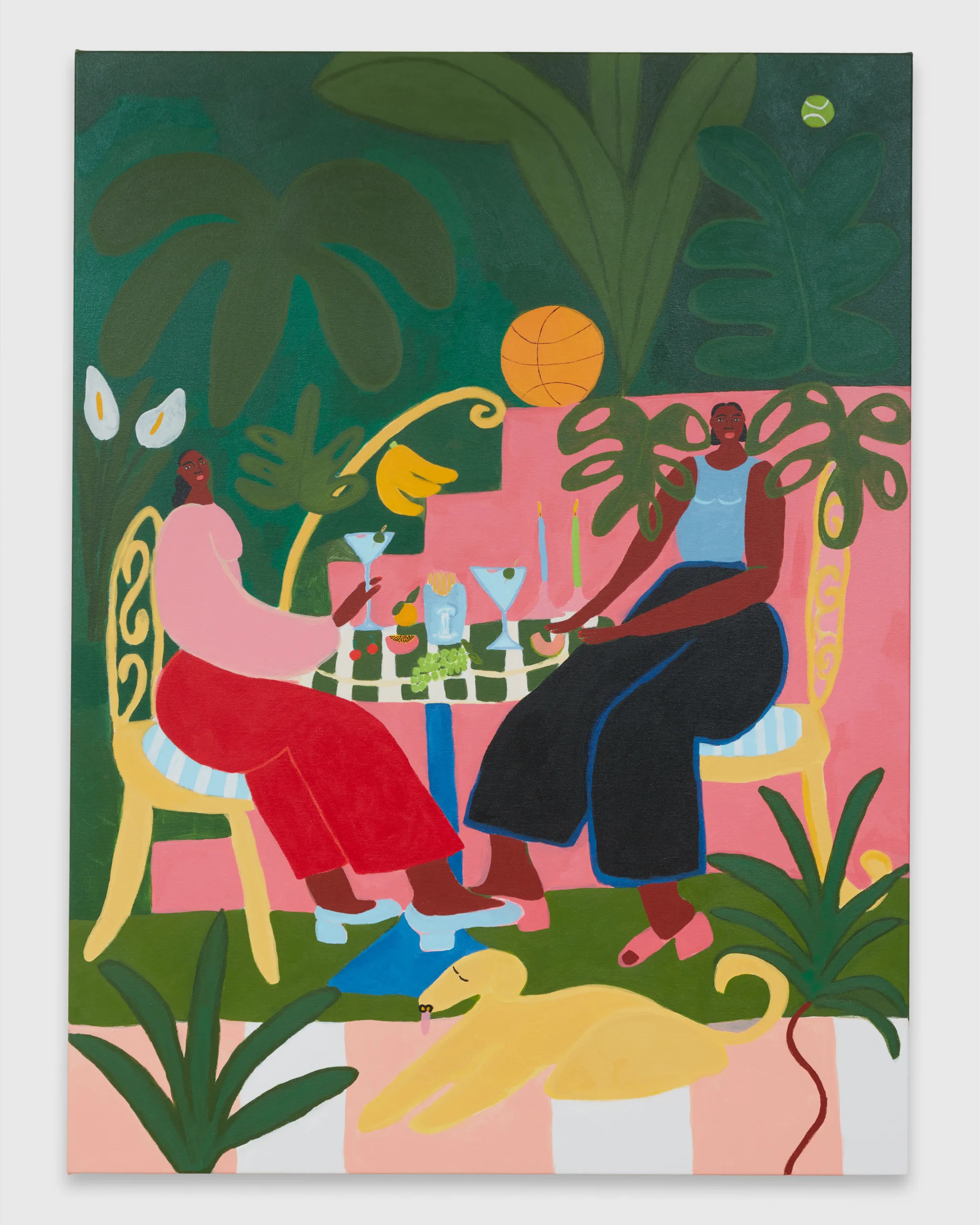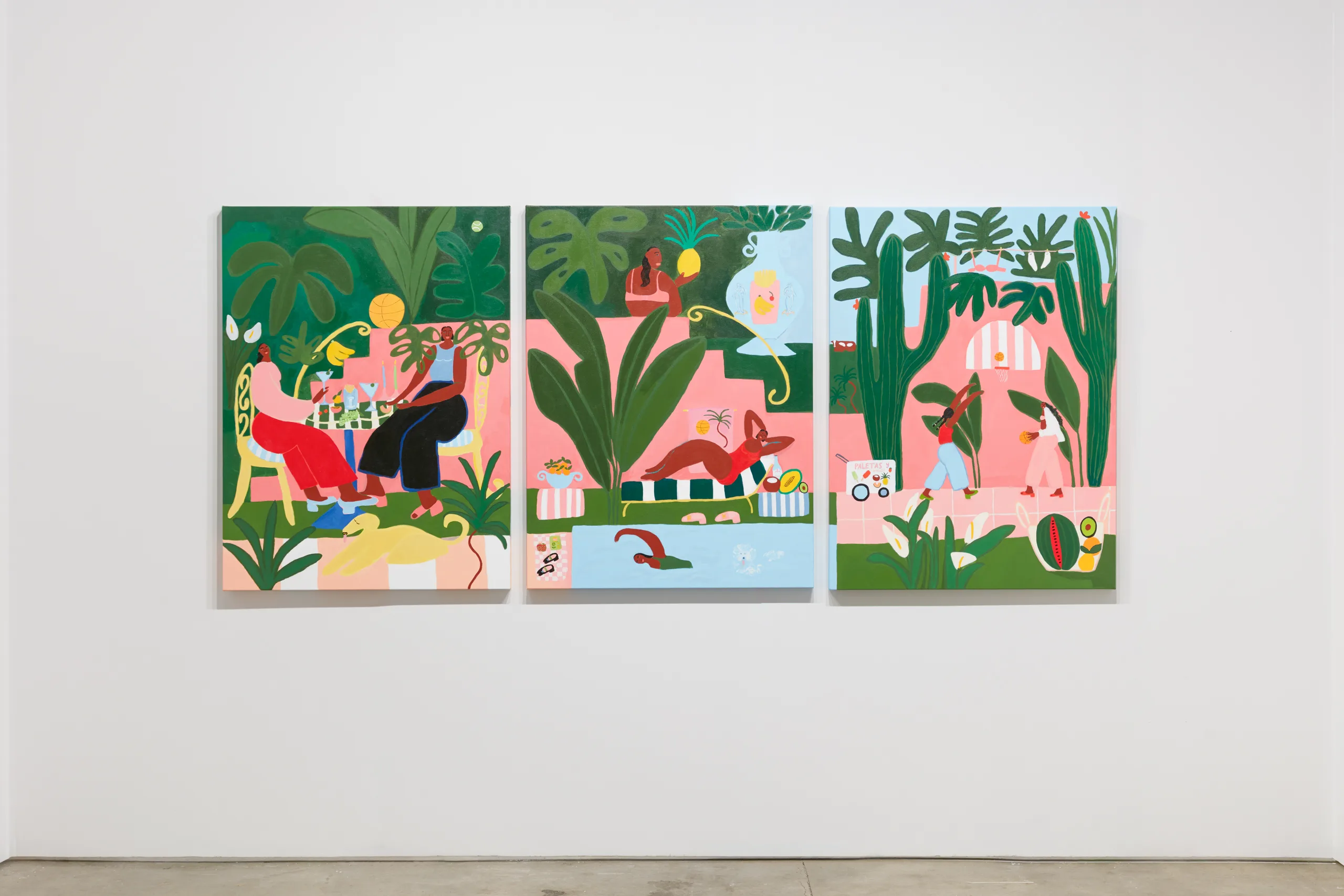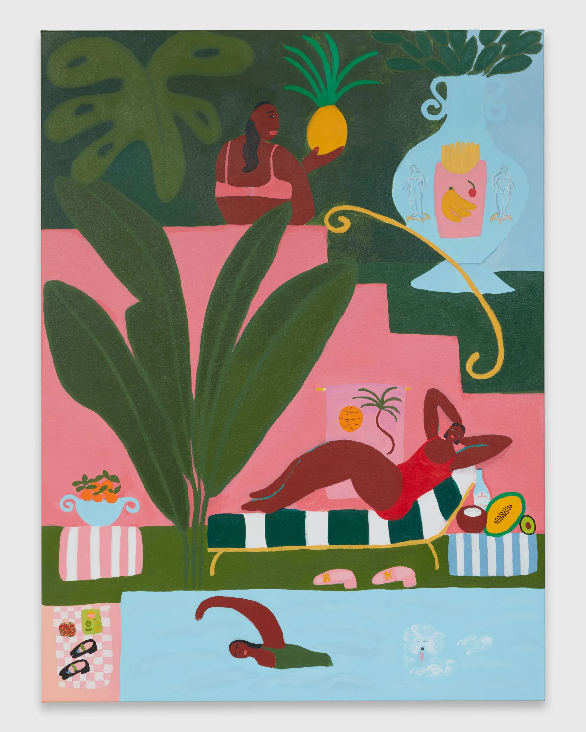 Lilian Martinez paints scenes that depict bright views of women at leisure. Her latest body of work, Sunlit Realism, identifies a playful space between representation and abstraction to explore a world of agency, creativity, comfort, and abundance. Martinez’ ladies indulge with friends, relax in the company of their dogs, and move their bodies in inviting pools and on community basketball courts. Subtle, inside jokes emerge in Martinez’ signature style–a pink bra air dries on a laundry line, French fries are served alongside martinis, a cow relaxes in the grass in the distance, and bananas float above a table filled with fruit and drinks. Martinez’ vignettes extend along the sides of each canvas – the opportunity to add charming details is never overlooked. “It’s delightful and unexpected,” comments Martinez, “these works are thoughtful and peaceful, and there’s humor in all of them.” Radiating warmth, Sunlit Realism embodies a collective desire for brown women to luxuriate peacefully, proffering positive representations of bodies like Martinez’ own to celebrate inclusivity and classlessness.
