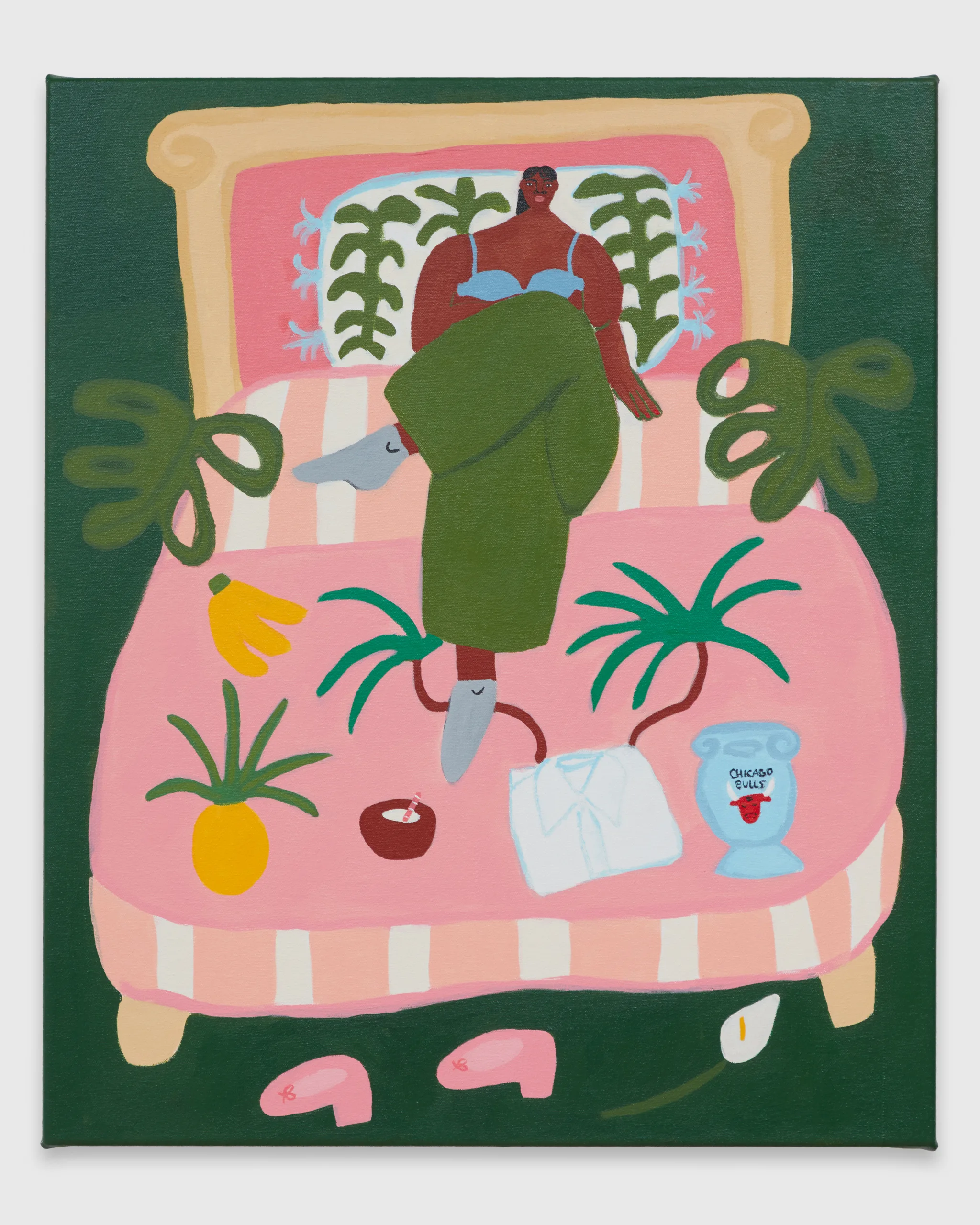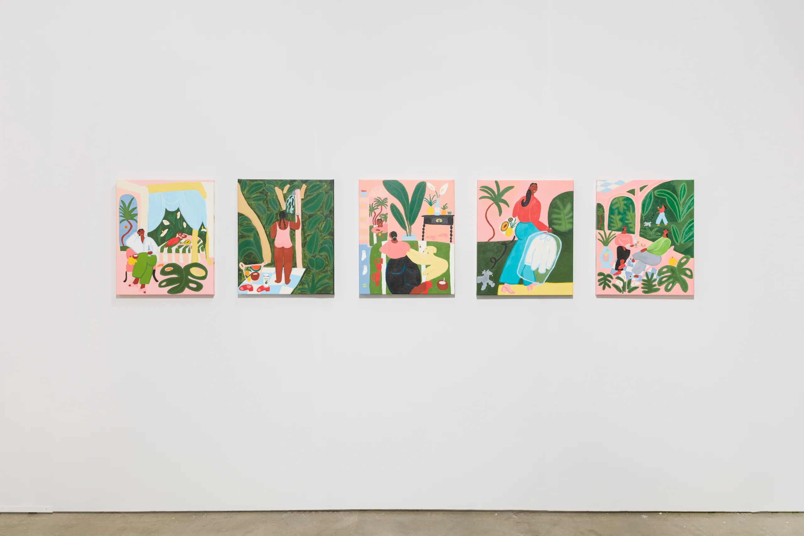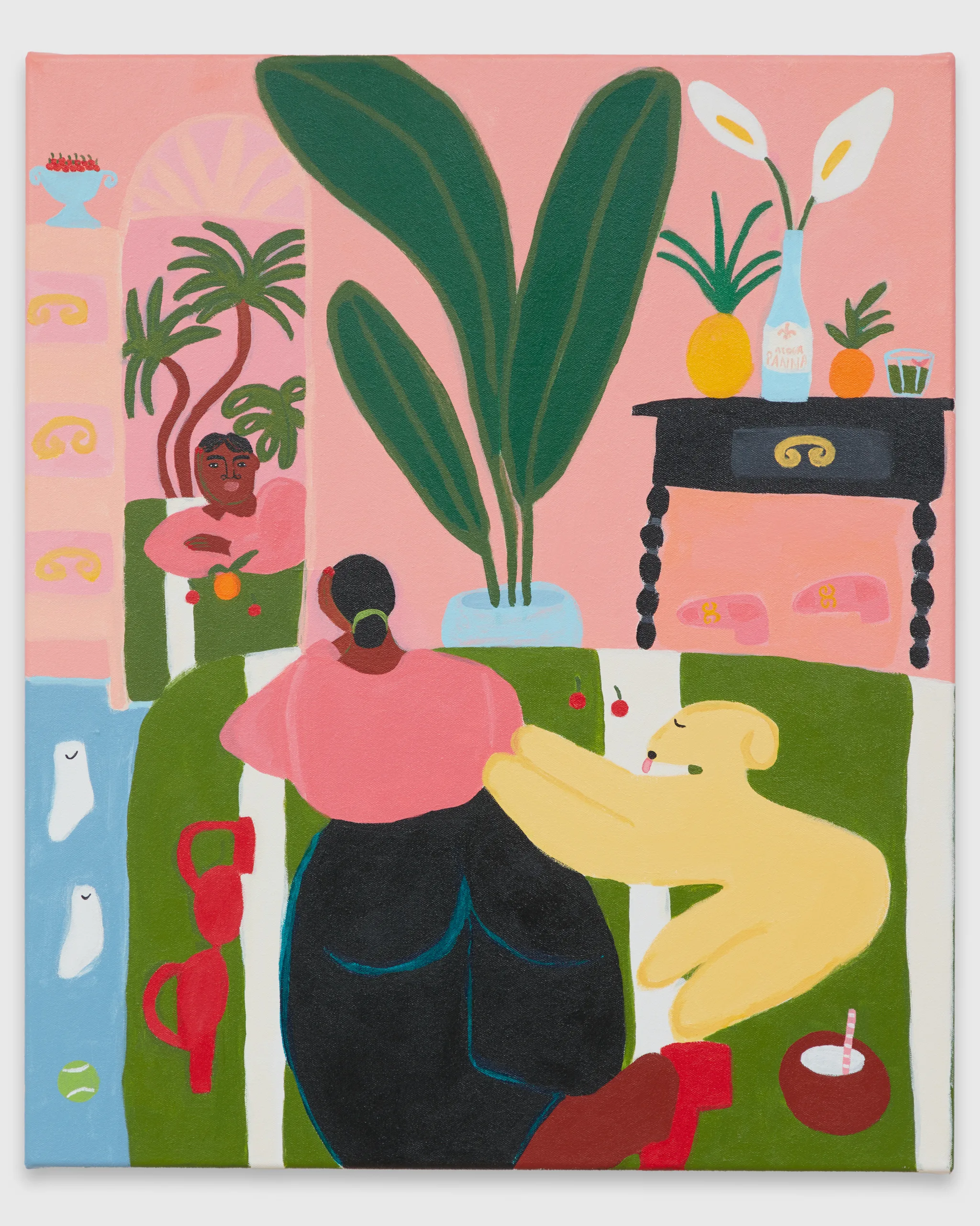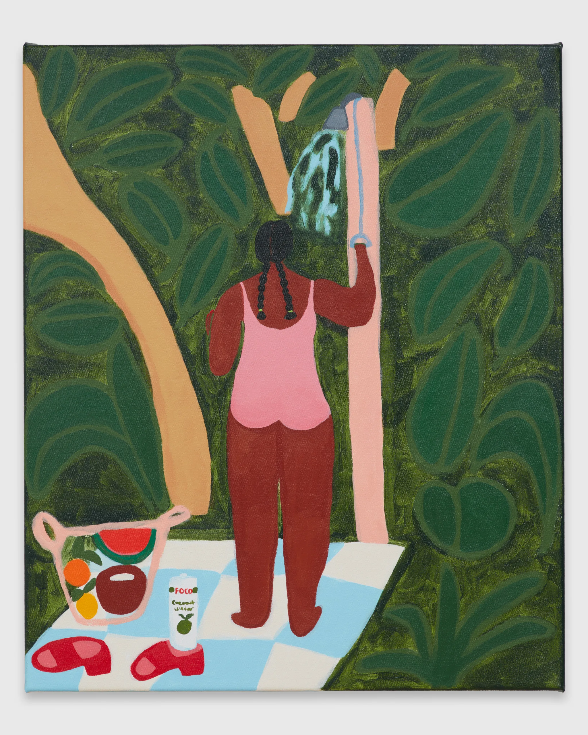 Lilian Martinez paints scenes that depict bright views of women at leisure. Her latest body of work, Sunlit Realism, identifies a playful space between representation and abstraction to explore a world of agency, creativity, comfort, and abundance. Martinez’ ladies indulge with friends, relax in the company of their dogs, and move their bodies in inviting pools and on community basketball courts. Subtle, inside jokes emerge in Martinez’ signature style–a pink bra air dries on a laundry line, French fries are served alongside martinis, a cow relaxes in the grass in the distance, and bananas float above a table filled with fruit and drinks. Martinez’ vignettes extend along the sides of each canvas – the opportunity to add charming details is never overlooked. “It’s delightful and unexpected,” comments Martinez, “these works are thoughtful and peaceful, and there’s humor in all of them.” Radiating warmth, Sunlit Realism embodies a collective desire for brown women to luxuriate peacefully, proffering positive representations of bodies like Martinez’ own to celebrate inclusivity and classlessness.