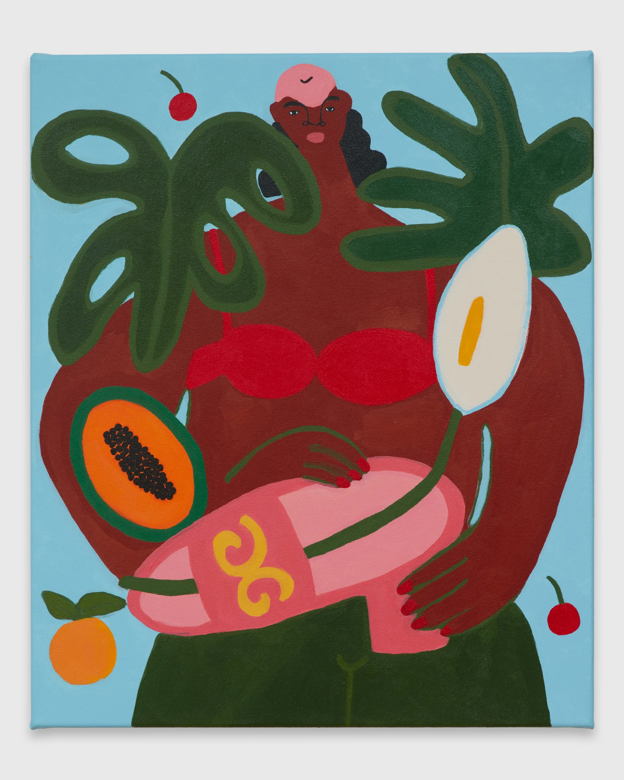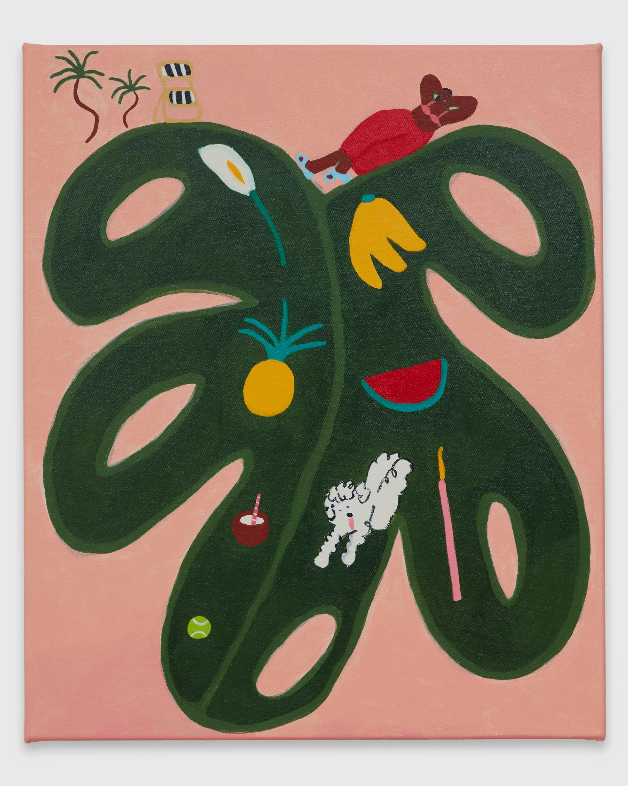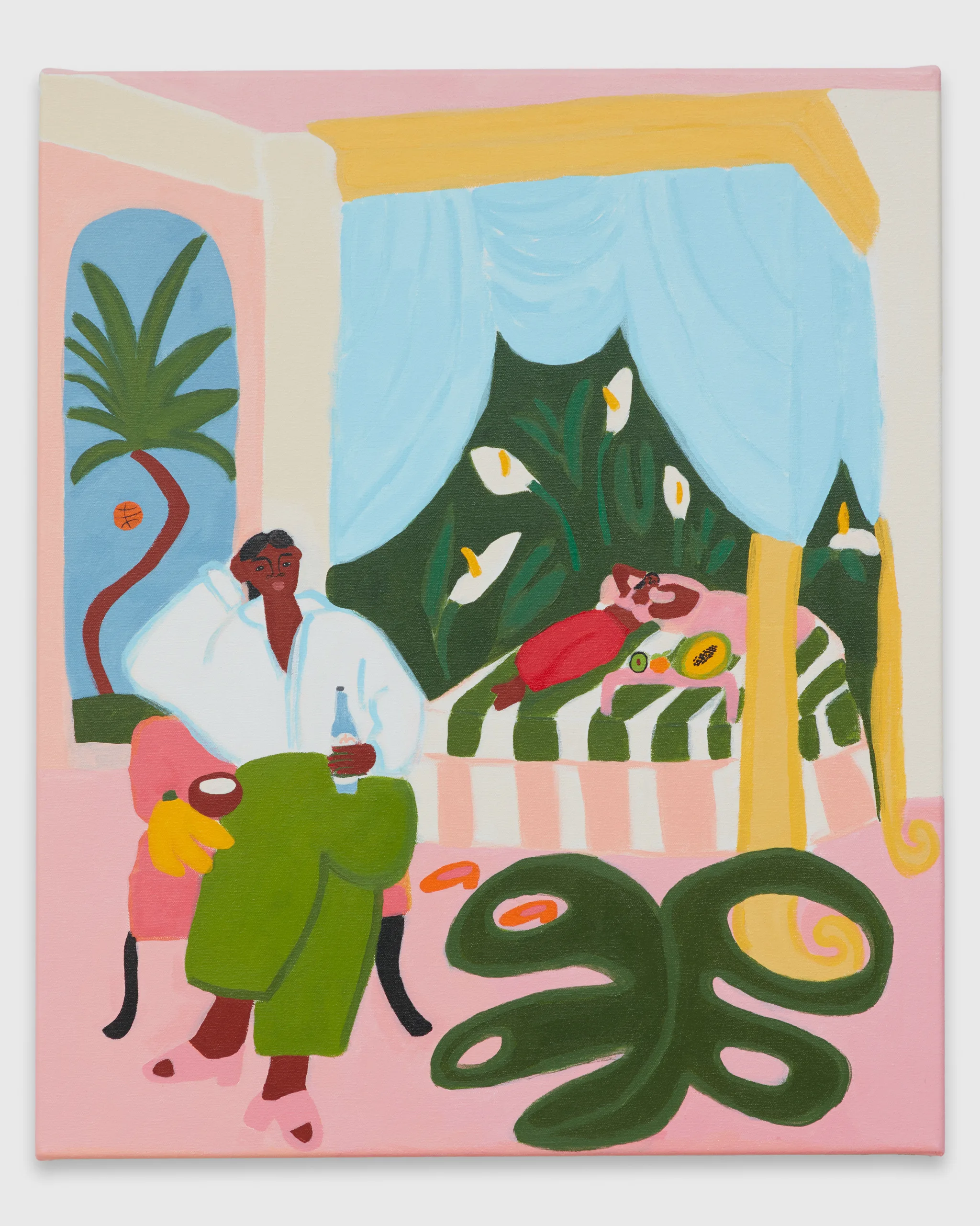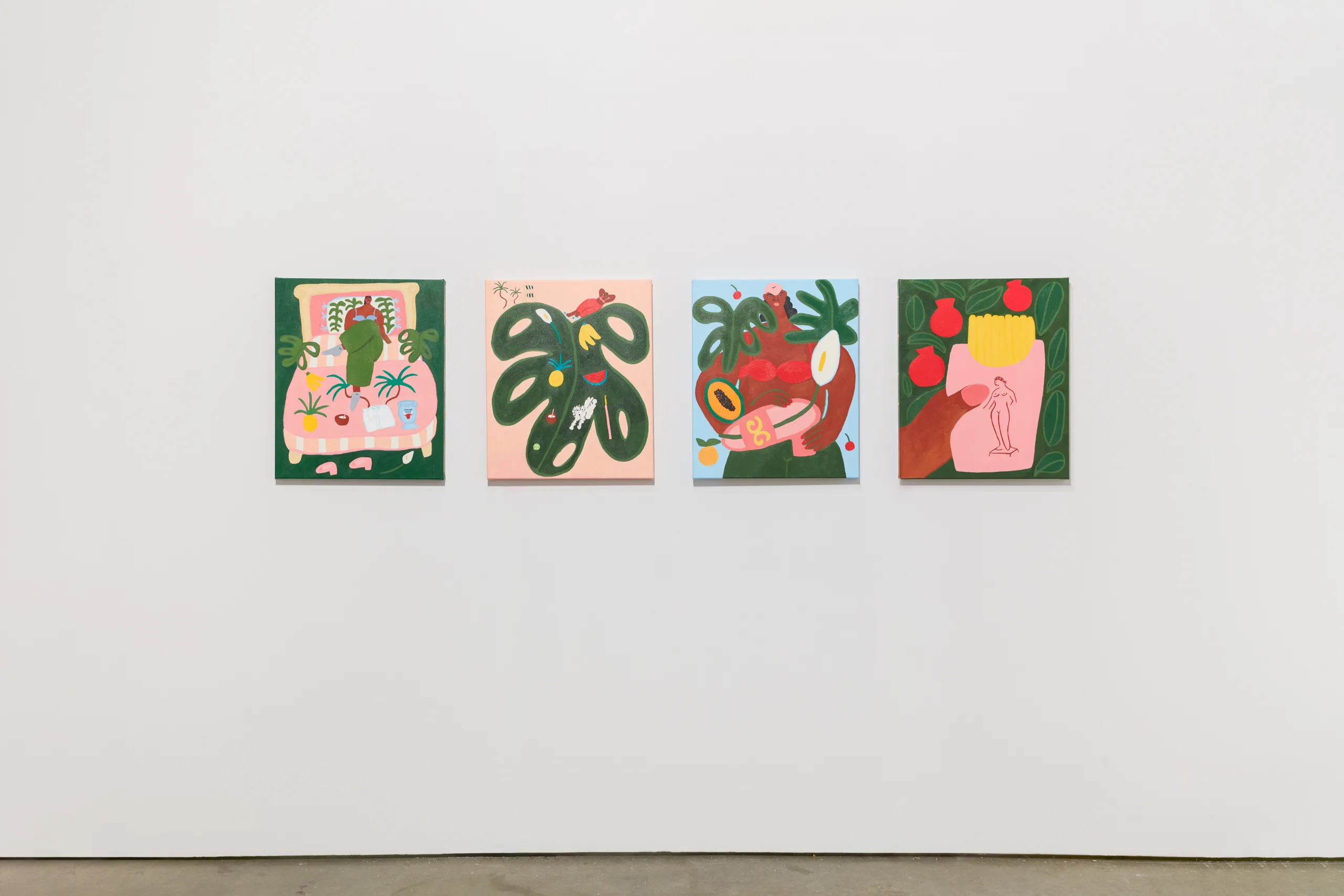 Lilian Martinez paints scenes that depict bright views of women at leisure. Her latest body of work, Sunlit Realism, identifies a playful space between representation and abstraction to explore a world of agency, creativity, comfort, and abundance. Martinez’ ladies indulge with friends, relax in the company of their dogs, and move their bodies in inviting pools and on community basketball courts. Subtle, inside jokes emerge in Martinez’ signature style–a pink bra air dries on a laundry line, French fries are served alongside martinis, a cow relaxes in the grass in the distance, and bananas float above a table filled with fruit and drinks. Martinez’ vignettes extend along the sides of each canvas – the opportunity to add charming details is never overlooked. “It’s delightful and unexpected,” comments Martinez, “these works are thoughtful and peaceful, and there’s humor in all of them.” Radiating warmth, Sunlit Realism embodies a collective desire for brown women to luxuriate peacefully, proffering positive representations of bodies like Martinez’ own to celebrate inclusivity and classlessness.