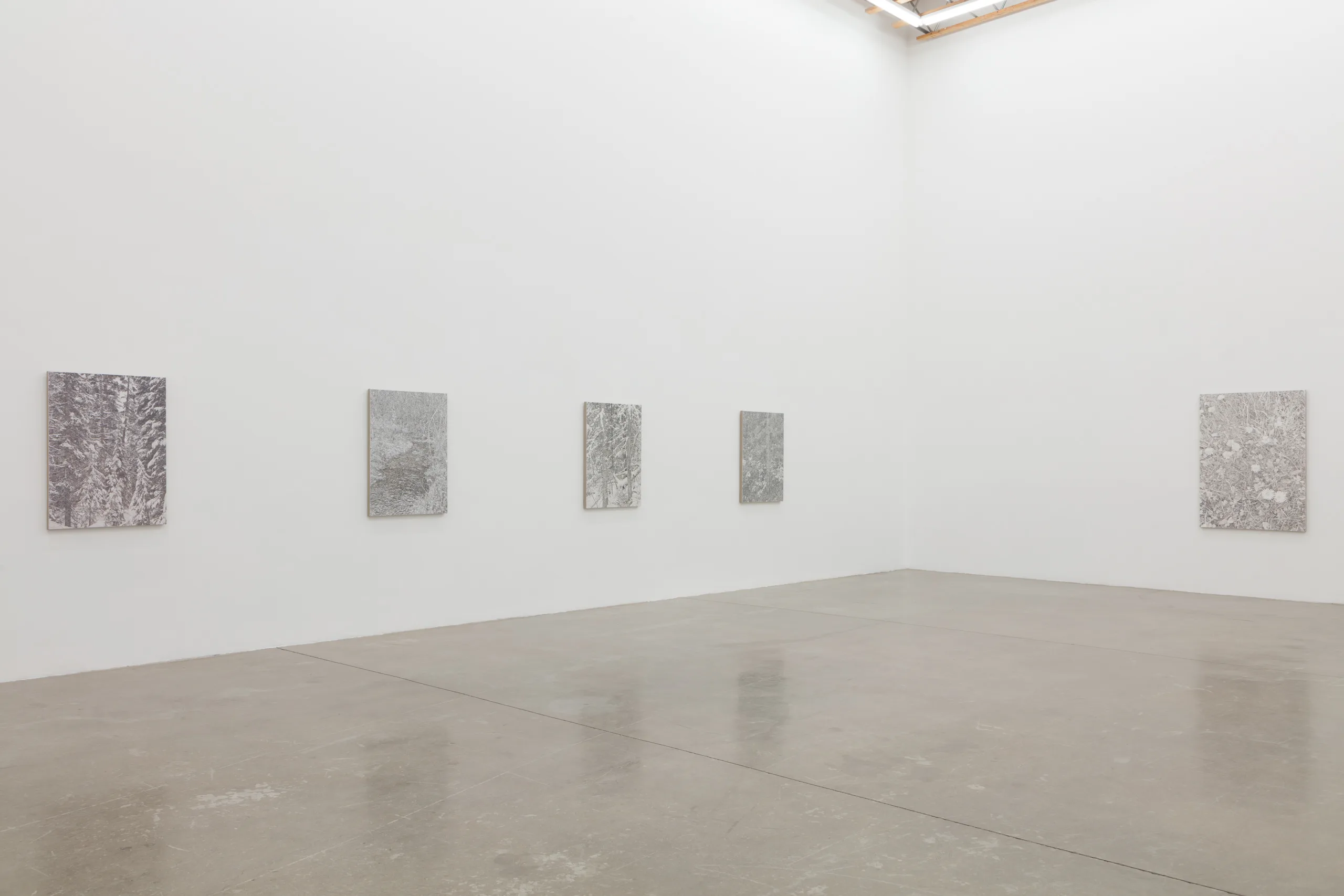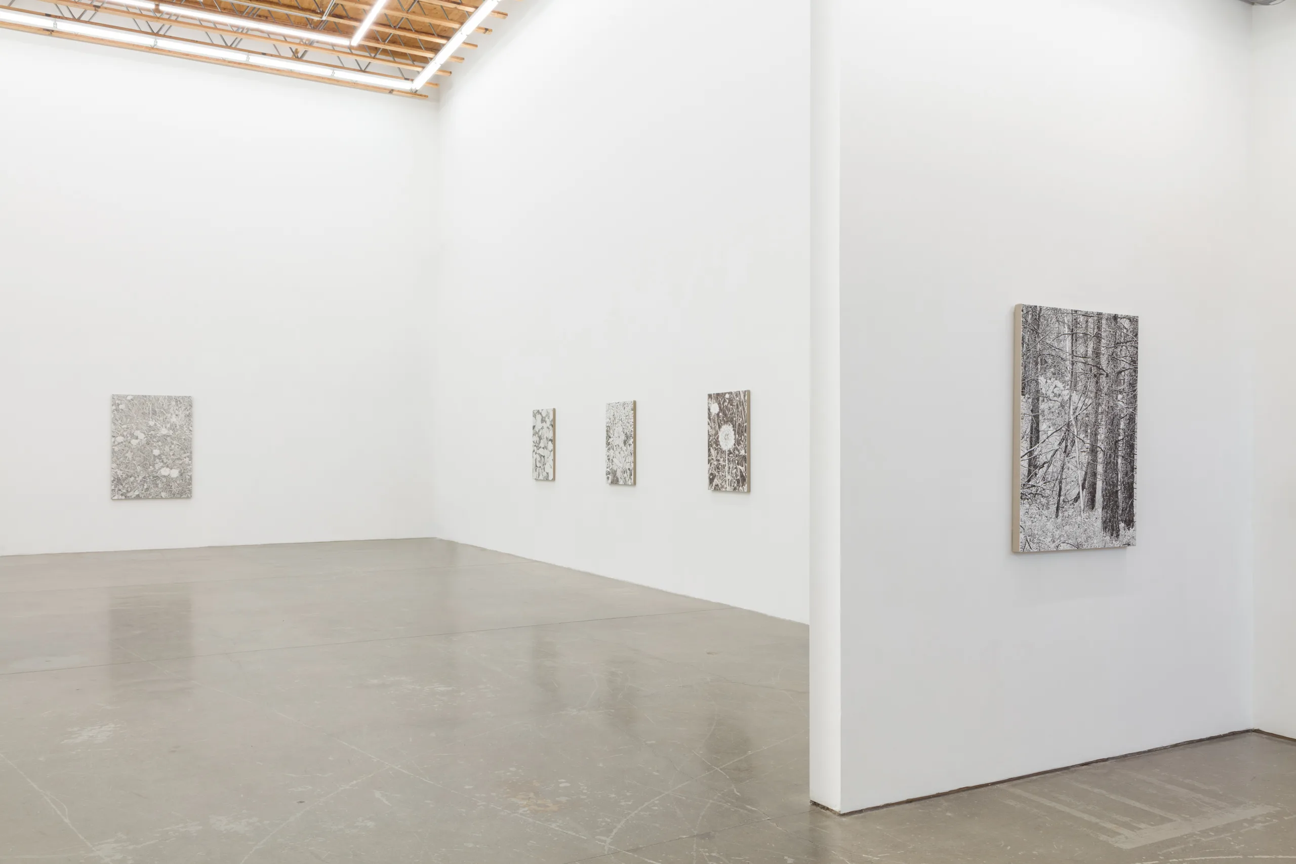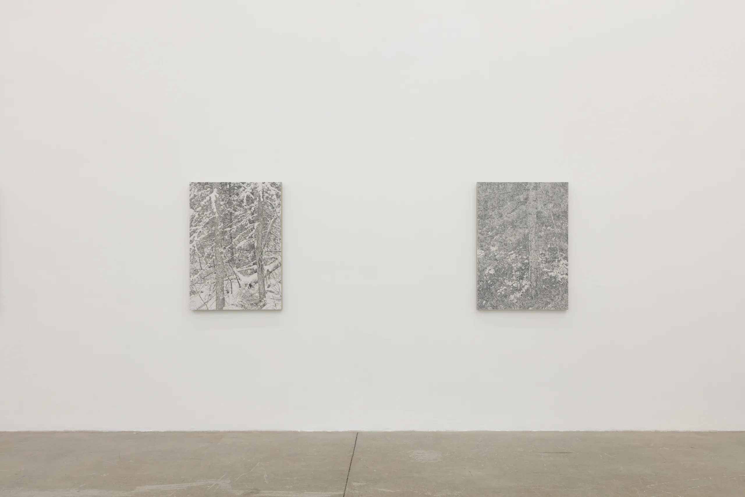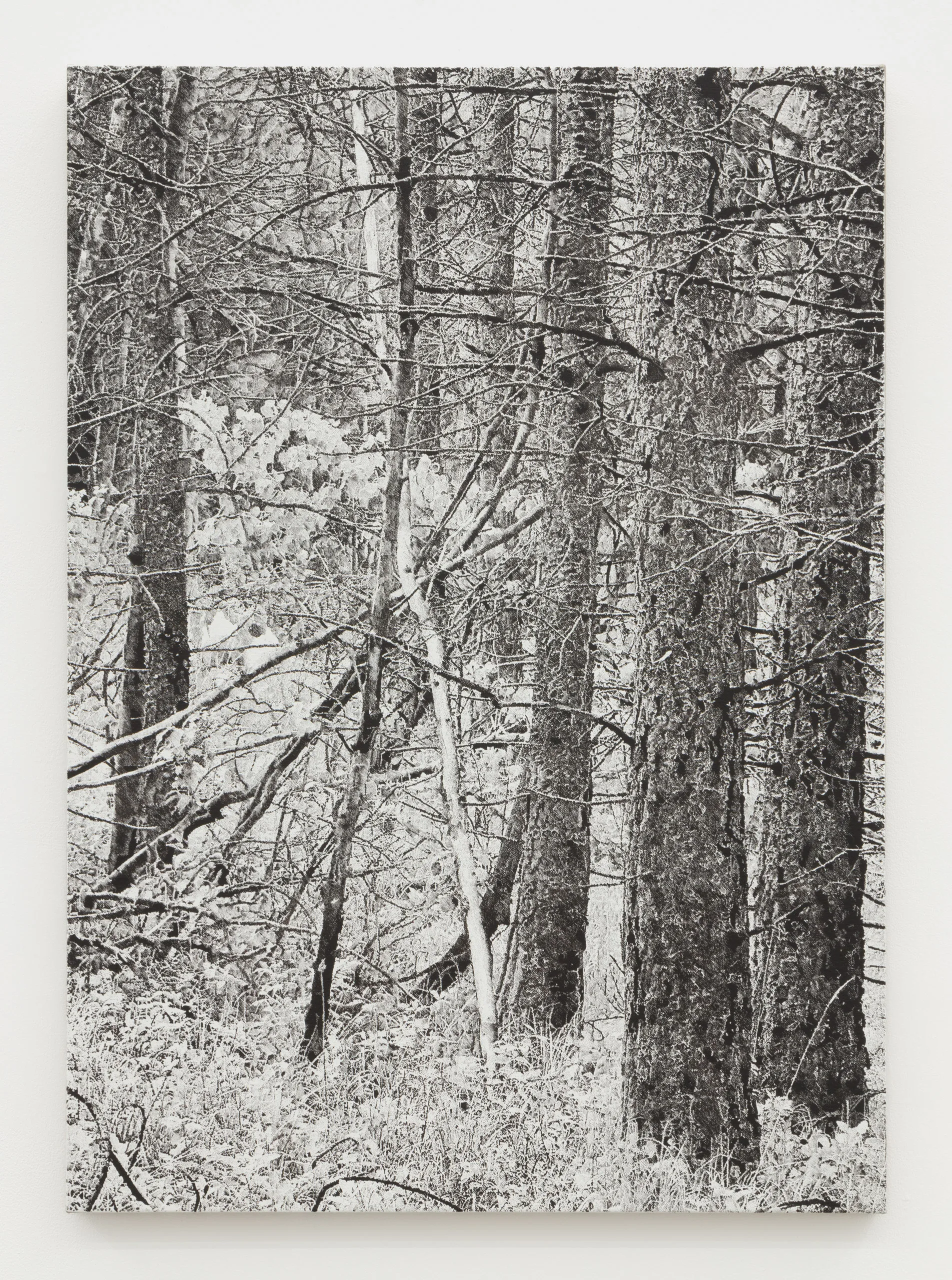 And we are green, greener than the hill, where flowers grow and the sun shines still features James Chronister’s deeply intricate, monochromatic landscape paintings. Composing straight on images of dense winter forests, close ups of individual leaves, and aerial images of flora, Chronister begins his process by photographing the environment surrounding his home in Missoula, Montana. After digitally distorting contrast, focus, and tones, Chronister moves from computer to canvas where minuscule individual marks reveal scrupulous technical application. Onto a white or carefully hued off-white background, Chronister meticulously recreates source photographs by repeatedly applying, shaping, and erasing black oil paint. Precise dry brushing and stippling techniques achieve texture, depth, and refinements of form. As painter Jake Longstreth remarks, “Chronister achieves a startling range of tonality and depth. Viewed up-close, the paintings are constructed by a series of small, discrete marks: a binary system of data – like type on a page – that results in a surreal density of information. Step back, and the pictures cohere. The eye and mind struggle to reconcile the illusionism of these paintings with the narrow, restrained means of their technique.” The monochrome palette, unique in each painting, lends a unifying quality to Chronister’s work – distinguishing his paintings from realism despite his faithful adherence to the source photographs.