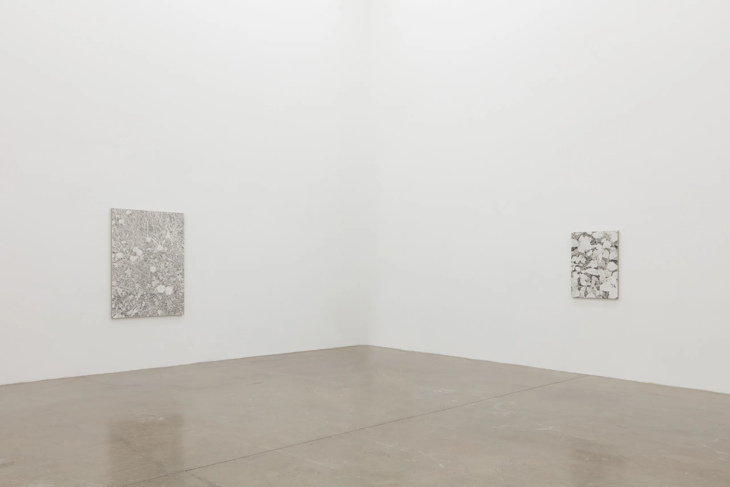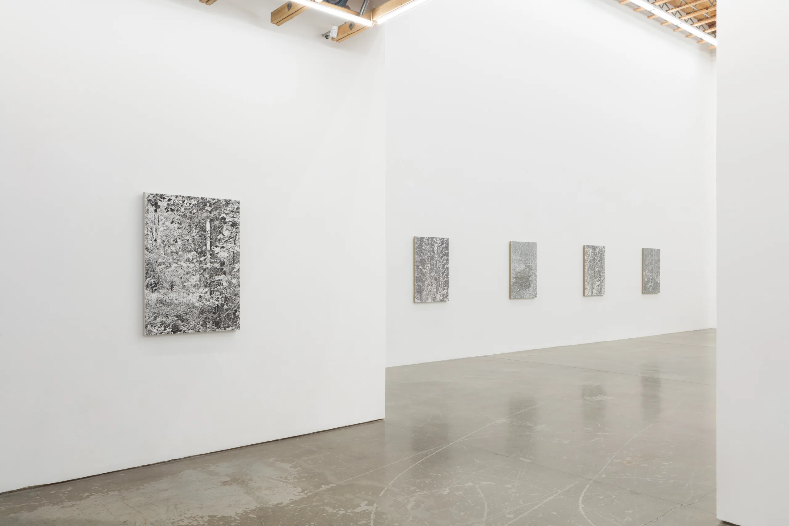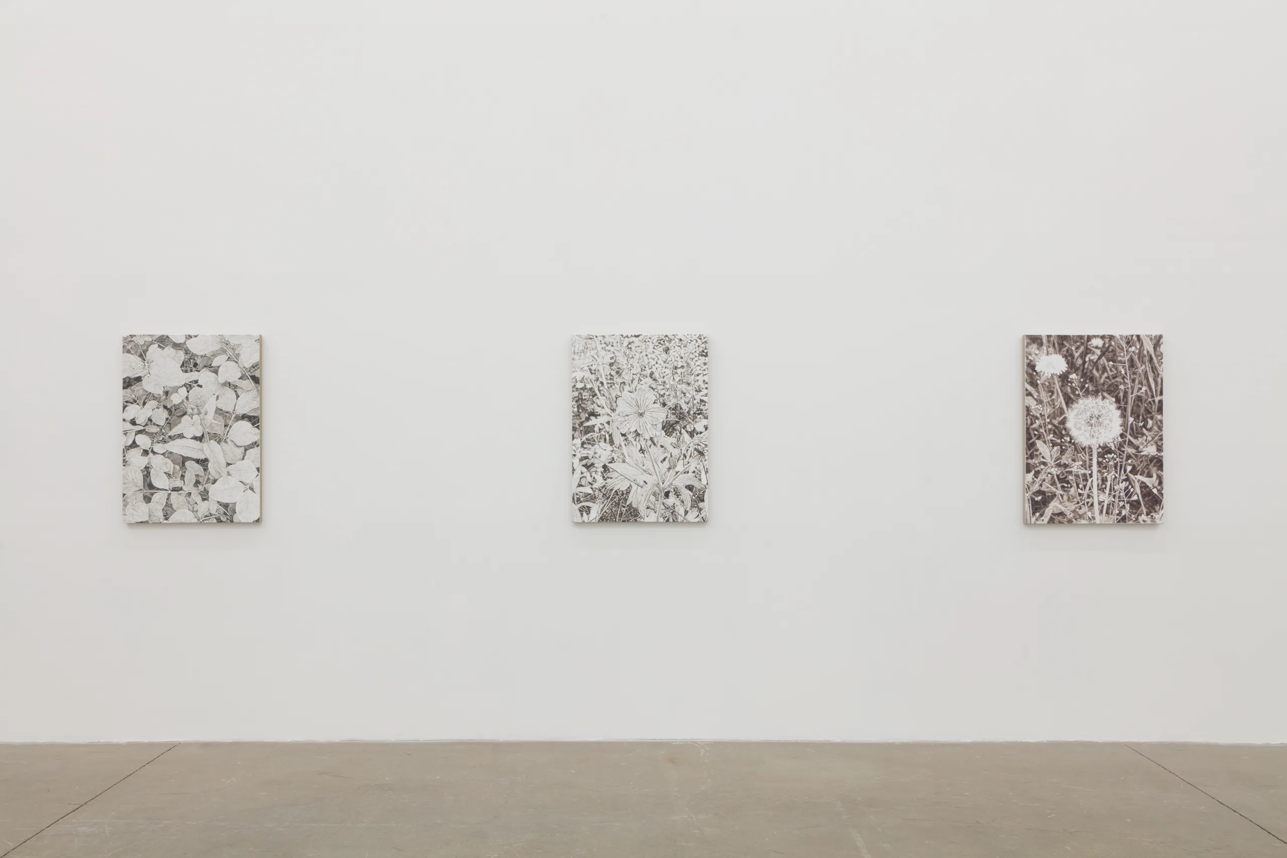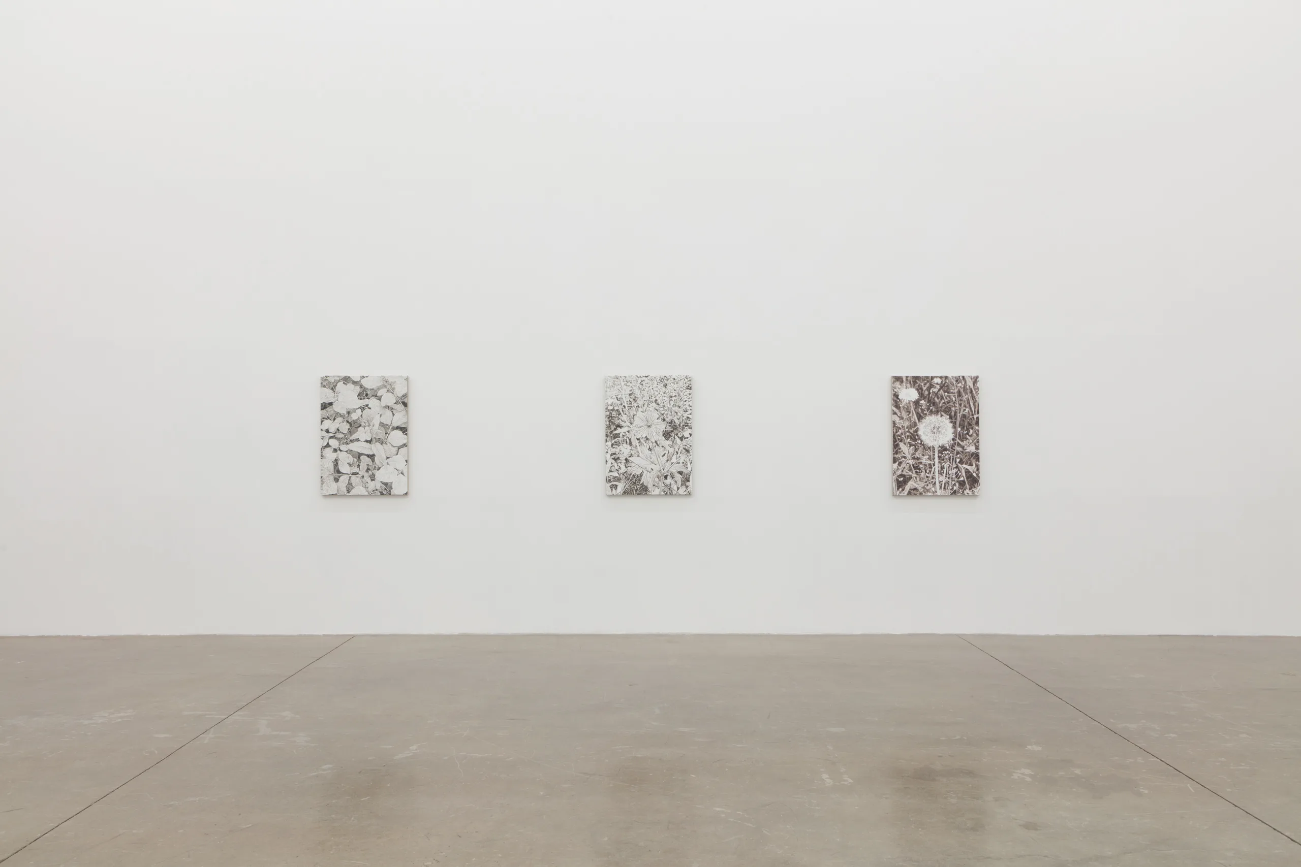And we are green, greener than the hill, where flowers grow and the sun shines still features James Chronister’s deeply intricate, monochromatic landscape paintings. Composing straight on images of dense winter forests, close ups of individual leaves, and aerial images of flora, Chronister begins his process by photographing the environment surrounding his home in Missoula, Montana. After digitally distorting contrast, focus, and tones, Chronister moves from computer to canvas where minuscule individual marks reveal scrupulous technical application. Onto a white or carefully hued off-white background, Chronister meticulously recreates source photographs by repeatedly applying, shaping, and erasing black oil paint. Precise dry brushing and stippling techniques achieve texture, depth, and refinements of form. As painter Jake Longstreth remarks, “Chronister achieves a startling range of tonality and depth. Viewed up-close, the paintings are constructed by a series of small, discrete marks: a binary system of data – like type on a page – that results in a surreal density of information. Step back, and the pictures cohere. The eye and mind struggle to reconcile the illusionism of these paintings with the narrow, restrained means of their technique.” The monochrome palette, unique in each painting, lends a unifying quality to Chronister’s work – distinguishing his paintings from realism despite his faithful adherence to the source photographs.