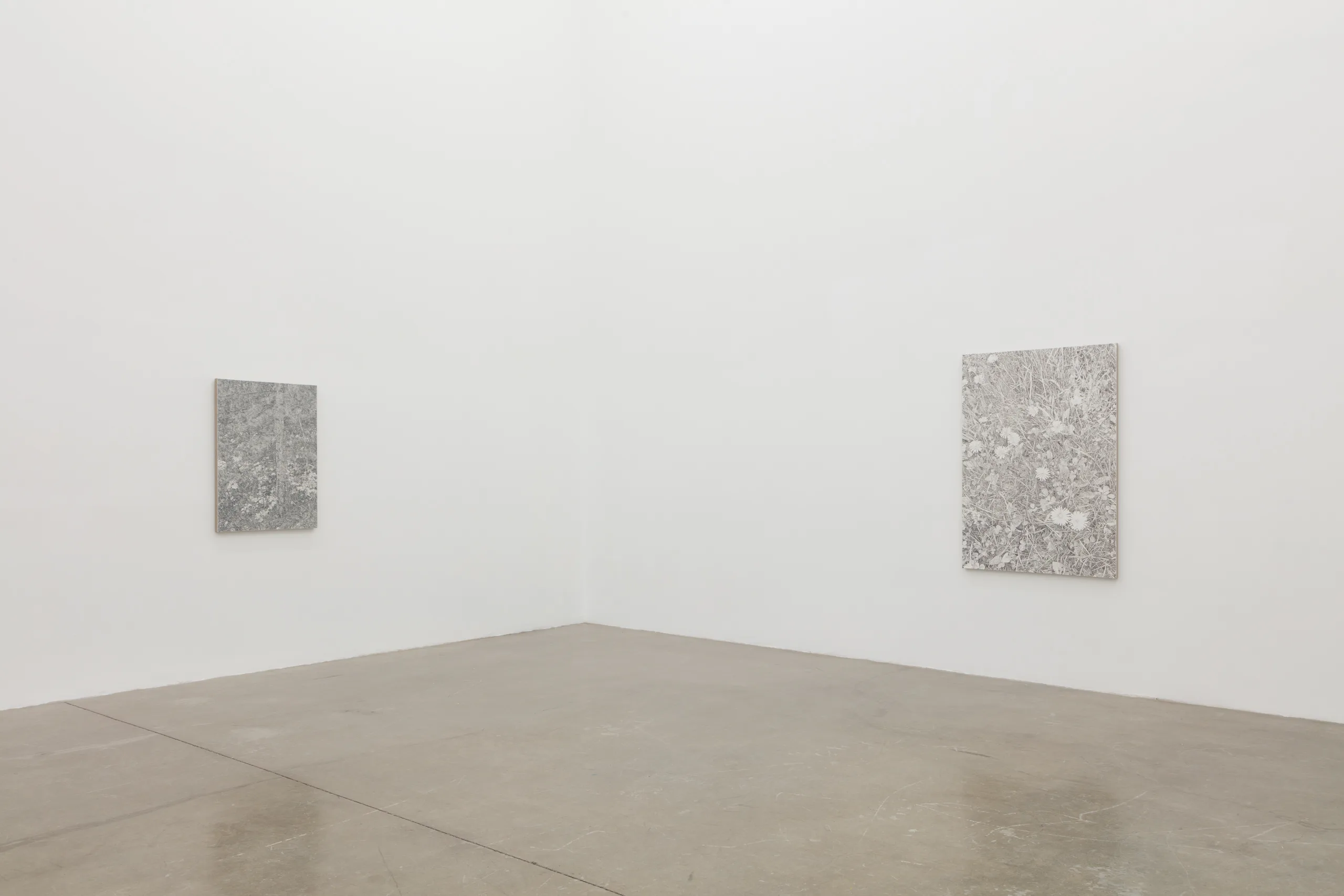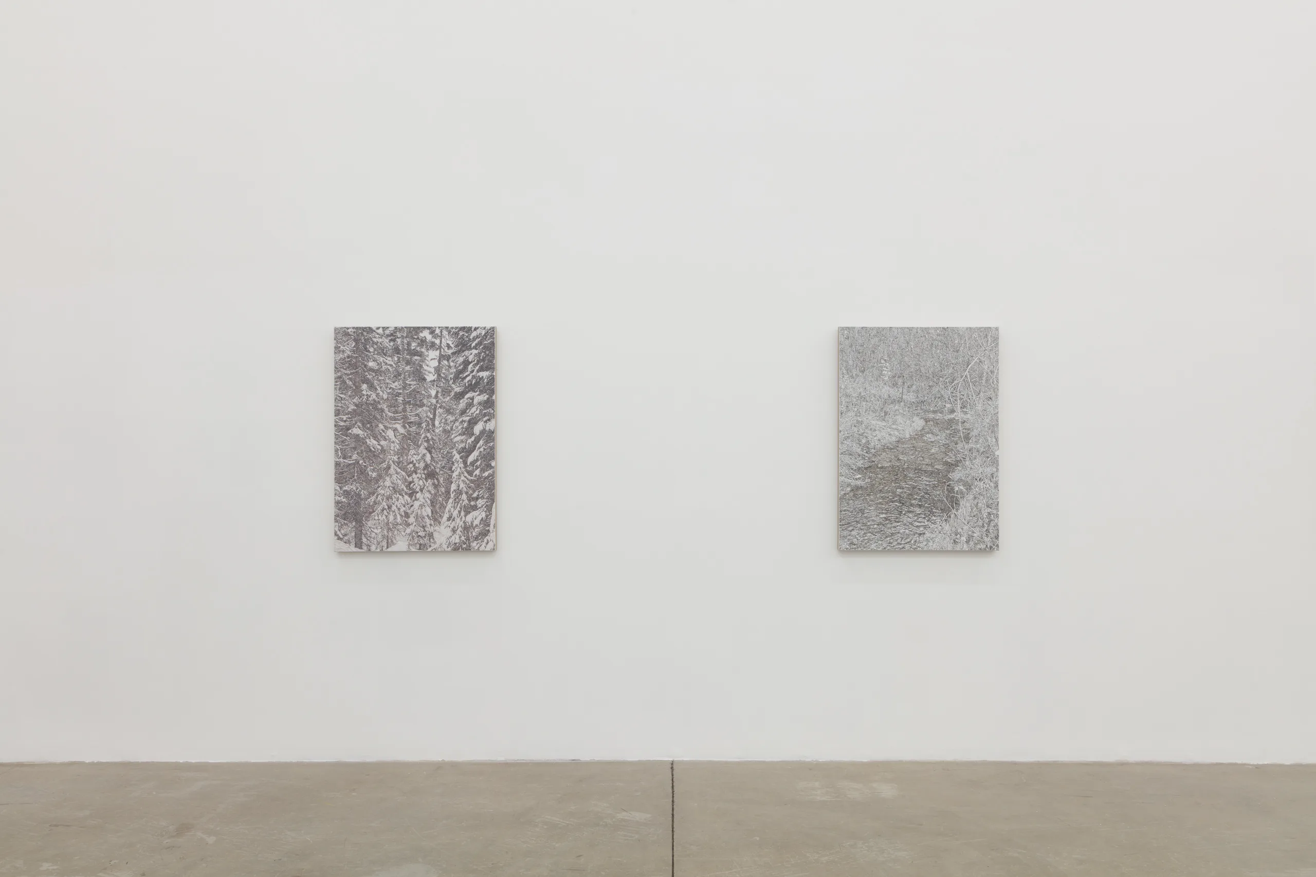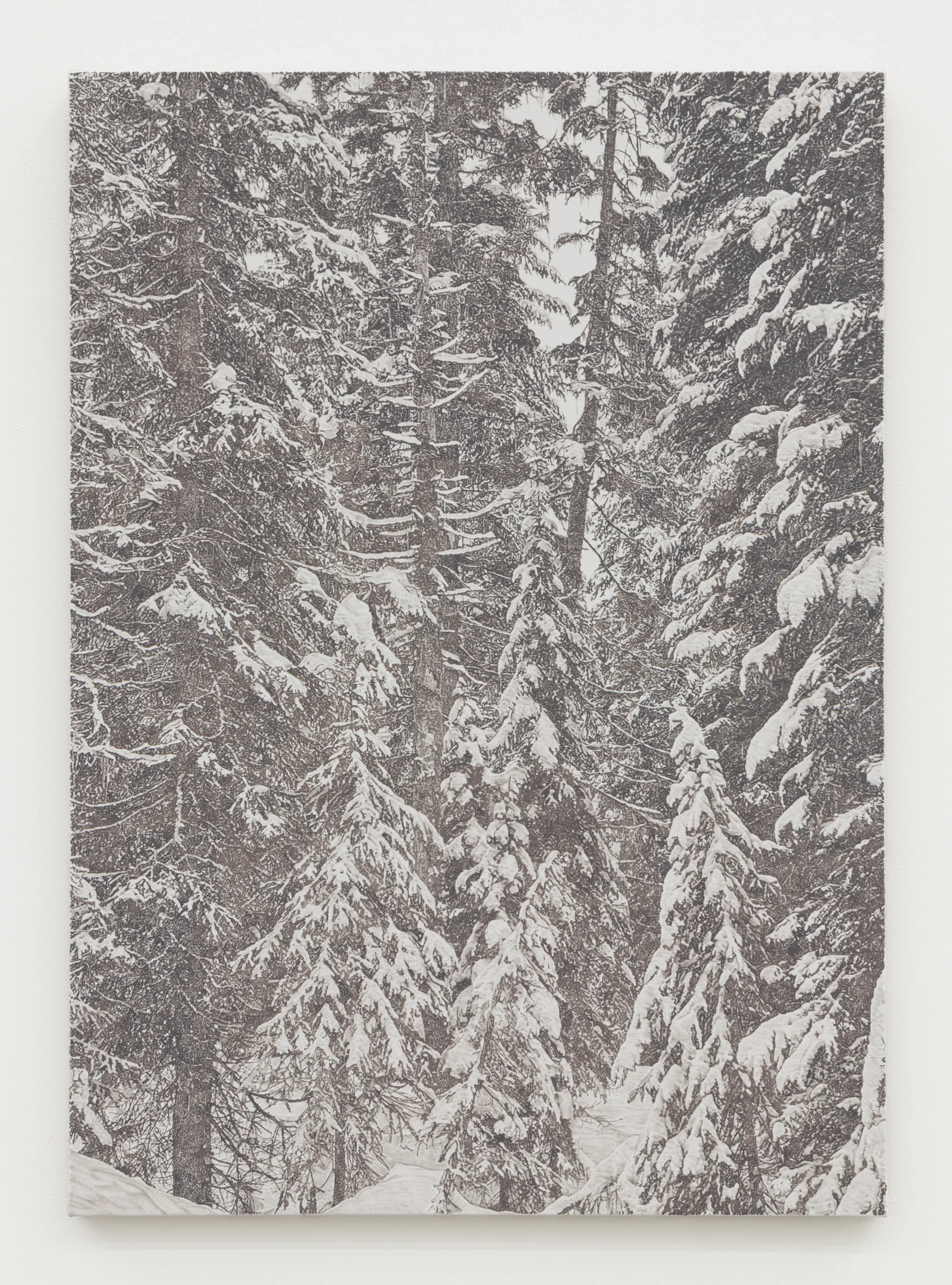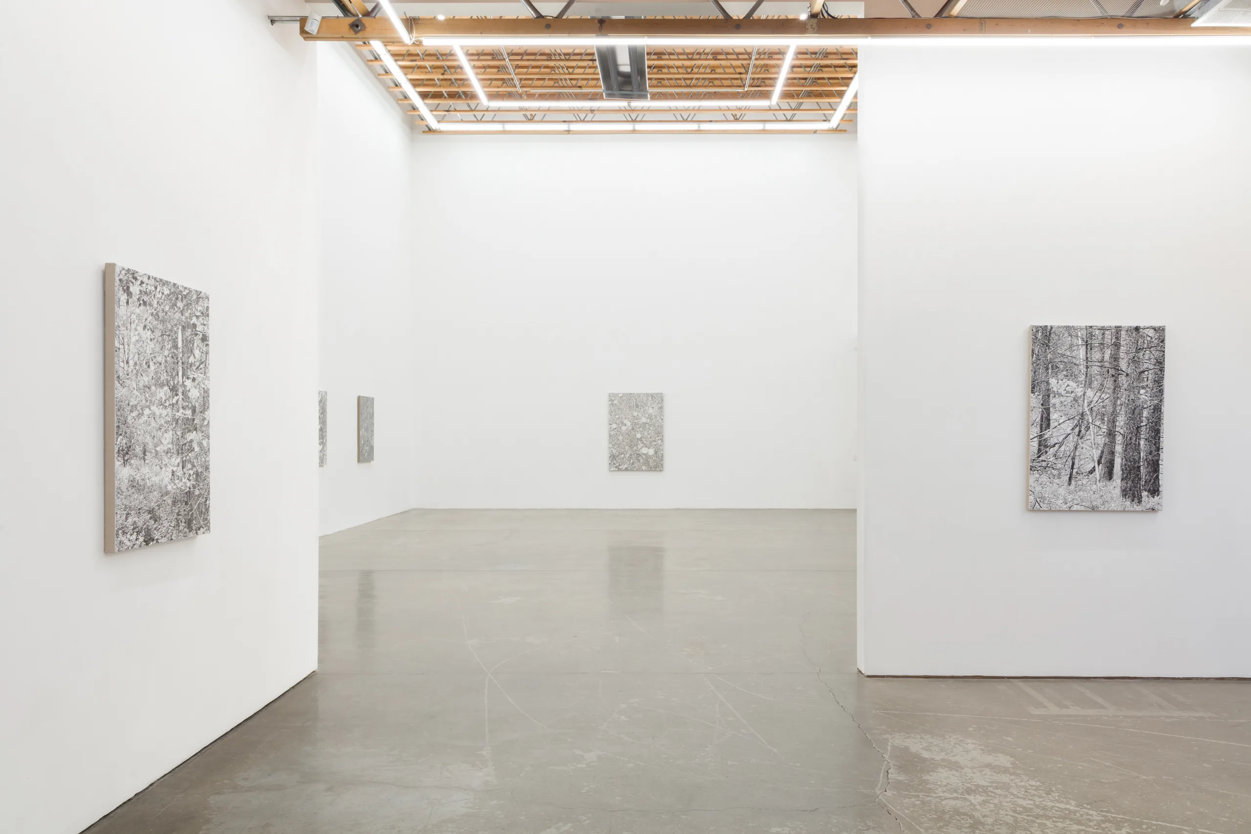 And we are green, greener than the hill, where flowers grow and the sun shines still features James Chronister’s deeply intricate, monochromatic landscape paintings. Composing straight on images of dense winter forests, close ups of individual leaves, and aerial images of flora, Chronister begins his process by photographing the environment surrounding his home in Missoula, Montana. After digitally distorting contrast, focus, and tones, Chronister moves from computer to canvas where minuscule individual marks reveal scrupulous technical application. Onto a white or carefully hued off-white background, Chronister meticulously recreates source photographs by repeatedly applying, shaping, and erasing black oil paint. Precise dry brushing and stippling techniques achieve texture, depth, and refinements of form. As painter Jake Longstreth remarks, “Chronister achieves a startling range of tonality and depth. Viewed up-close, the paintings are constructed by a series of small, discrete marks: a binary system of data – like type on a page – that results in a surreal density of information. Step back, and the pictures cohere. The eye and mind struggle to reconcile the illusionism of these paintings with the narrow, restrained means of their technique.” The monochrome palette, unique in each painting, lends a unifying quality to Chronister’s work – distinguishing his paintings from realism despite his faithful adherence to the source photographs.