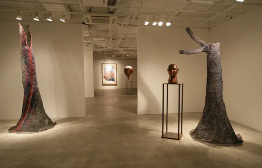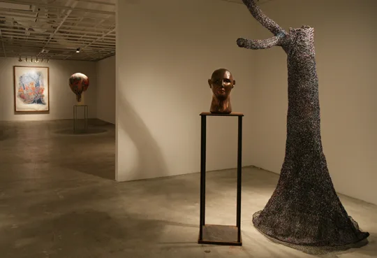 Barren winter trees, stunning watercolors and a larger than life paper-pulp head make-up Schimert’s body of work on view. Each piece is visually haunting, but with her transparent washes interrupted by vivid strings of color, Schimert’s work becomes emotionally jarring as well. Faceless bodies, mere shadowy figures and grasping hands, create portraits more psychological than physical. Schimert explores this Limbo, the world of the in between, and her work reflects it; at times it appears to be full of pain, at another glance, full of rapture. Sometimes her landscapes feel barren and hopeless, but then they are also mystical and hopeful. Fluid in form and feel, each piece informs Schimert’s interest in myth, magic, and that which is invisible to the eye.