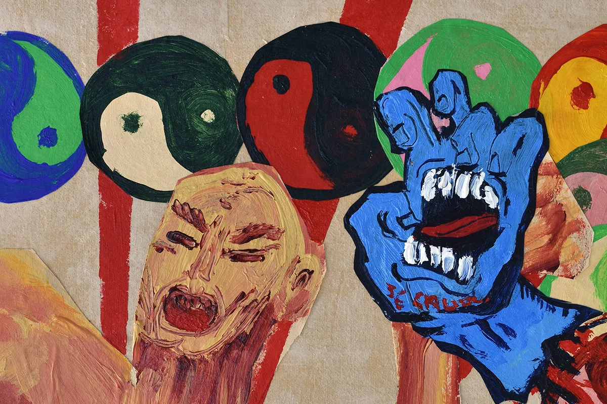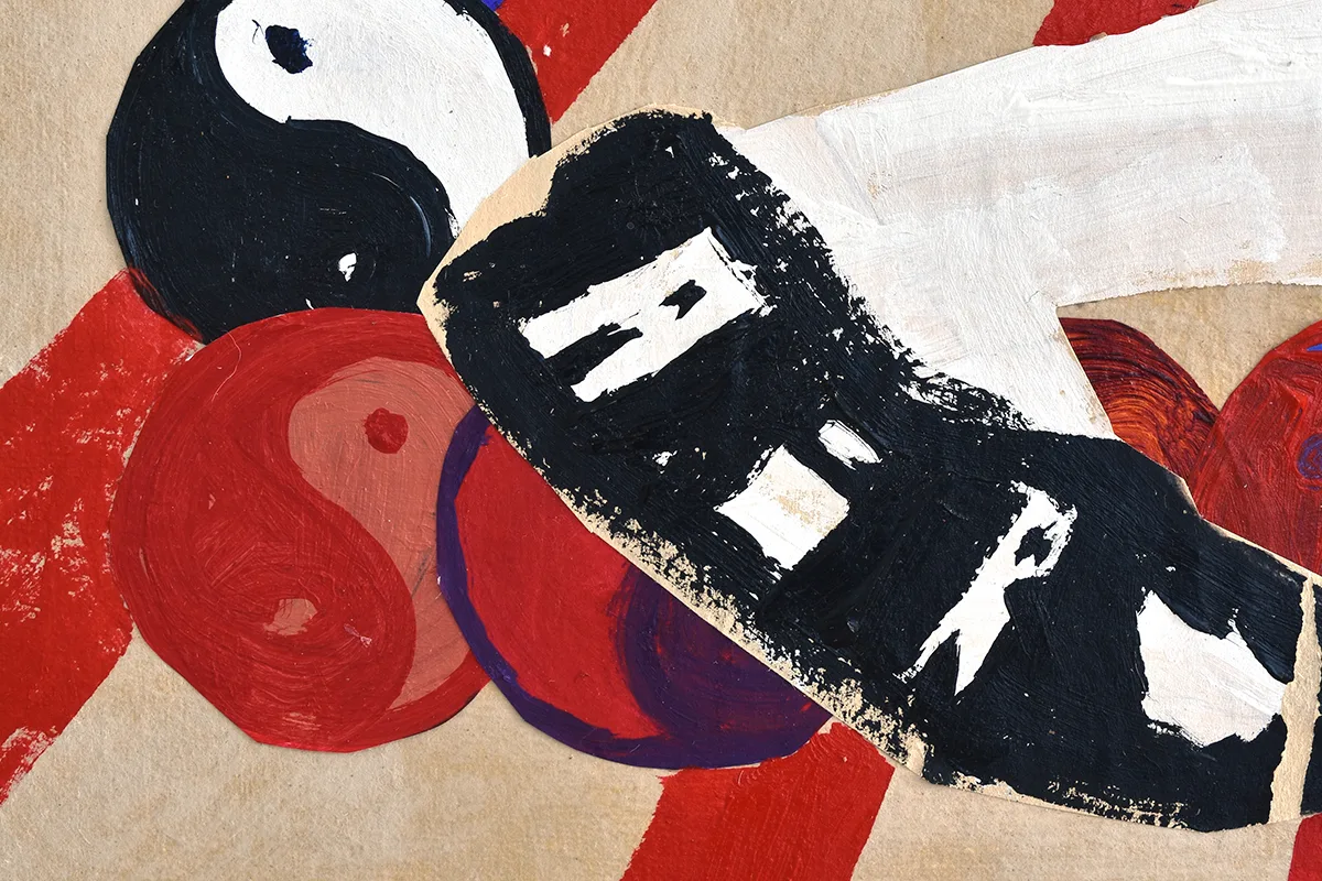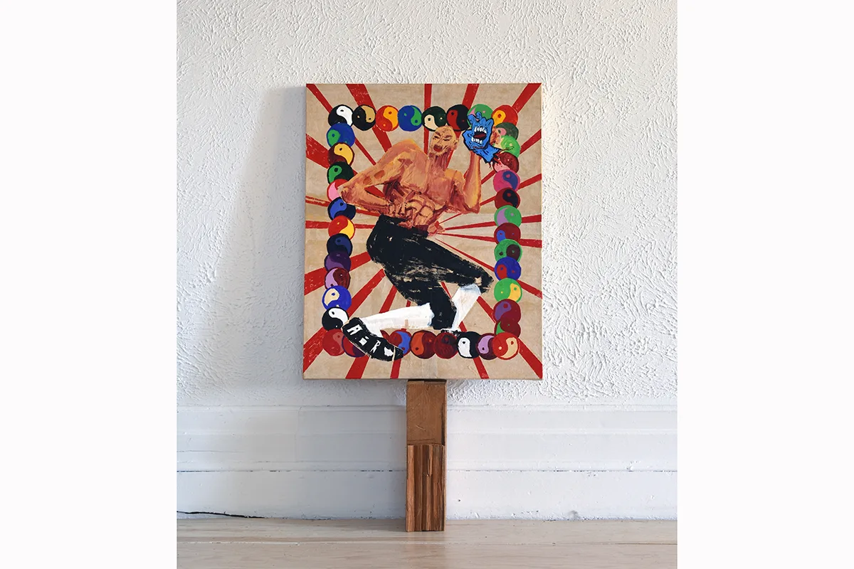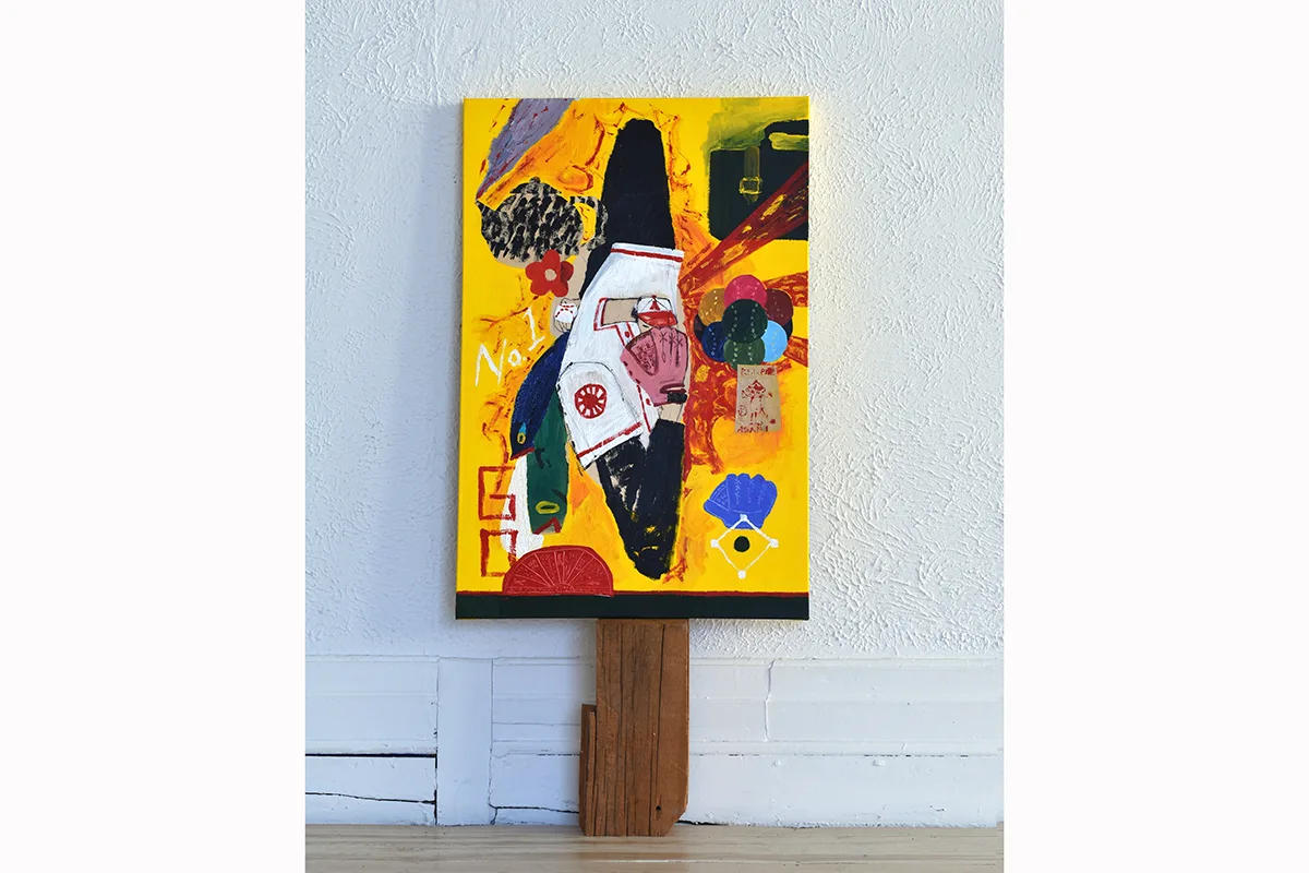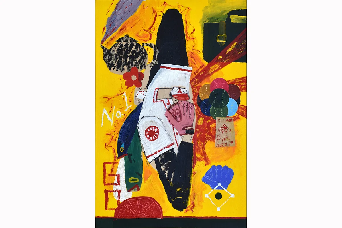 Both heroic and humble, each painting combines traditional Japanese iconography, pop-cultural references, and misappropriated symbols—cherry blossoms, teapots, the yin-yang symbol, Kewpie mayonnaise packets—with faceless figures. Hatanaka decontextualizes to illustrate the power of context, merging visuals with forgotten histories as othered bodies and culturally specific objects enter a space of contemporary consciousness. Conjuring depth using flat forms, bold lines, and jarring perception, each work exudes the excitement and energy found in a live sports match, exploding arenas of color, texture, and heightened emotion.