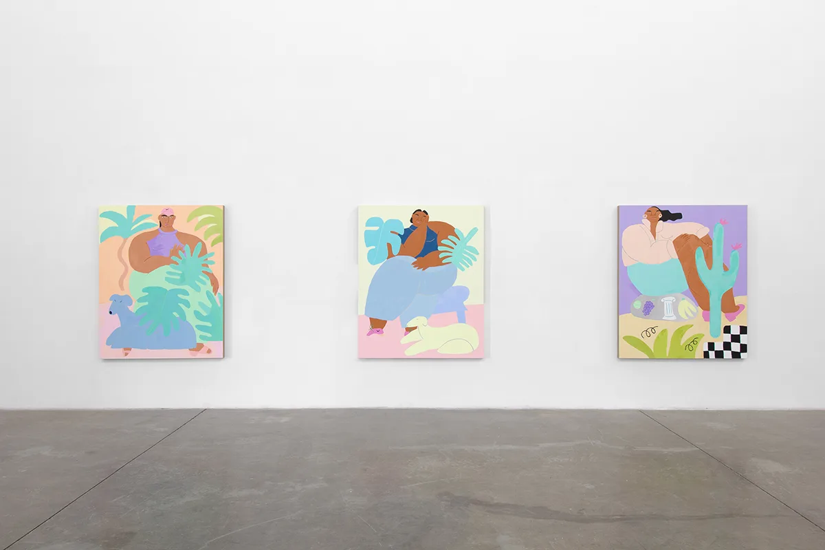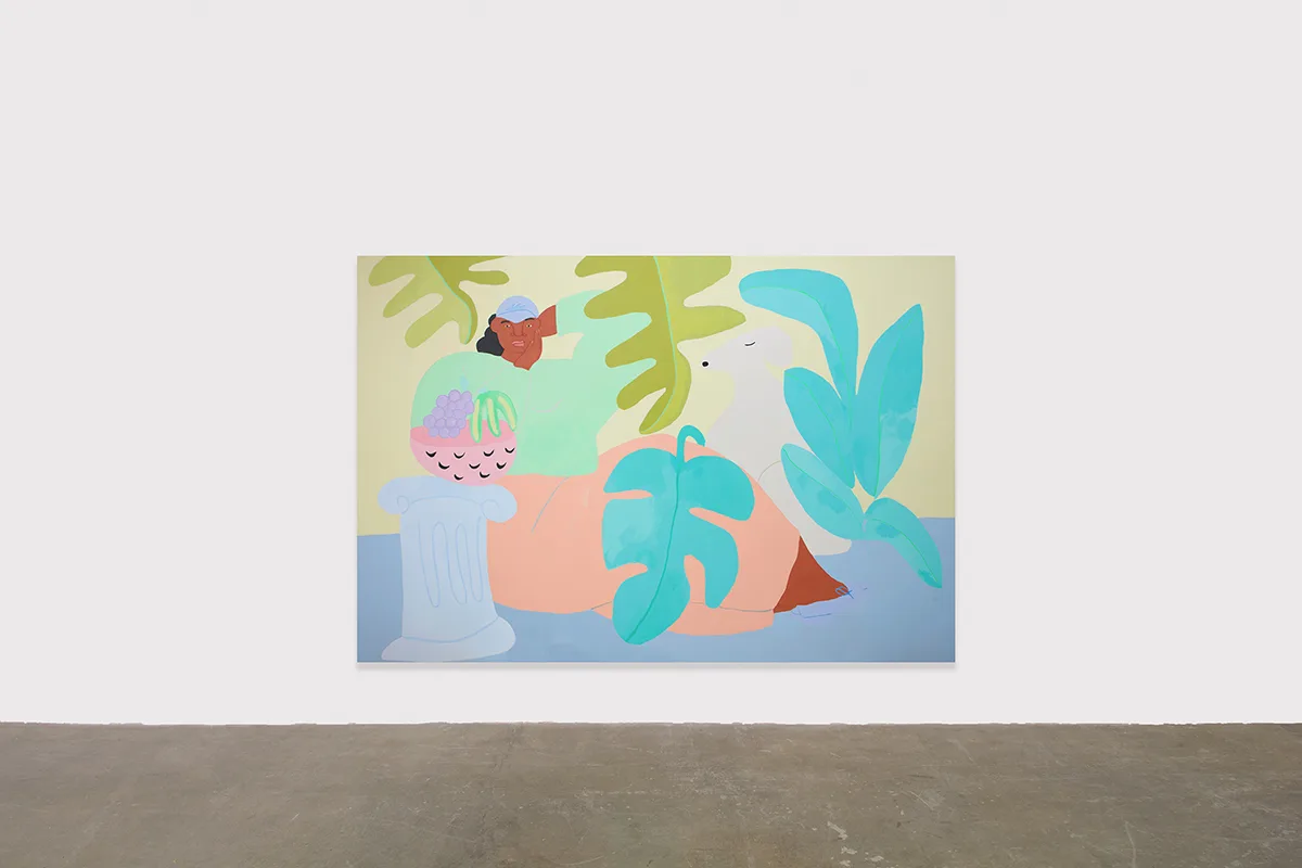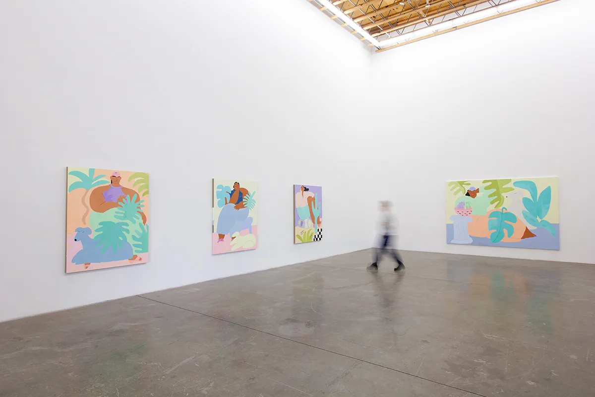 Stone Fruit features new large-scale paintings and works on paper that depict a visionary world inhabited by women of color who bask in comfort as they enjoy leisure, sport, and snack. Ladies stroll, play tennis, eat fruit, use the sauna, and lounge in landscapes and interiors of soft blues, sun-faded yellows, blush, and lavender. With calm expressions and relaxed poses, they are framed by palms, monsteras, and blooming cacti, often accompanied by their pets.