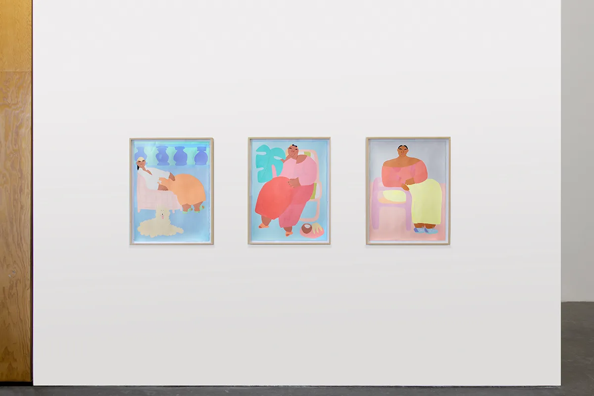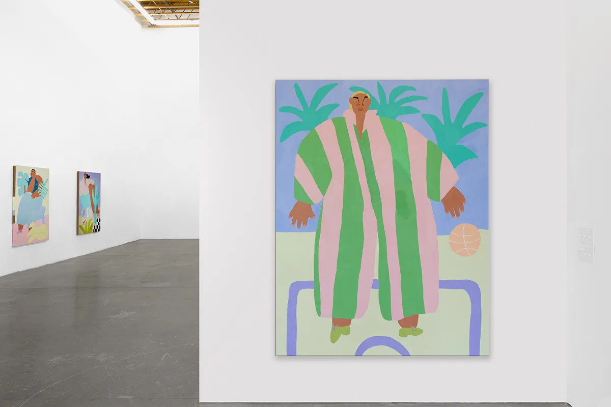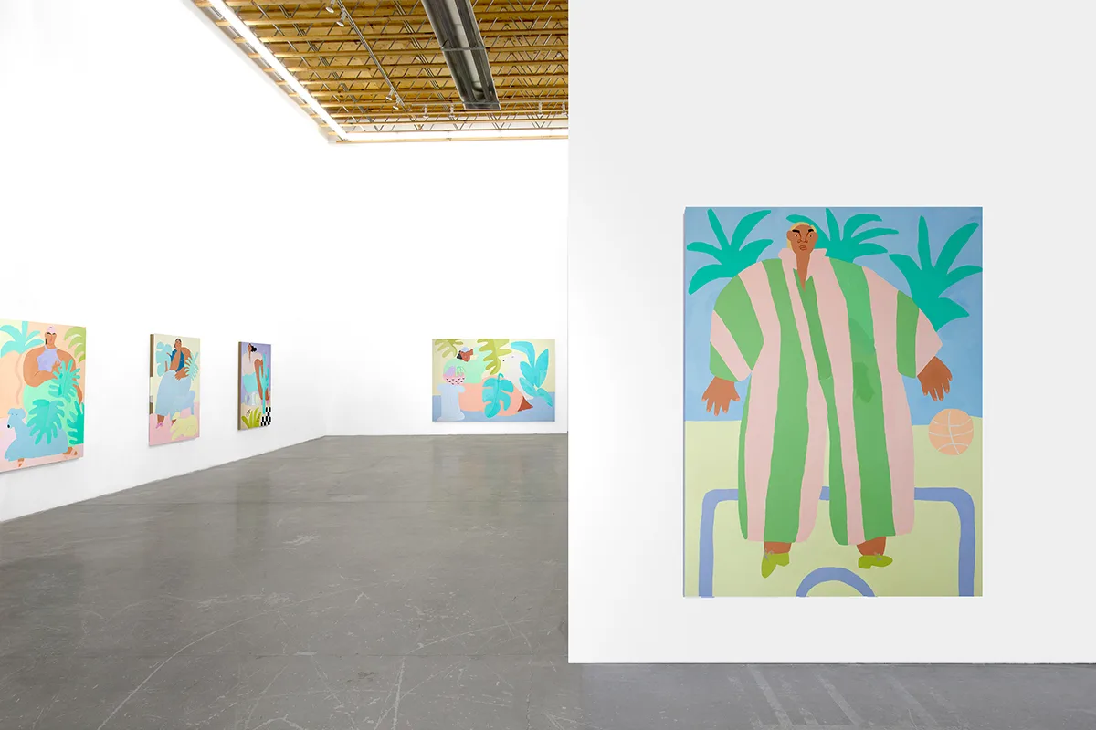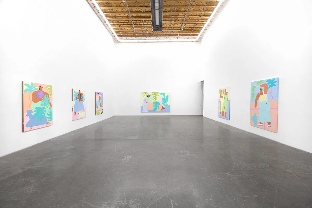 Stone Fruit features new large-scale paintings and works on paper that depict a visionary world inhabited by women of color who bask in comfort as they enjoy leisure, sport, and snack. Ladies stroll, play tennis, eat fruit, use the sauna, and lounge in landscapes and interiors of soft blues, sun-faded yellows, blush, and lavender. With calm expressions and relaxed poses, they are framed by palms, monsteras, and blooming cacti, often accompanied by their pets.