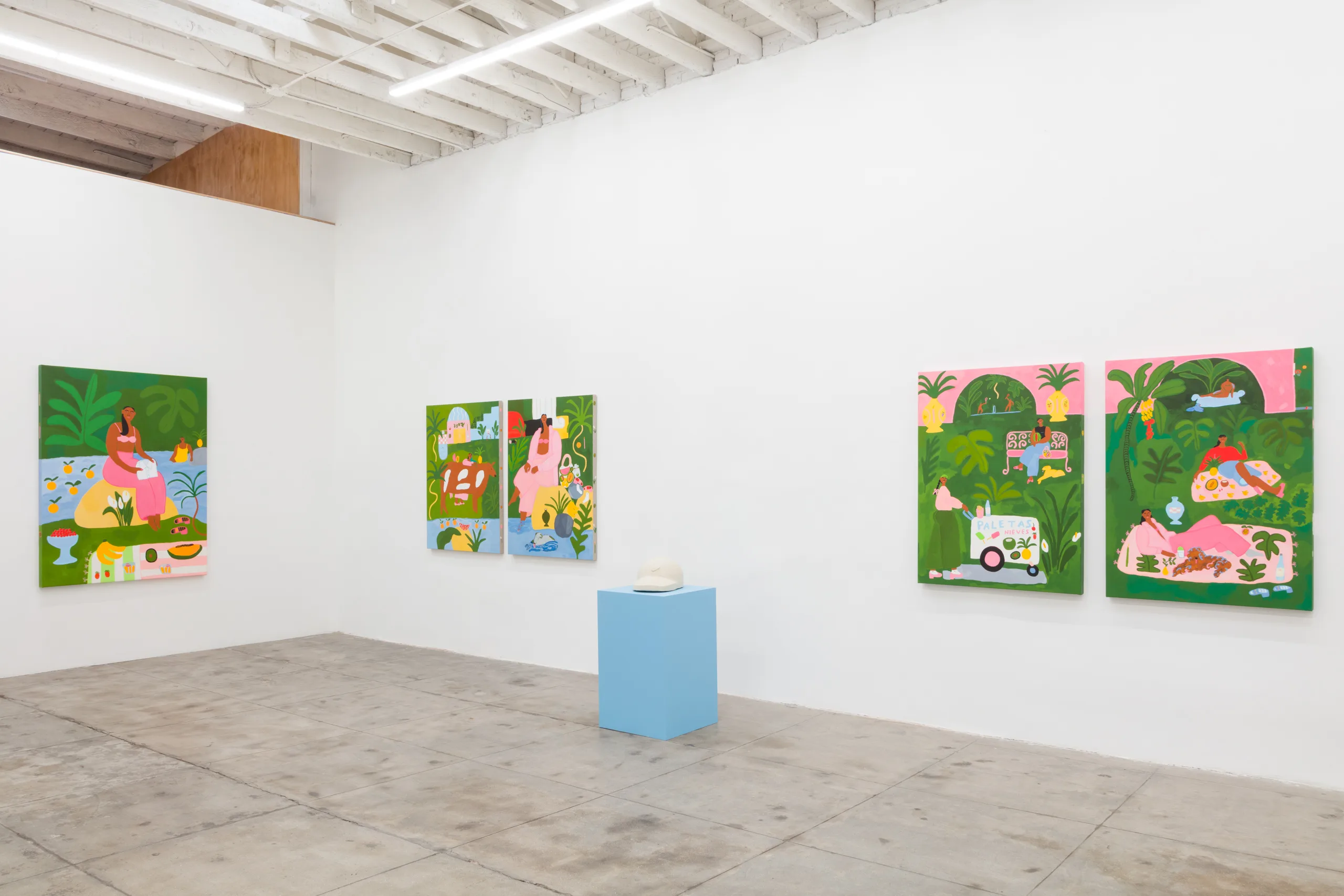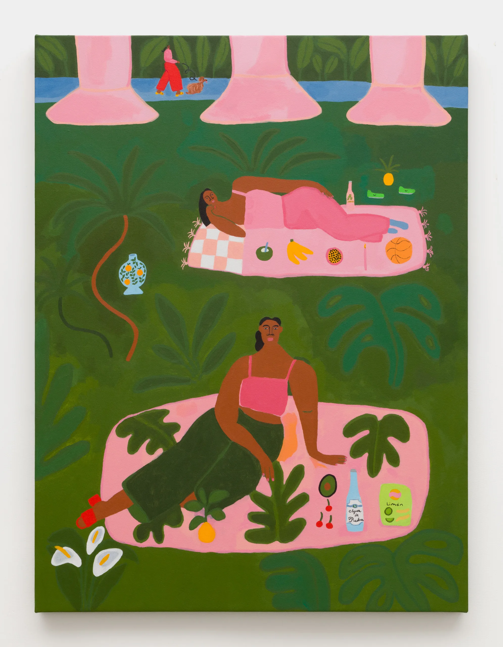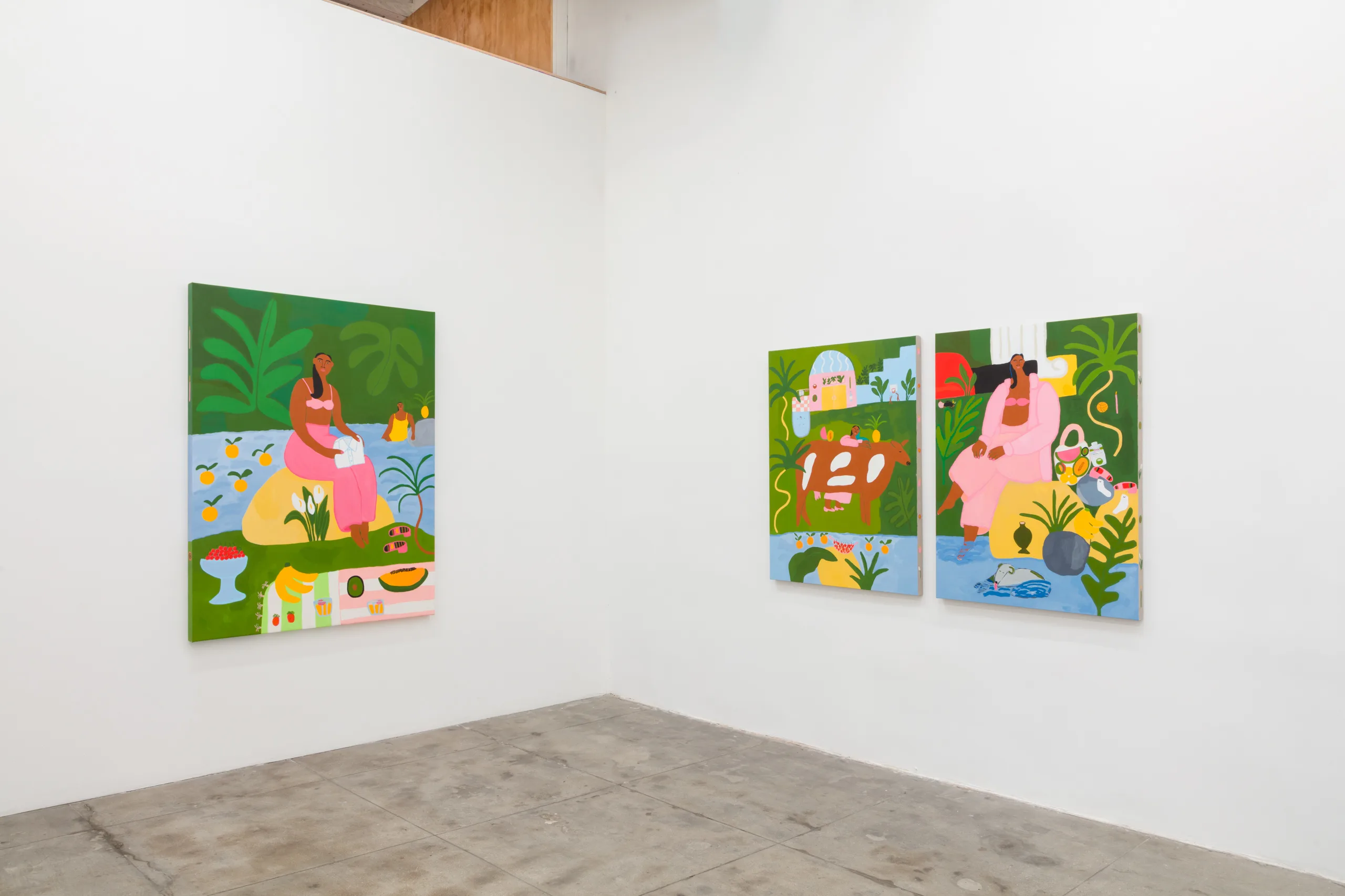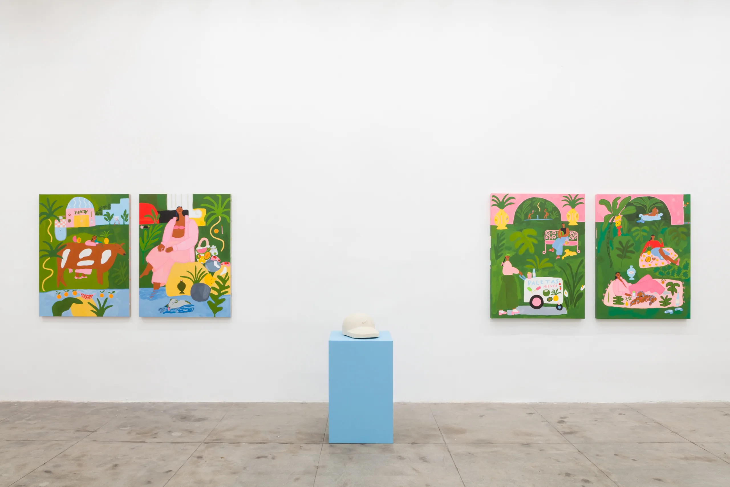 Central to Lilian Martinez’ exhibition are three pairs of paintings that function both as diptychs and also as stand-alone works. They are connected visually and conceptually; one by blue water flowing through life-giving streams, another through an open-air community space that Lilian Martinez describes as an “outdoor third space…a space that requires nothing of you to enter it or to stay,” and the third through concepts of boundless femininity and womanhood. Each vignette offers a quotidian narrative with unexpected details—a glass of carrot juice with lipstick on the rim, calla lilies growing in the park, ripe bananas hanging from a tree, sliced papaya, watermelon, and a pineapple balanced on a large brown and white cow, pink Tabi Mary Janes kicked off in the grass, and a lime nieve with a pink spoon awaiting eating. Embodying a collective desire for brown women to occupy space peacefully, Martinez’ paintings proffer positive representations of bodies like her own as they celebrate inclusivity and classlessness.
