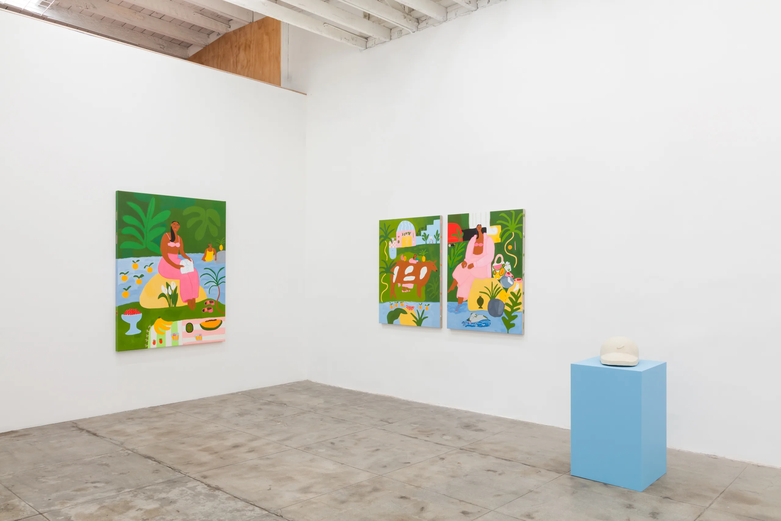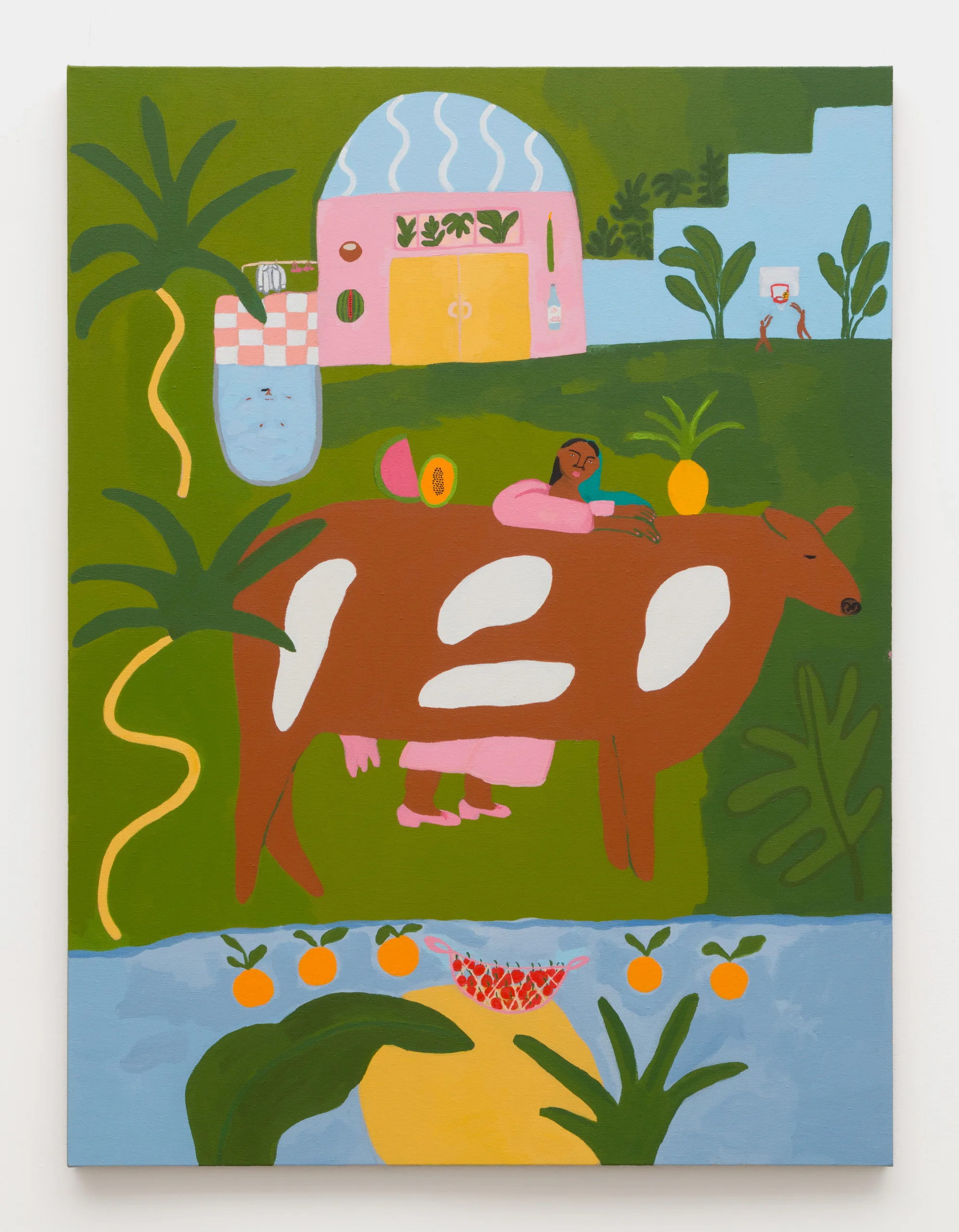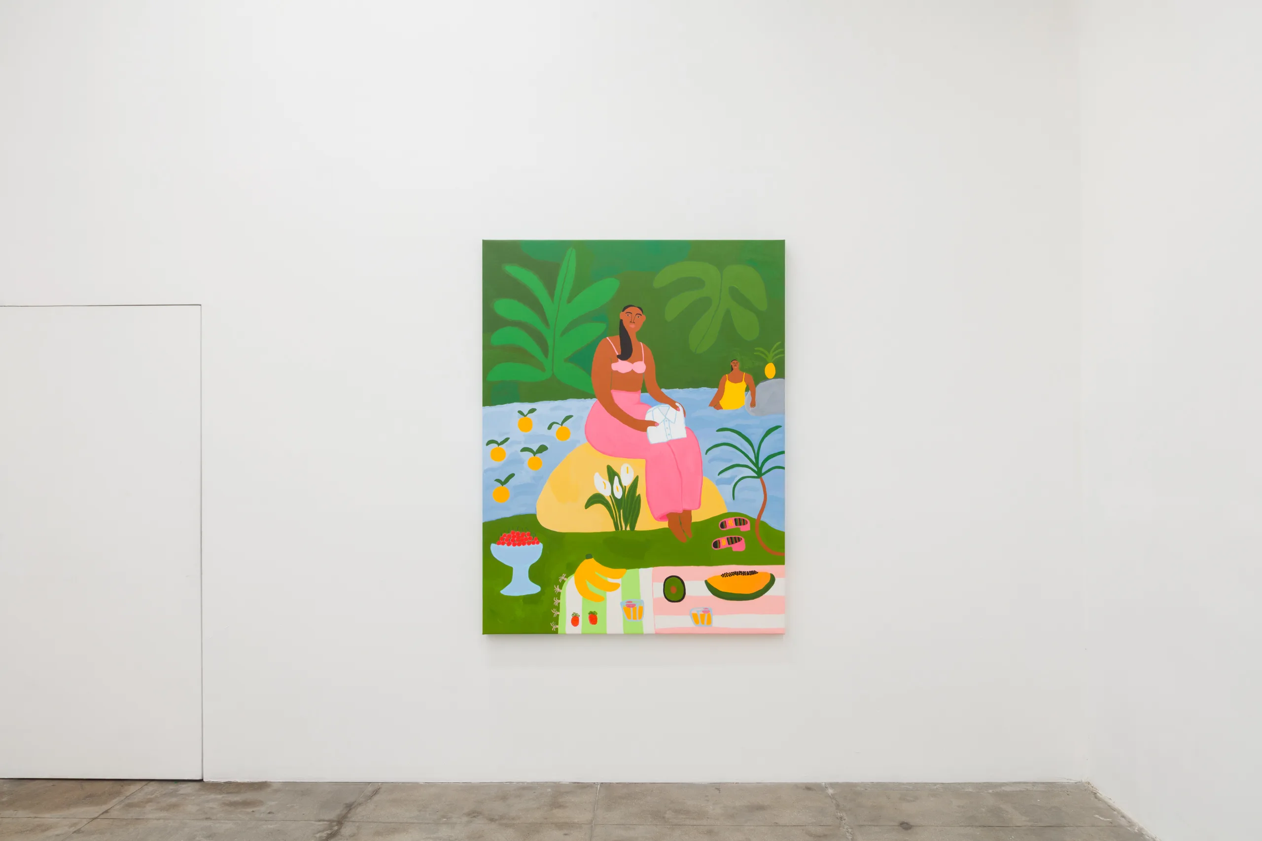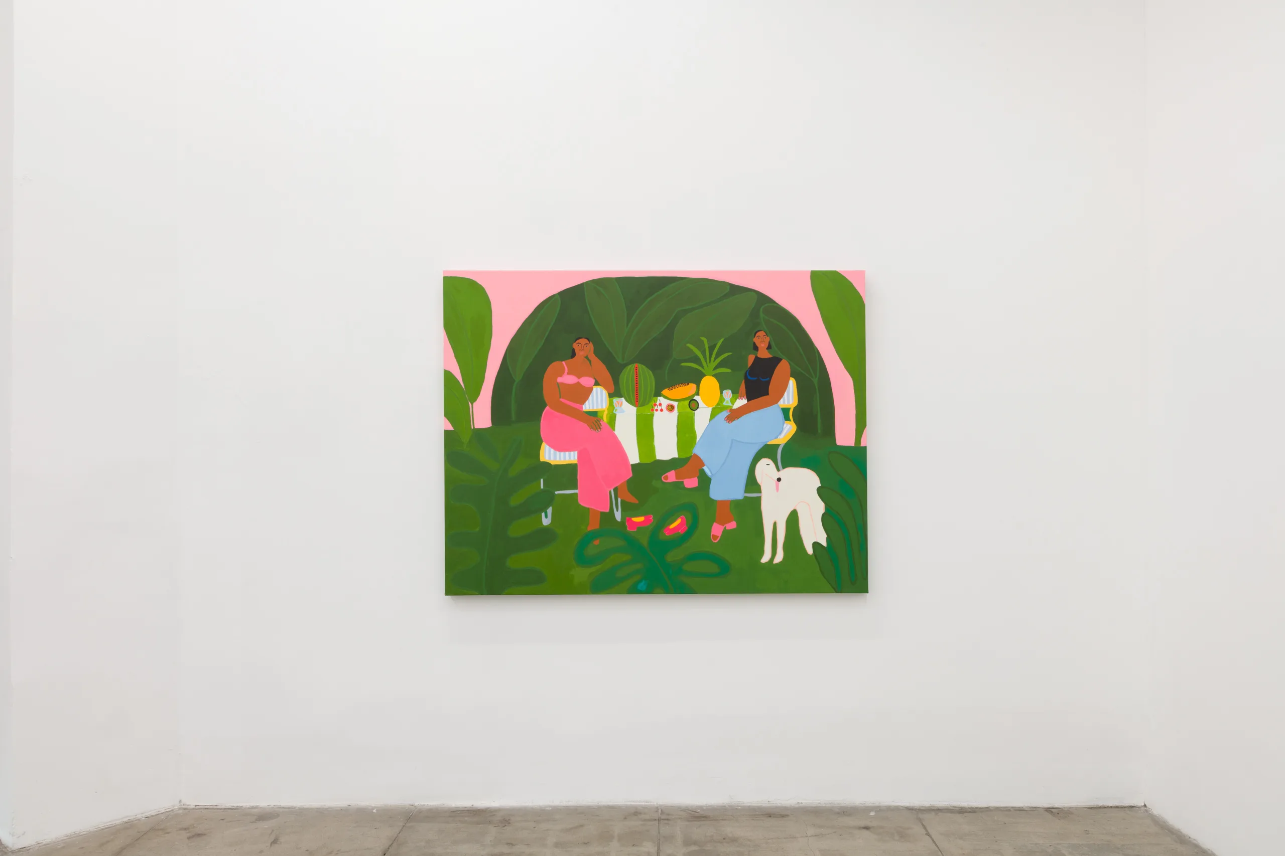 Central to Lilian Martinez’ exhibition are three pairs of paintings that function both as diptychs and also as stand-alone works. They are connected visually and conceptually; one by blue water flowing through life-giving streams, another through an open-air community space that Lilian Martinez describes as an “outdoor third space…a space that requires nothing of you to enter it or to stay,” and the third through concepts of boundless femininity and womanhood. Each vignette offers a quotidian narrative with unexpected details—a glass of carrot juice with lipstick on the rim, calla lilies growing in the park, ripe bananas hanging from a tree, sliced papaya, watermelon, and a pineapple balanced on a large brown and white cow, pink Tabi Mary Janes kicked off in the grass, and a lime nieve with a pink spoon awaiting eating. Embodying a collective desire for brown women to occupy space peacefully, Martinez’ paintings proffer positive representations of bodies like her own as they celebrate inclusivity and classlessness.