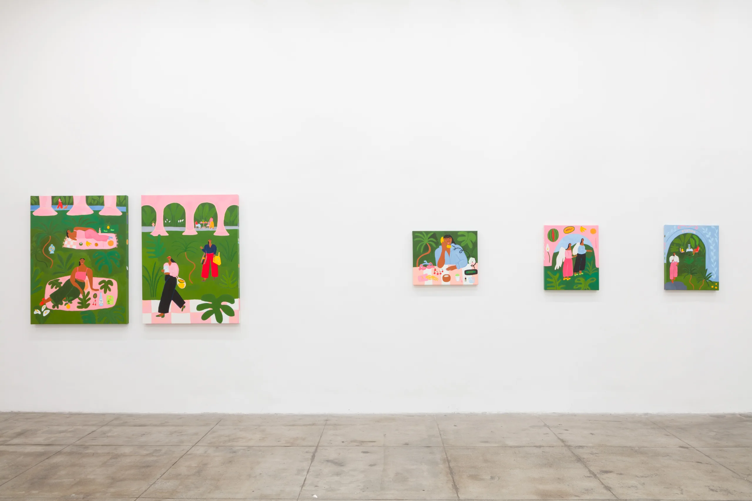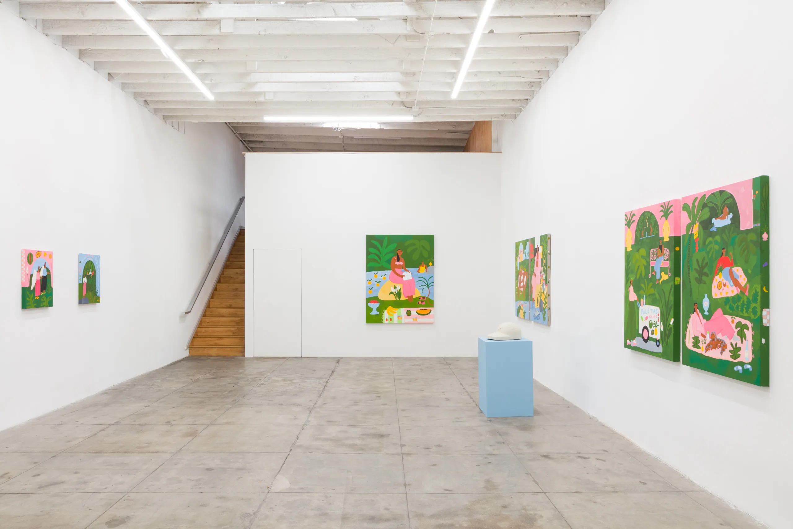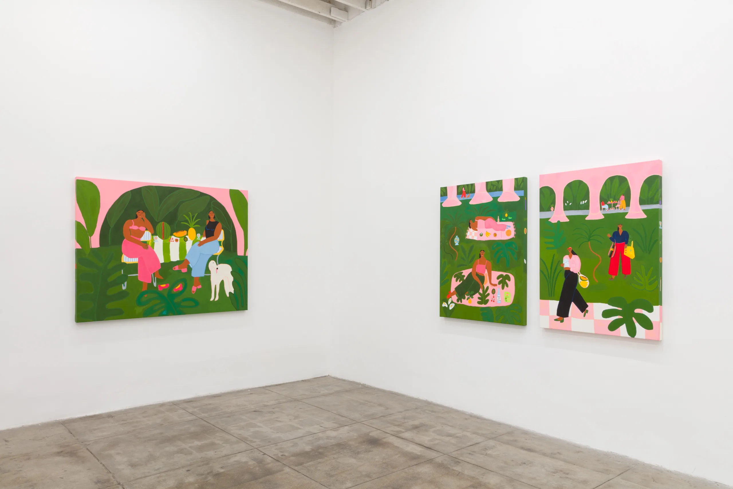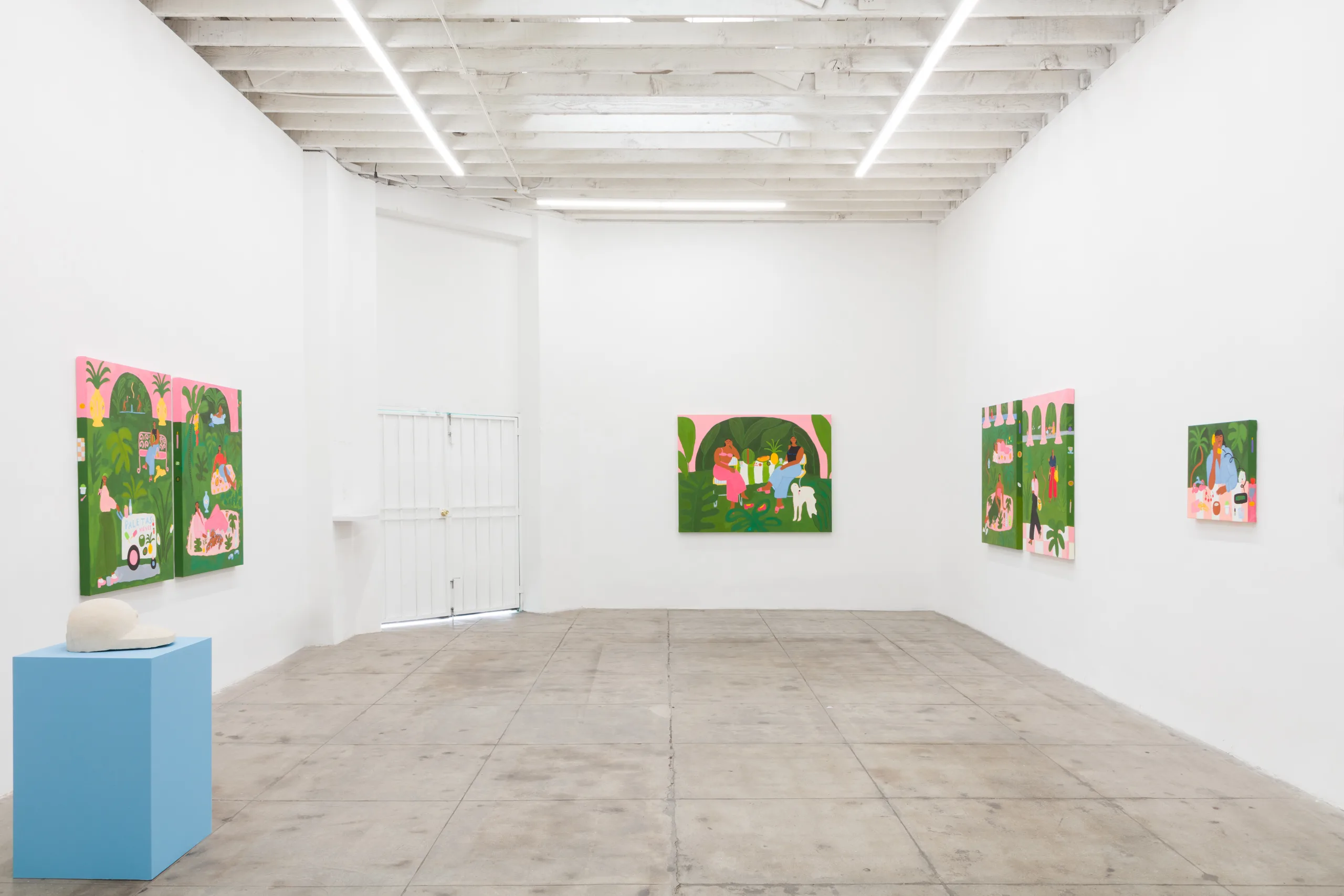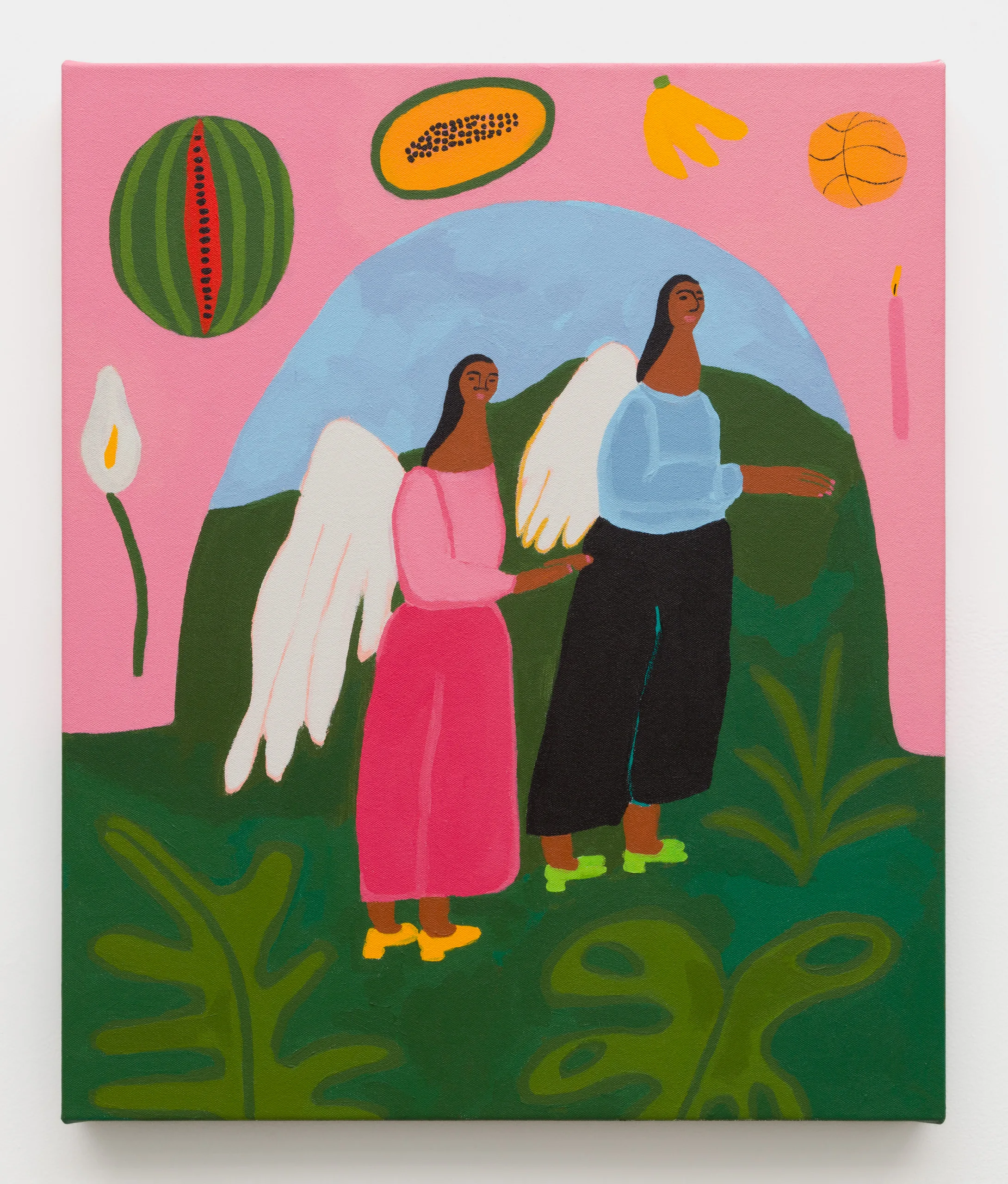 Central to Lilian Martinez’ exhibition are three pairs of paintings that function both as diptychs and also as stand-alone works. They are connected visually and conceptually; one by blue water flowing through life-giving streams, another through an open-air community space that Lilian Martinez describes as an “outdoor third space…a space that requires nothing of you to enter it or to stay,” and the third through concepts of boundless femininity and womanhood. Each vignette offers a quotidian narrative with unexpected details—a glass of carrot juice with lipstick on the rim, calla lilies growing in the park, ripe bananas hanging from a tree, sliced papaya, watermelon, and a pineapple balanced on a large brown and white cow, pink Tabi Mary Janes kicked off in the grass, and a lime nieve with a pink spoon awaiting eating. Embodying a collective desire for brown women to occupy space peacefully, Martinez’ paintings proffer positive representations of bodies like her own as they celebrate inclusivity and classlessness.