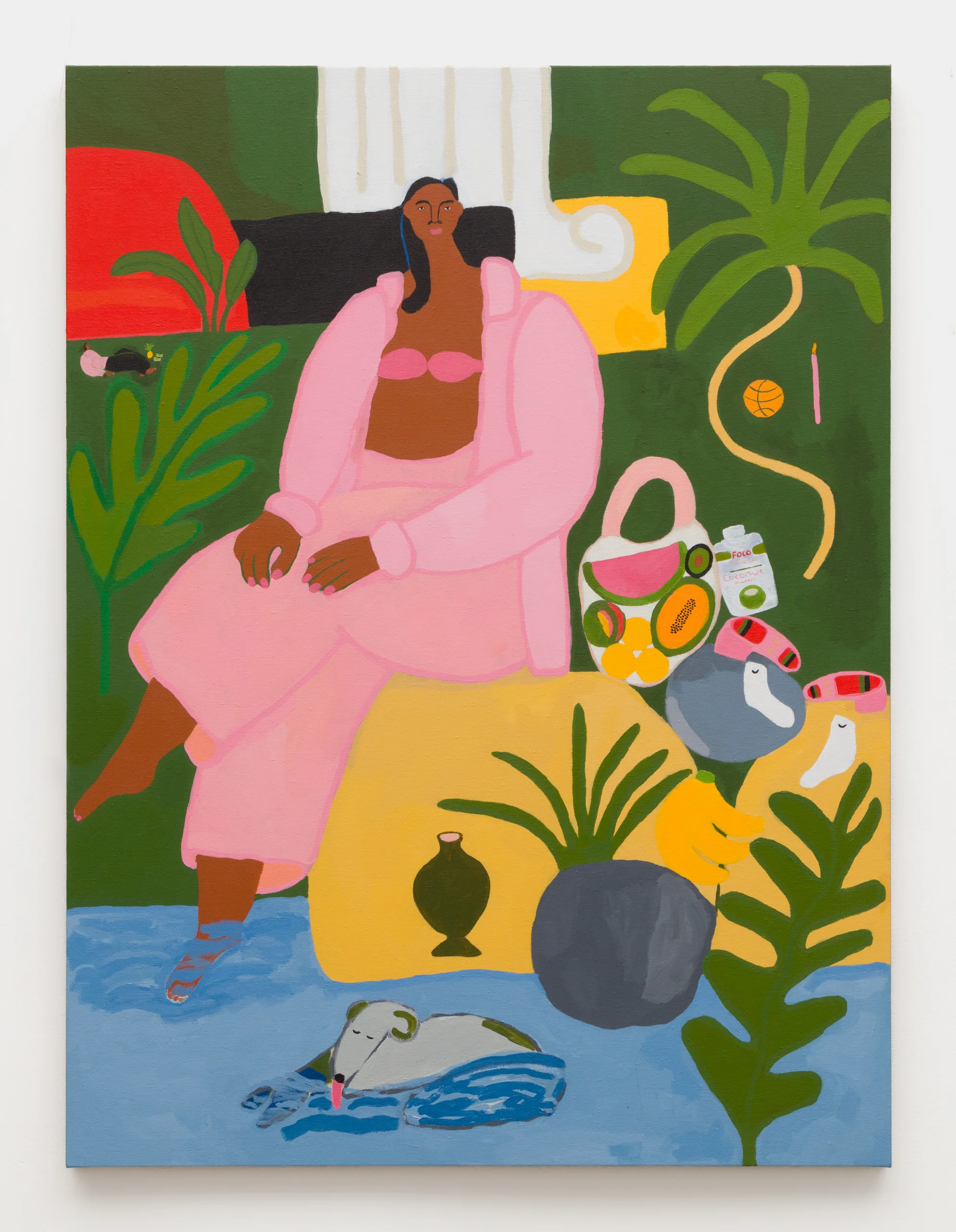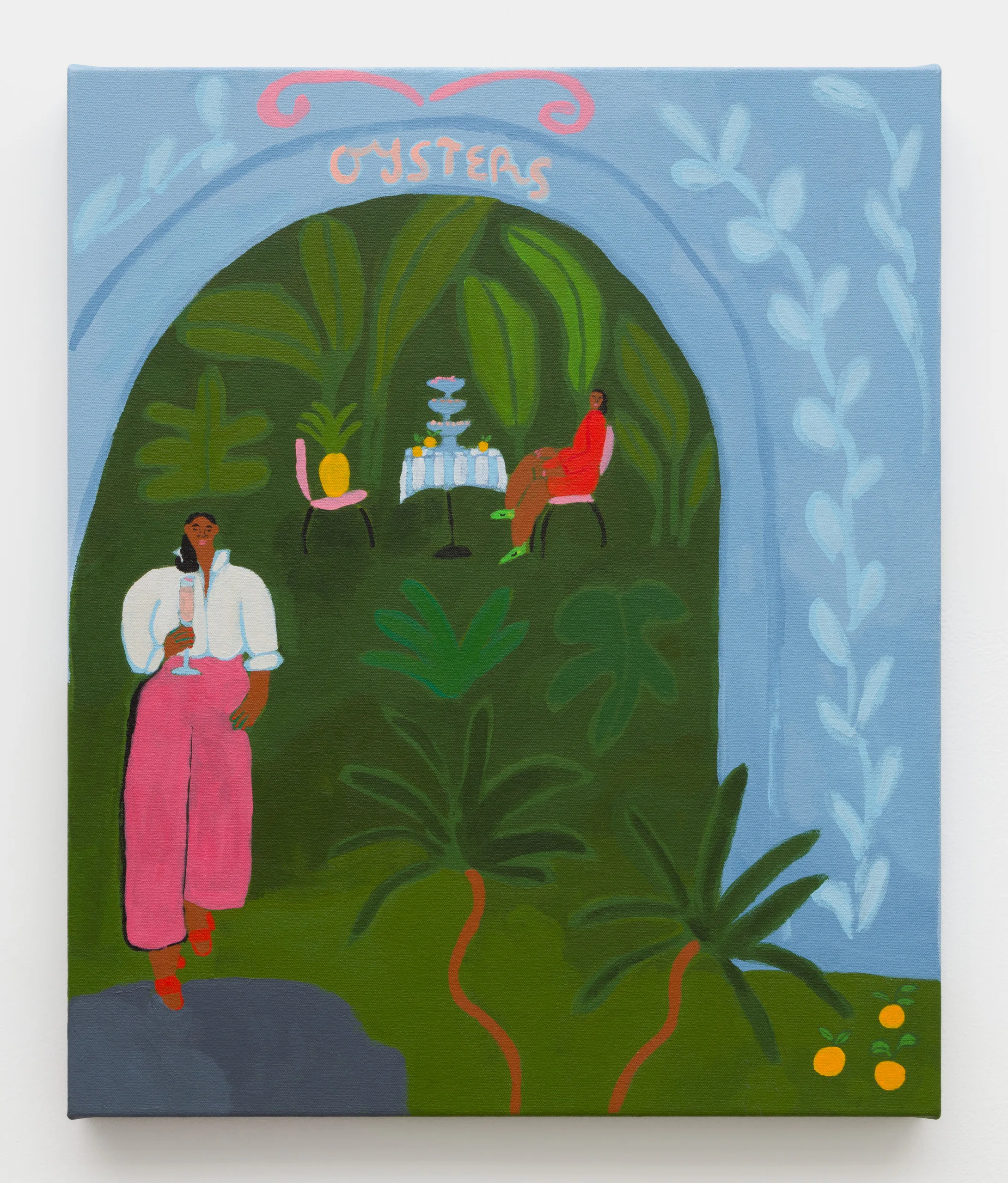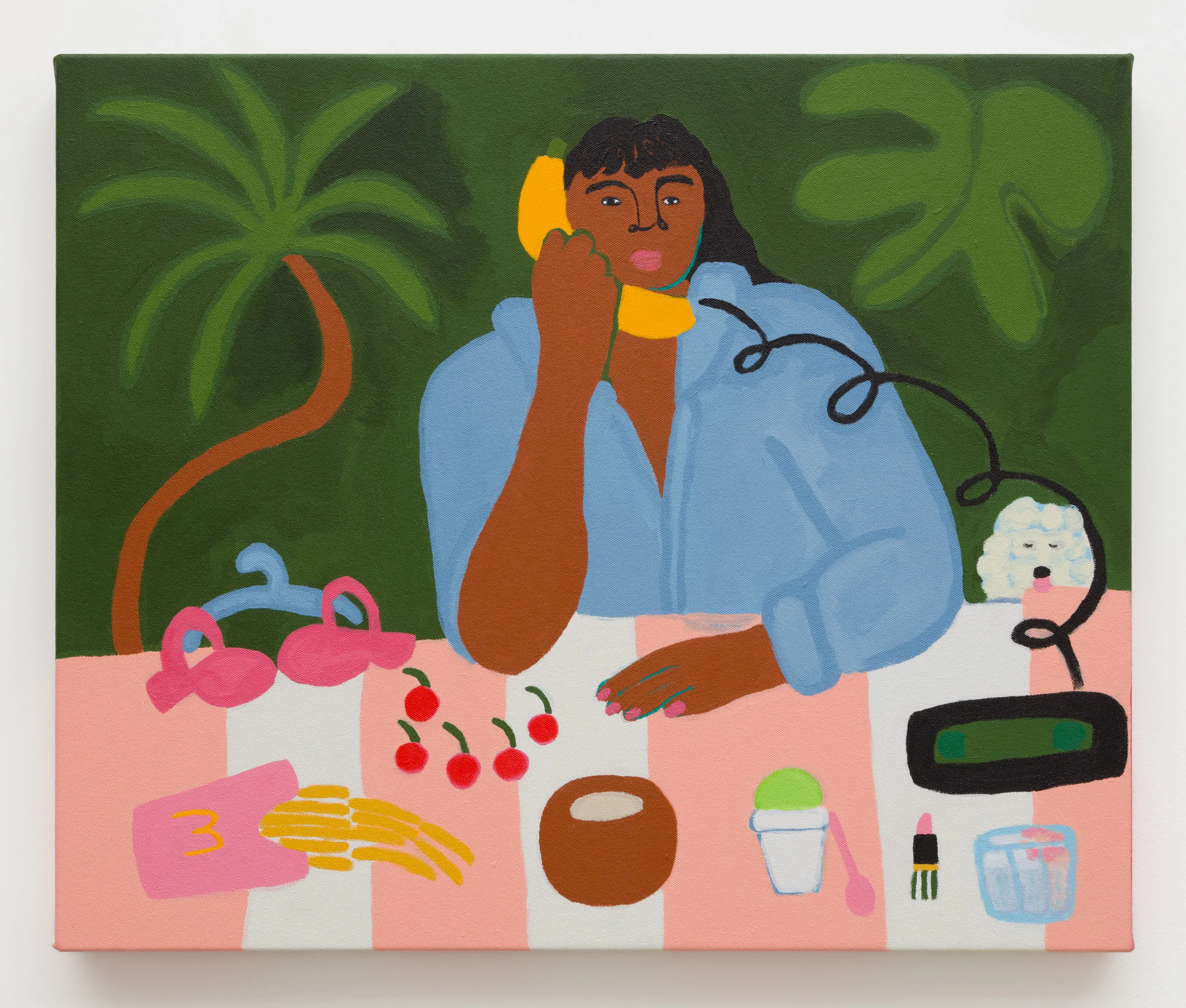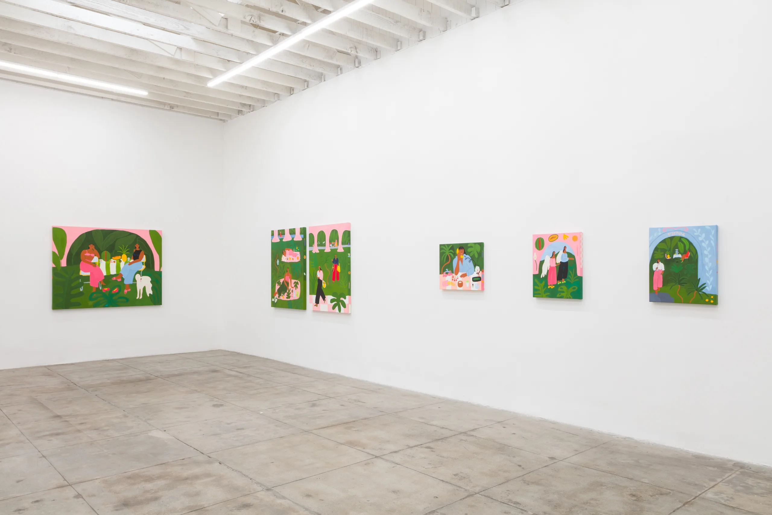 Central to Lilian Martinez’ exhibition are three pairs of paintings that function both as diptychs and also as stand-alone works. They are connected visually and conceptually; one by blue water flowing through life-giving streams, another through an open-air community space that Lilian Martinez describes as an “outdoor third space…a space that requires nothing of you to enter it or to stay,” and the third through concepts of boundless femininity and womanhood. Each vignette offers a quotidian narrative with unexpected details—a glass of carrot juice with lipstick on the rim, calla lilies growing in the park, ripe bananas hanging from a tree, sliced papaya, watermelon, and a pineapple balanced on a large brown and white cow, pink Tabi Mary Janes kicked off in the grass, and a lime nieve with a pink spoon awaiting eating. Embodying a collective desire for brown women to occupy space peacefully, Martinez’ paintings proffer positive representations of bodies like her own as they celebrate inclusivity and classlessness.