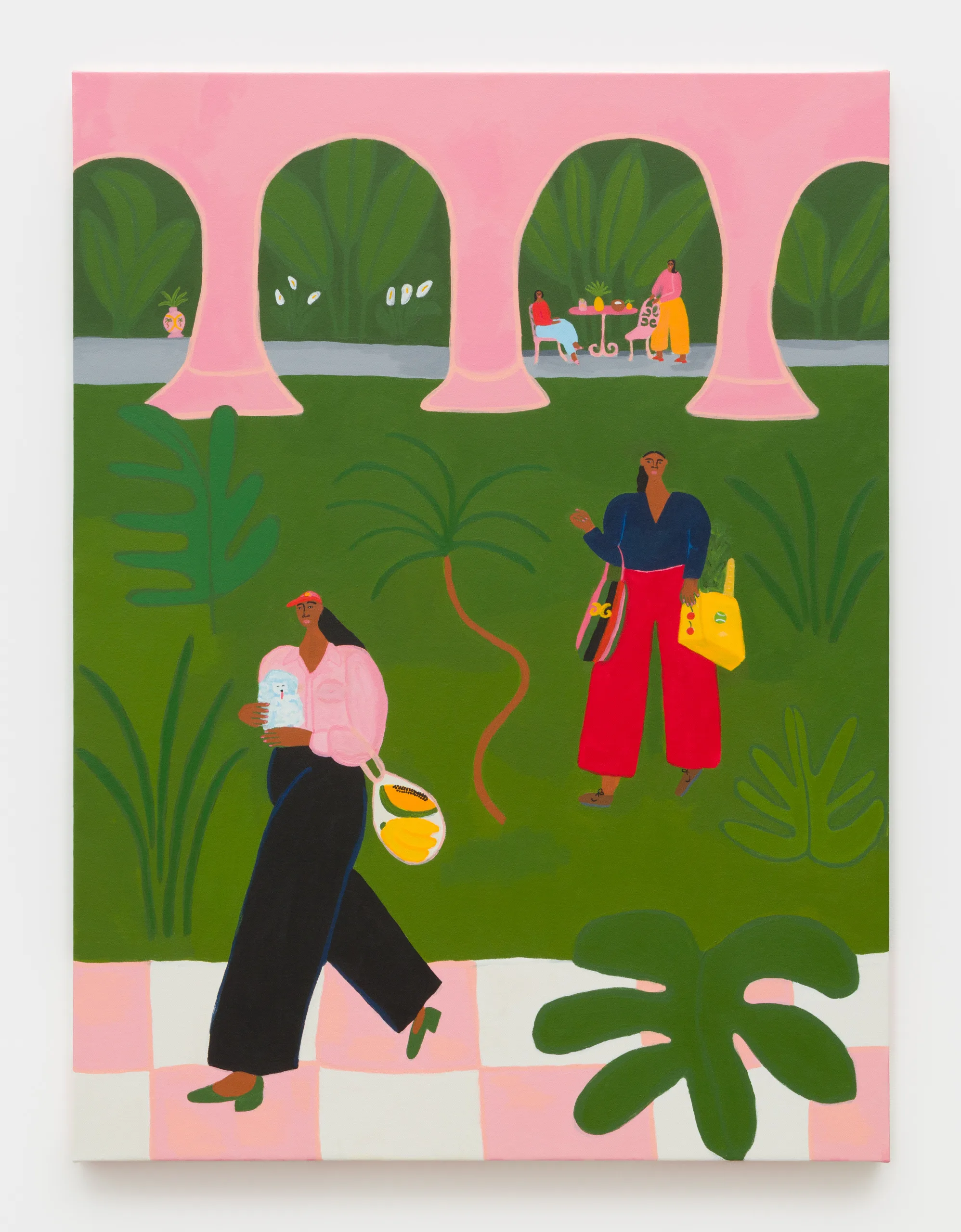 Women & Dogs is comprised of colorful paintings set in open-air gardens and verdant public spaces featuring women who embody what Lilian Martinez refers to as “boundless femininity”—a way of moving through the world with comfort and ease, finding creativity and care in the simplest of acts. Untethered from obligations to others, Martinez’ ladies practice mindful indulgence, follow their intuition, and live their best lives. With generous curves and radiant brown skin, these femme figures visualize their pleasures before manifesting them into reality—they stop at a farmers’ market before picnicking in the park, take their dogs on long riverside walks, make calls on a banana phone, bring water to their partner at an outdoor restaurant, share fruit with their friends barefoot in the garden, and protect each other’s peace.