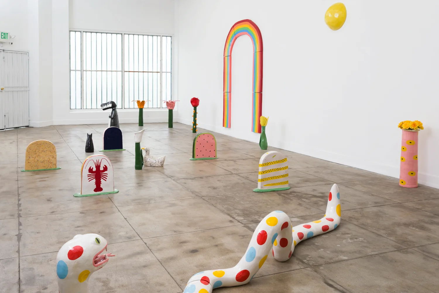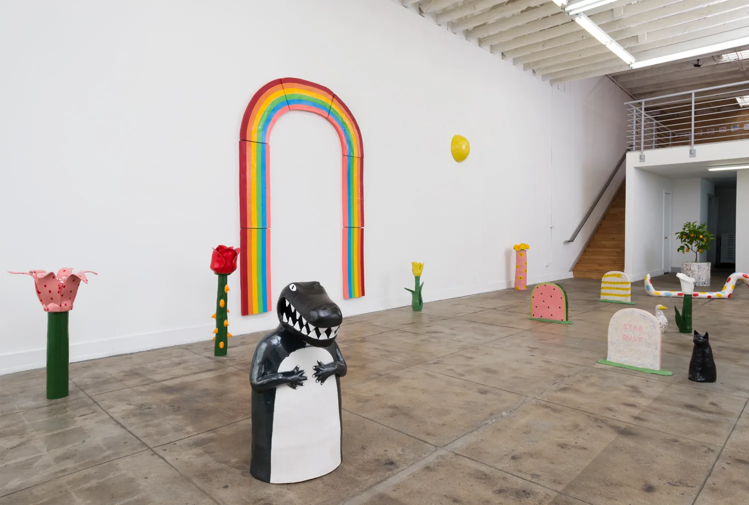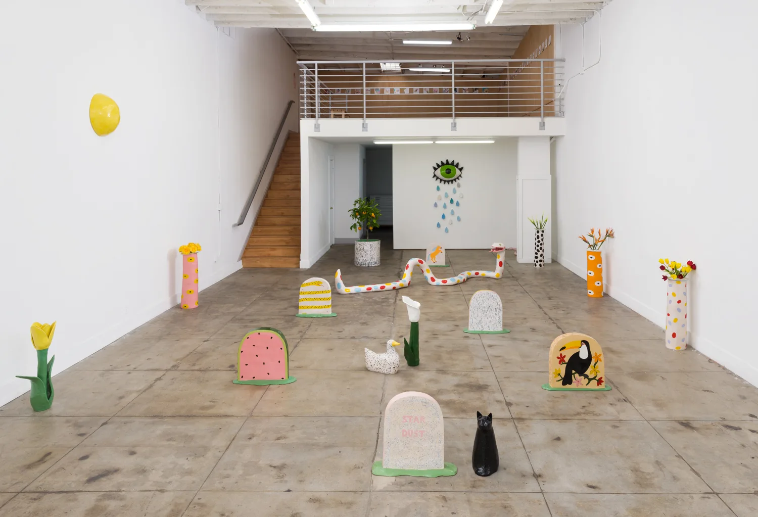 For Stardust, Lorien Stern transforms the gallery into a supernatural graveyard. Her brightly patterned ceramic animal sculptures act as shrines for spirits to incarnate and serve as safeguards—offering soul protection to those passing through Stern’s experiential world. A place meant for great comfort and contentment, the graveyard becomes a vibrant place for celebrating past lives, memory, and rebirth.