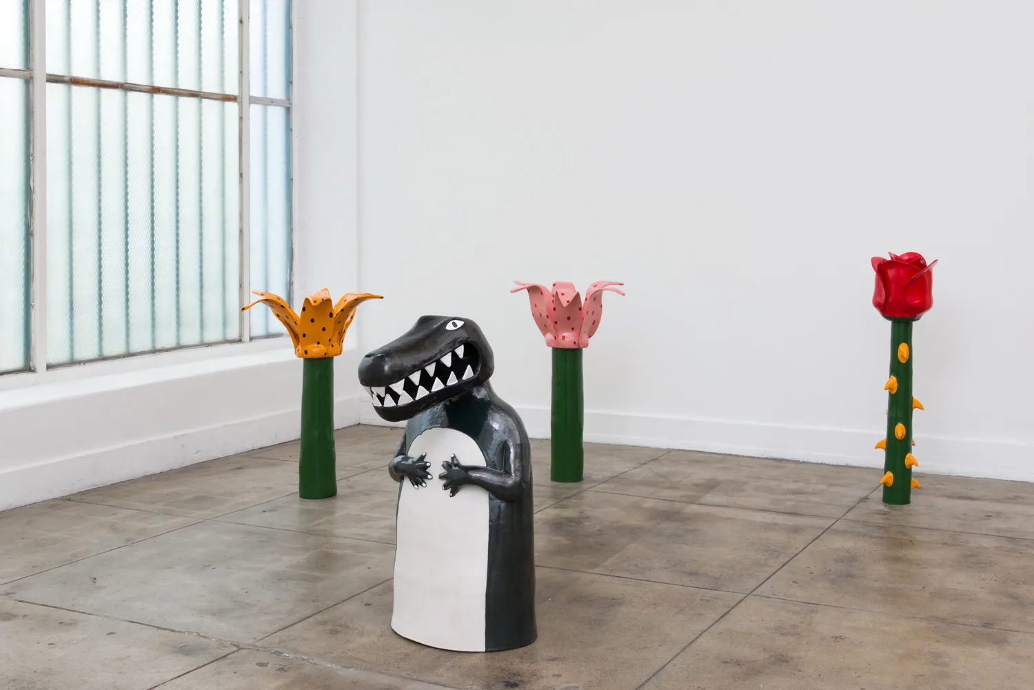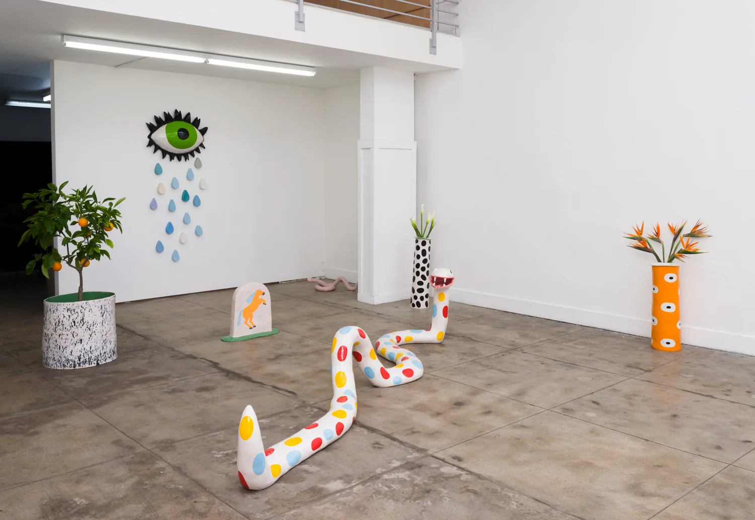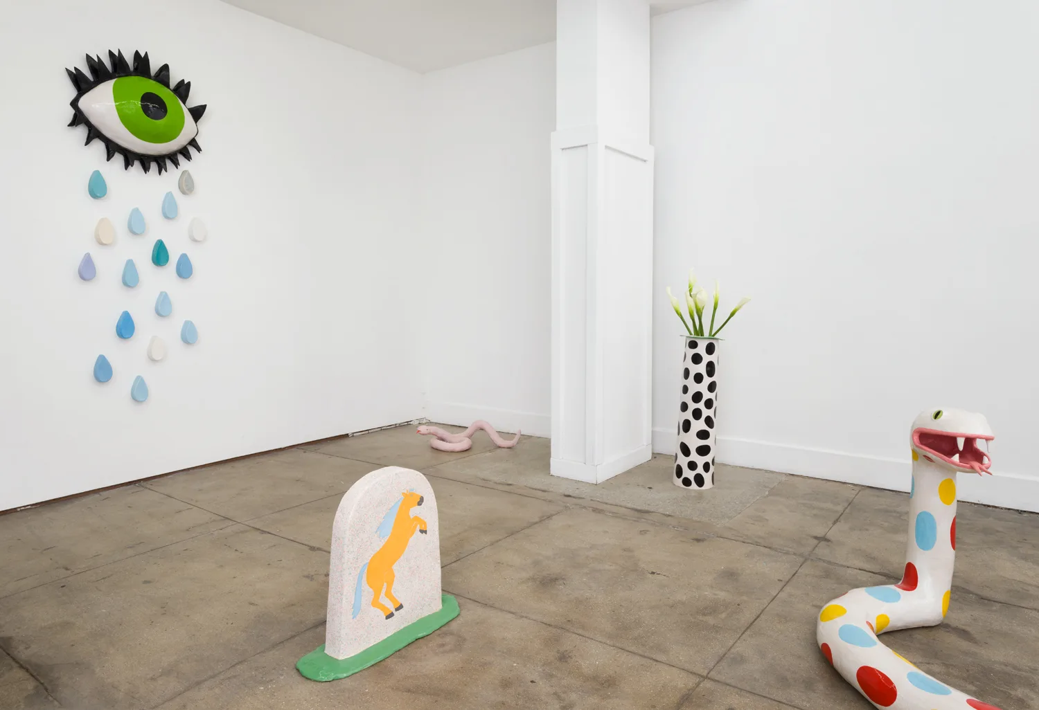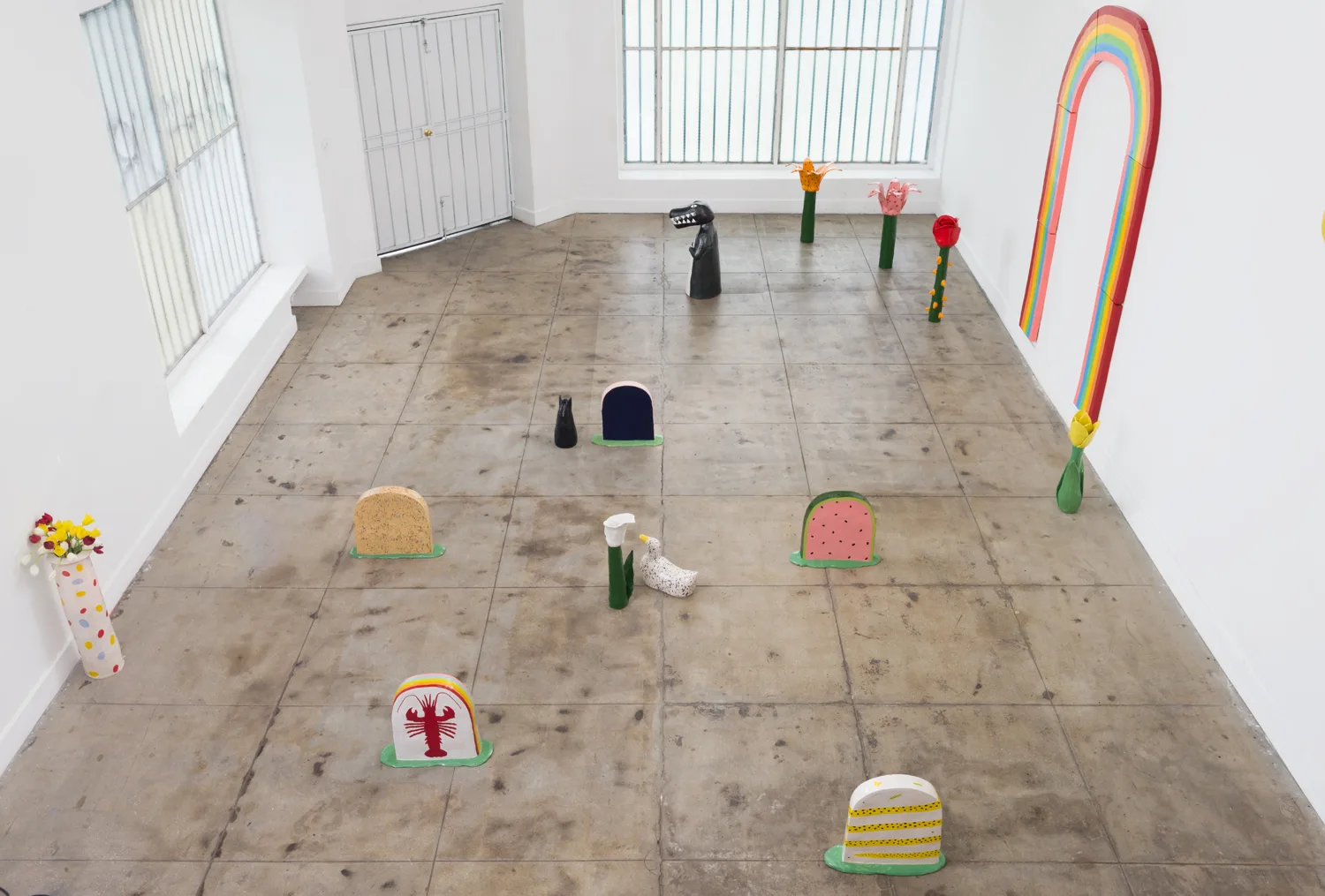 For Stardust, Lorien Stern transforms the gallery into a supernatural graveyard. Her brightly patterned ceramic animal sculptures act as shrines for spirits to incarnate and serve as safeguards—offering soul protection to those passing through Stern’s experiential world. A place meant for great comfort and contentment, the graveyard becomes a vibrant place for celebrating past lives, memory, and rebirth.